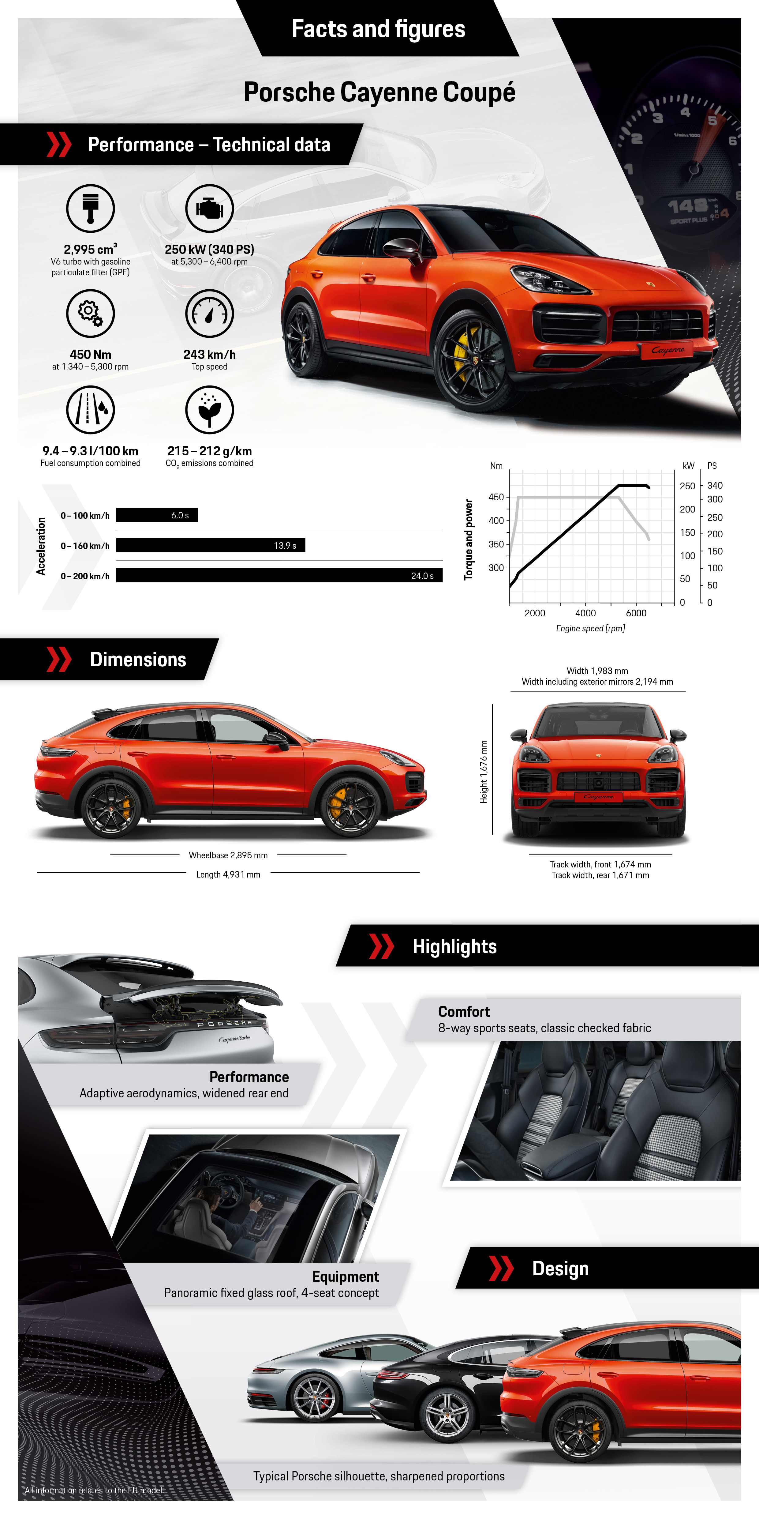 이 밖에도, 속도 감응형 파워 스티어링 플러스, 20인치 알로이 휠, 전·후방 카메라를 장착한 파크 어시스트, 포르쉐 액티브 서스펜션 매니지먼트(PASM), 스포츠 크로노 패키지가 기본 사양으로 장착된다.