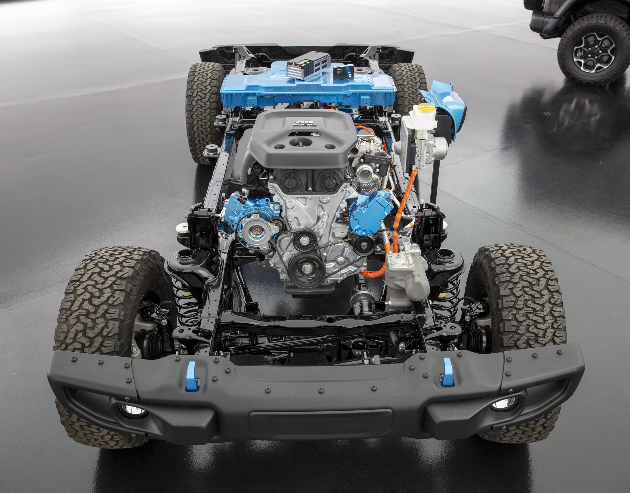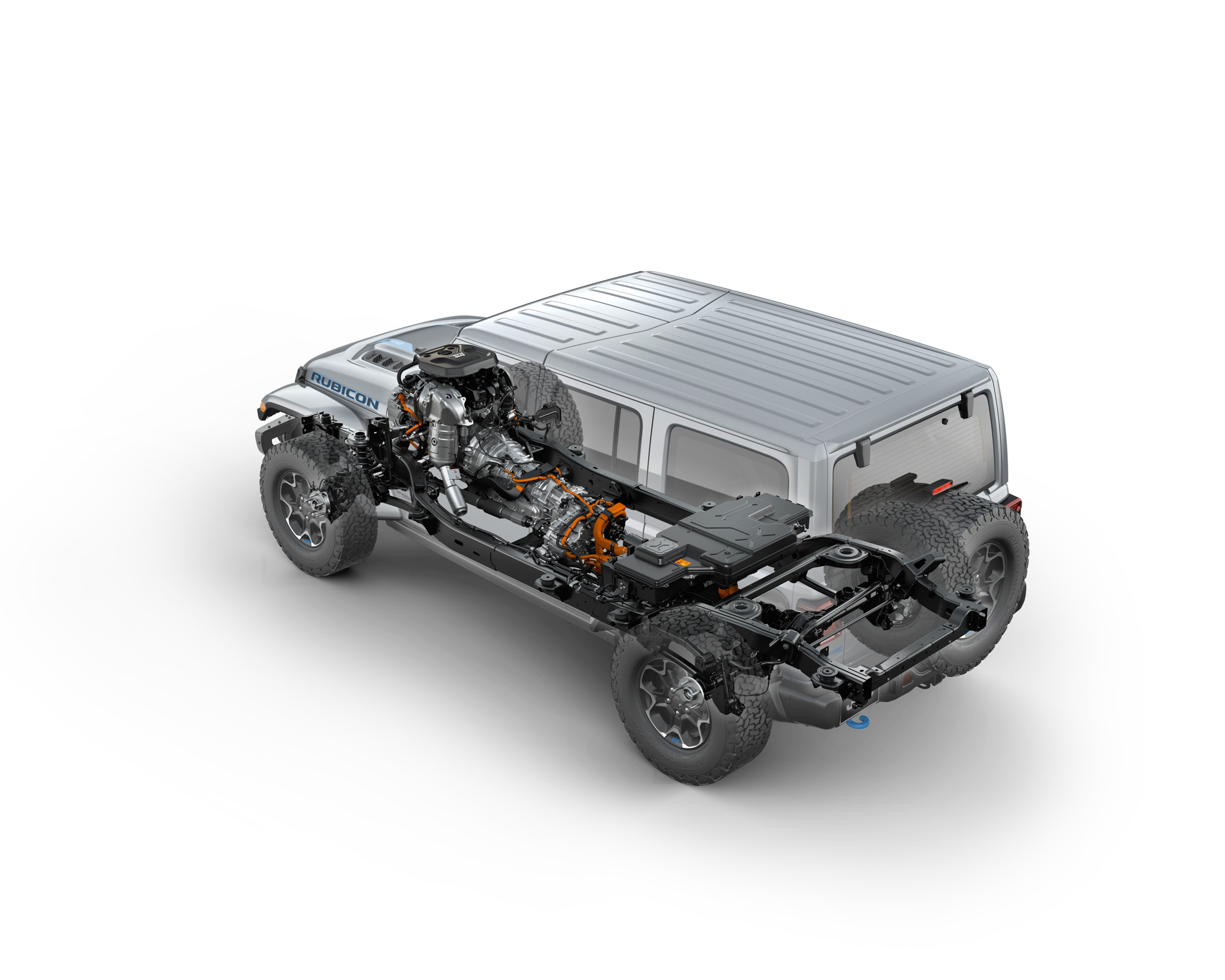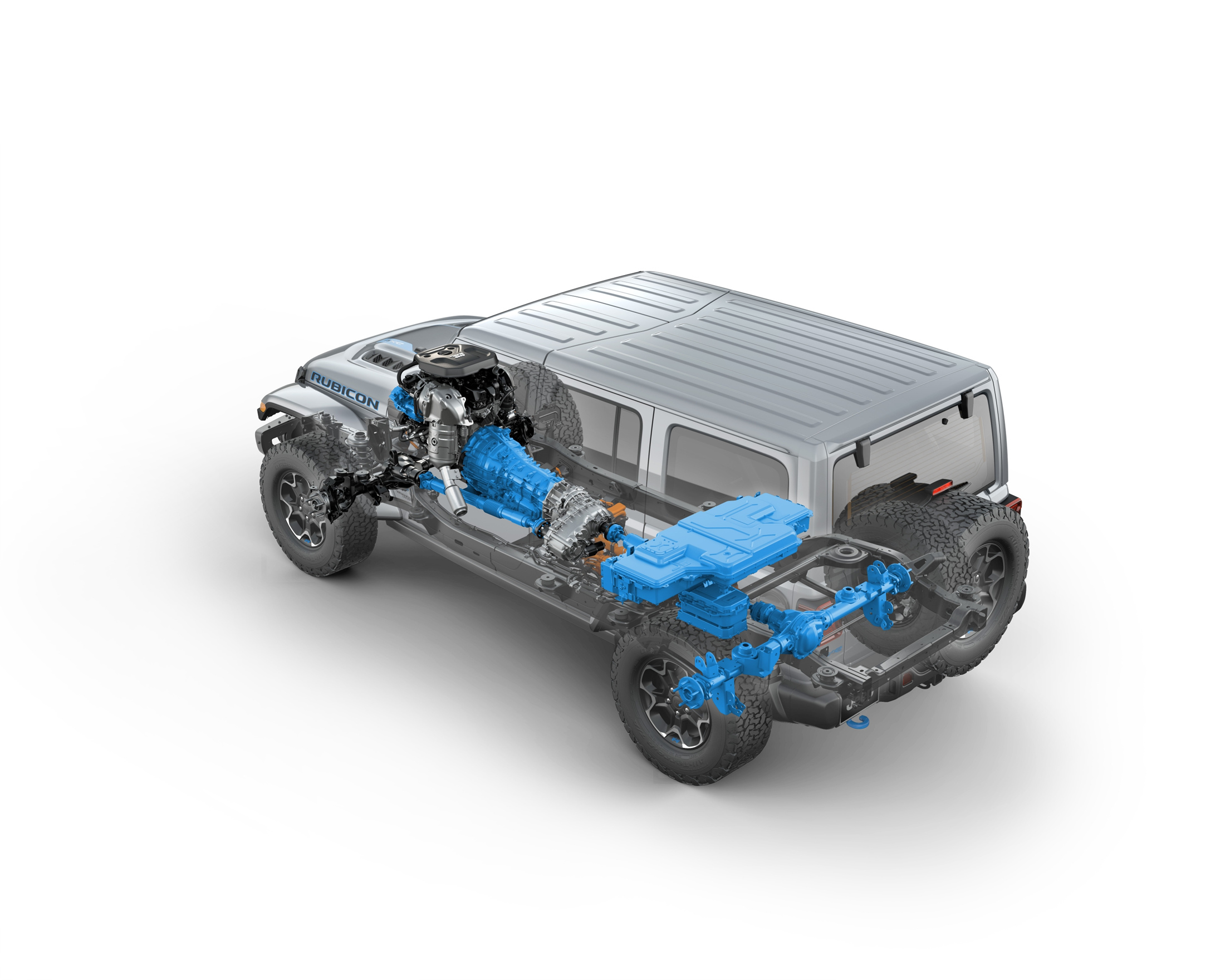 랭글러 4xe의 파워트레인에는 두 개의 전기 모터, 고압 배터리 팩, 첨단 터보차지 2.0리터 직렬 4기통 엔진, 강력한 토크플라이트(TorqueFlite) 8단 자동변속기가 탑재되어 독보적인 온/오프로드 드라이빙 경험을 제공한다. 지프 랭글러용으로 개발된 최첨단 파워트레인은 효율성을 극대화하는 동시에 배터리 소모로 인한 운행 중단의 불안을 해소해준다.