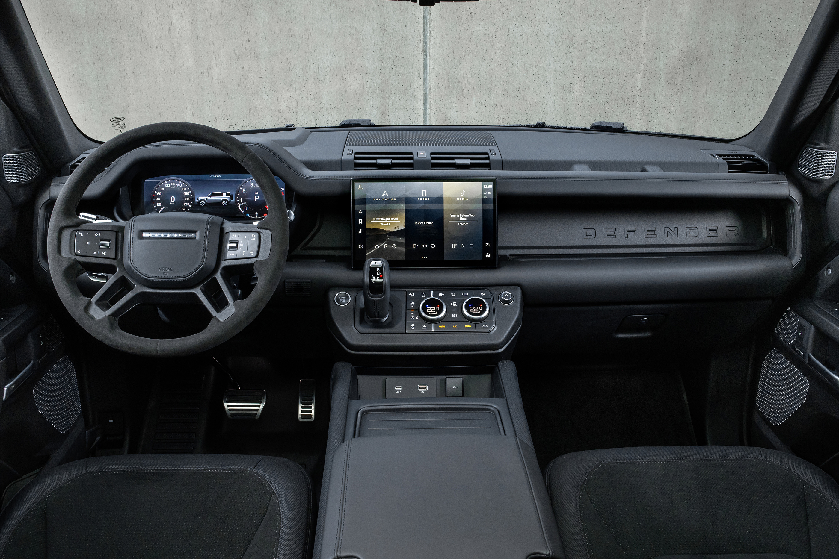 Defender V8은 Dinamica® 스웨이드 클로스와 Rustec 악센트가 있는 독특한 Ebony Windsor Leather로 시트를 다듬은 것이 특징이며, Defender의 노출된 크로스 카 빔은 특별한 새틴 블랙 마감 처리 기능을 갖추고 있습니다. 4스포크 스티어링 휠은 V8 모델 특유의 알칸타라 림과 촉각 새틴 크롬 기어 변속 패들에 의해 개선되었습니다. 가죽은 에어백 하우징 및 기어 레버를 덮고, 조명이 들어오는 발판은 V8 스크립트로 완성됩니다.
