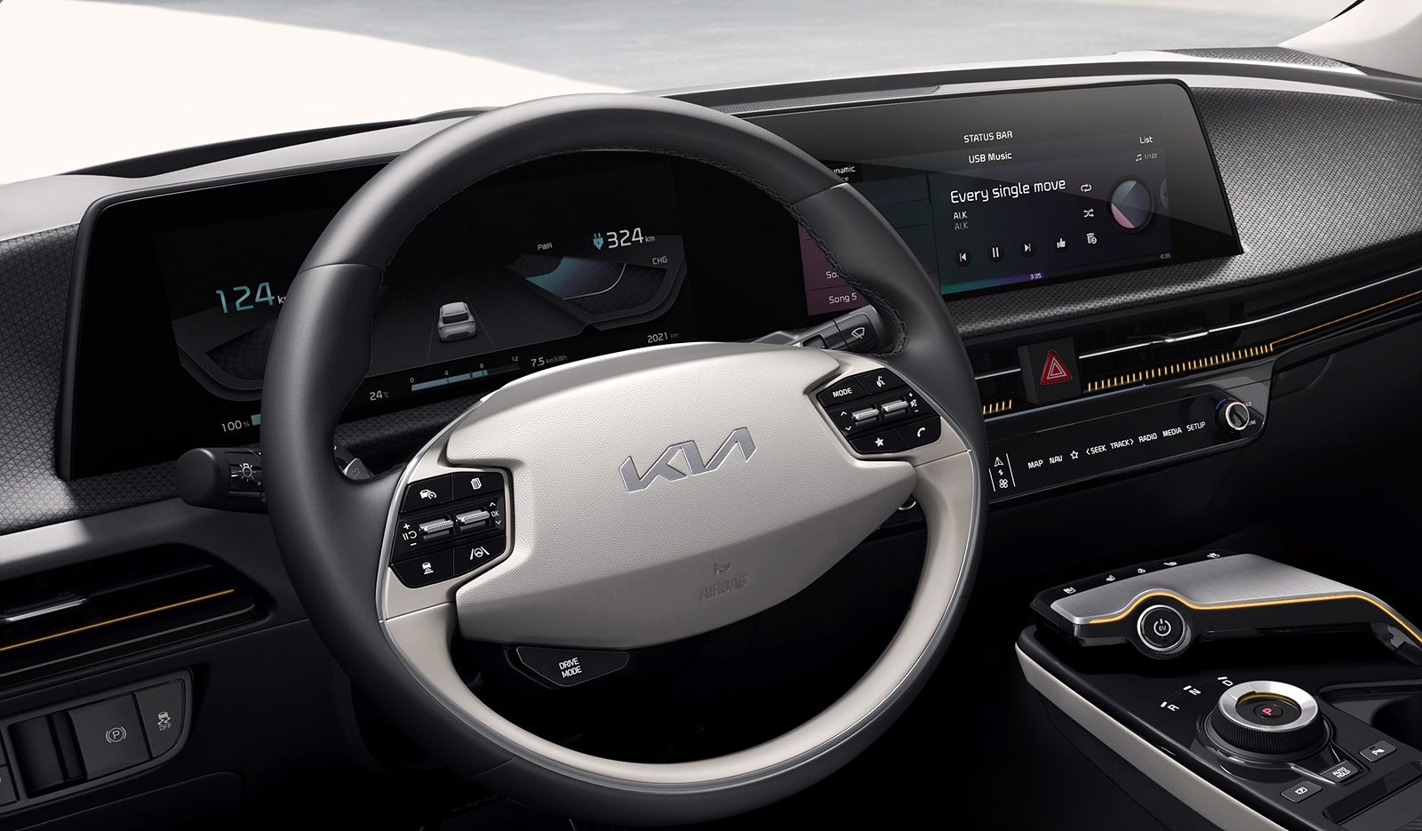 EV6의 내장 디자인 중 가장 먼저 눈에 들어오는 것은 전면부를 매끄럽게 감싸듯 자리한 파노라믹 커브드 디스플레이다. 넓게 펼쳐진 화면과 슬림하게 자리한 대시보드는 시각적 확장감을 극대화하면서도 차량의 내부를 더욱 넓어 보이게 한다.