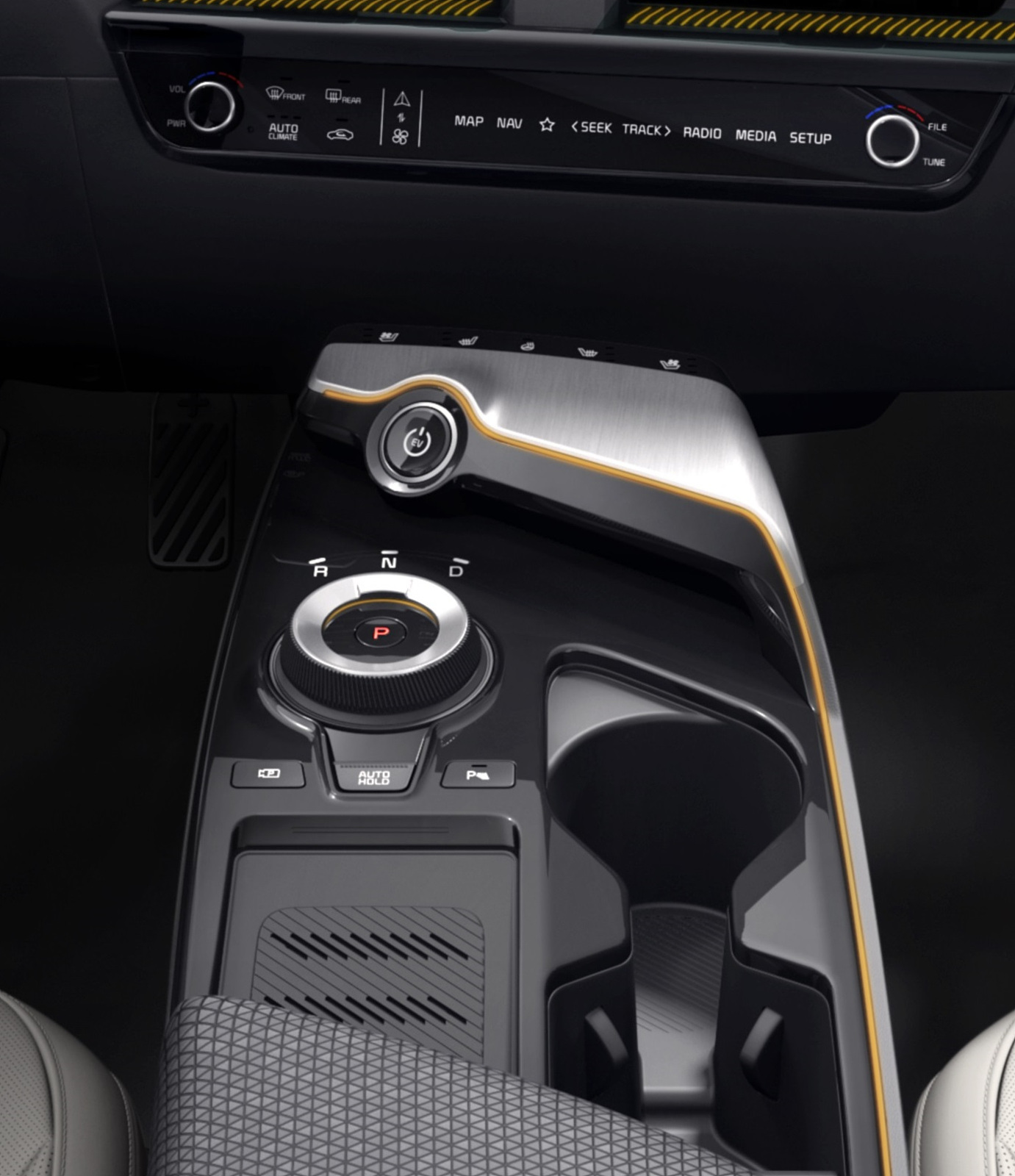 인포테인먼트/공조 전환 조작계는 가운데 쪽에 위치한 버튼으로 두 시스템을 전환할 수 있다. 미디어 음량과 실내 온도 등 주행 중 직관적으로 조작이 필요한 버튼 외에 모든 버튼을 터치 방식으로 적용, 실내 중앙부 공간을 최소화하고 최신형 전자 기기와 같은 혁신적인 이미지를 구현했다.