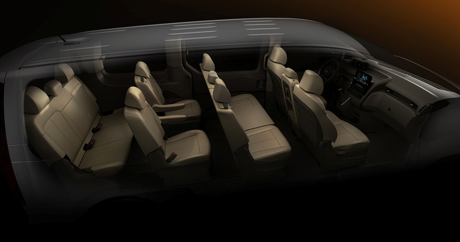 스타리아는 높은 전고(1,990mm)와 긴 전폭(1,995mm) 및 전장(5,255mm)으로 넉넉한 실내 공간을 확보했다.