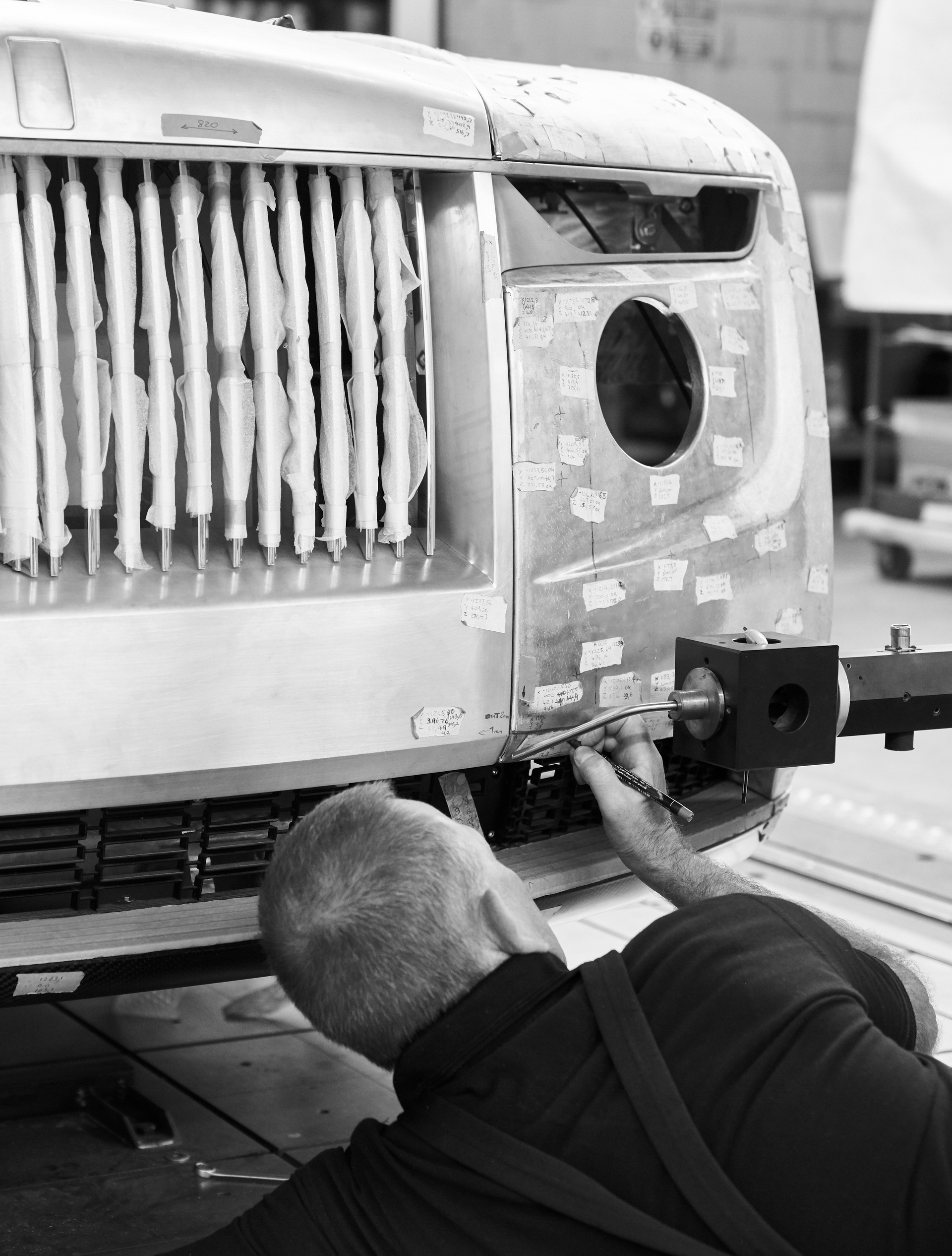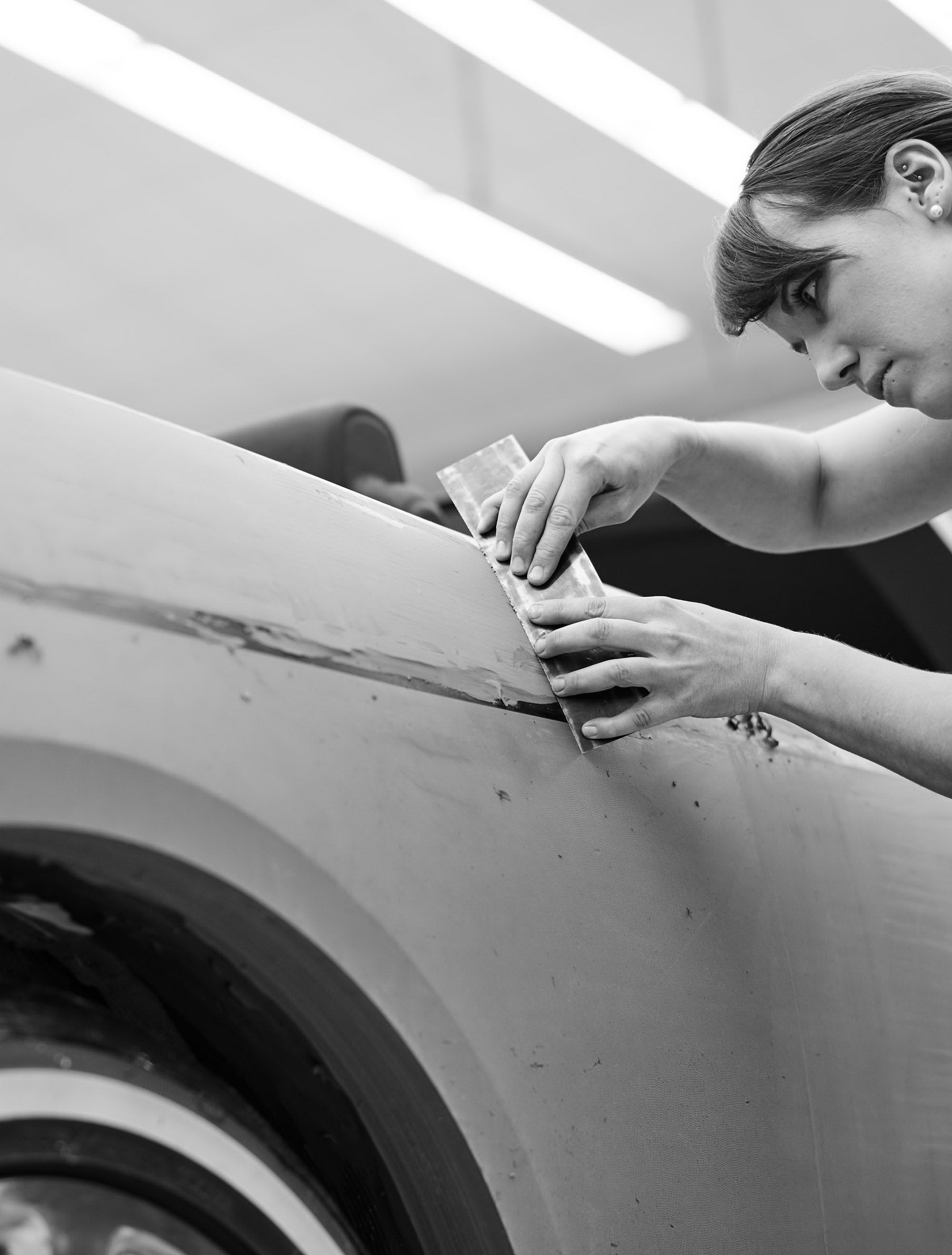 외관은 의뢰 고객이 가장 좋아하는 색상인 파란색을 풍부하고 복합적인 톤으로 구성해 적용했다. '배'를 연상시키는 색조는 그림자 속에서는 은은한 빛을 띠며, 태양빛 아래에서는 페인트에 혼합된 금속성 크리스털 가루들이 빛나면서 활기차고 에너지 넘치는 분위기를 연출한다. 외장 페인트가 완전히 마르기 전 바디 라인을 손가락으로 훑어 내 모서리 부분과 도색을 가장 부드러운 방식으로 처리한 것도 특징이다. 휠은 밝은 파란색을 채택하고 고광택 작업 및 클리어 코팅 과정을 거쳐 보트 테일만의 특성을 더욱 강조했다.