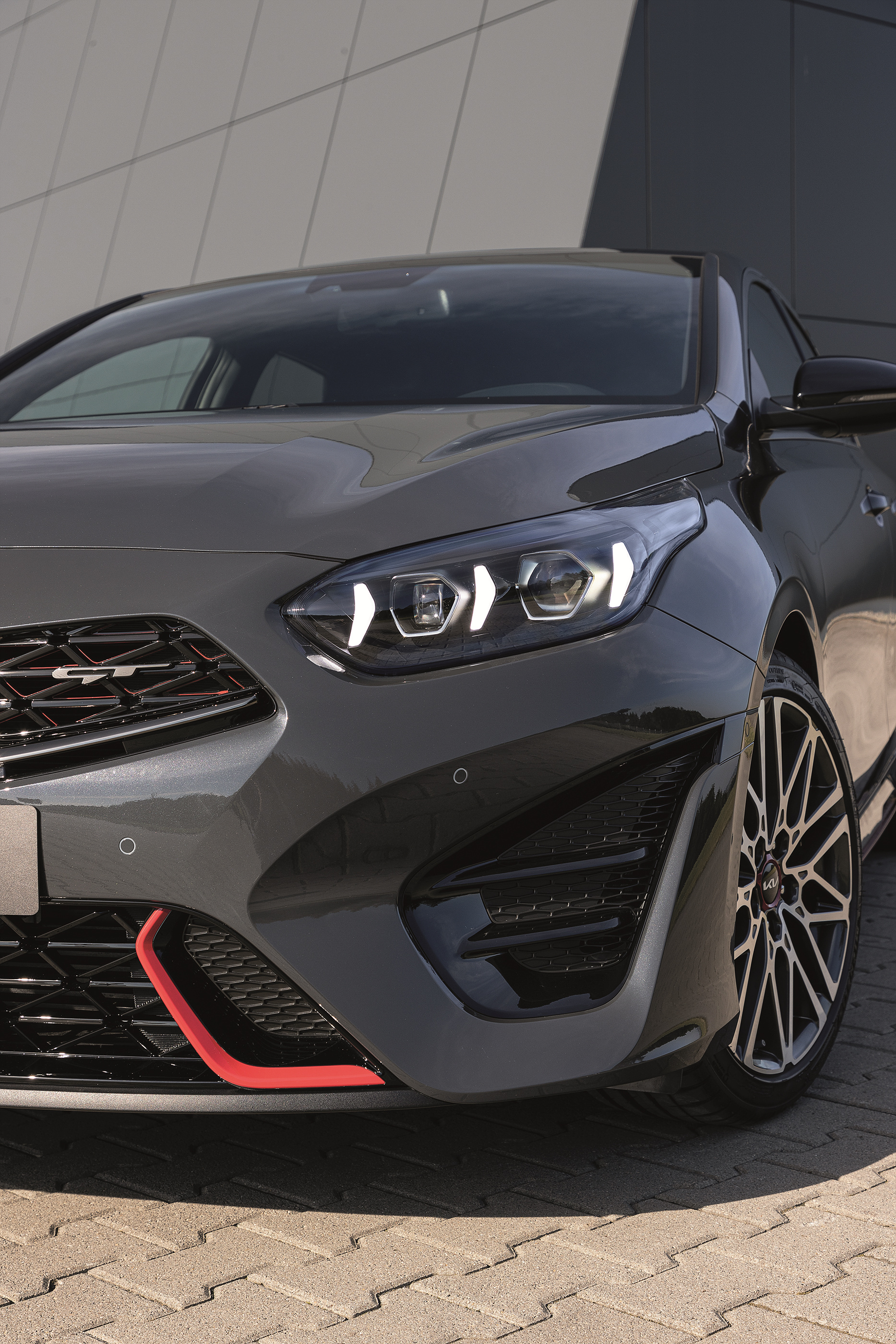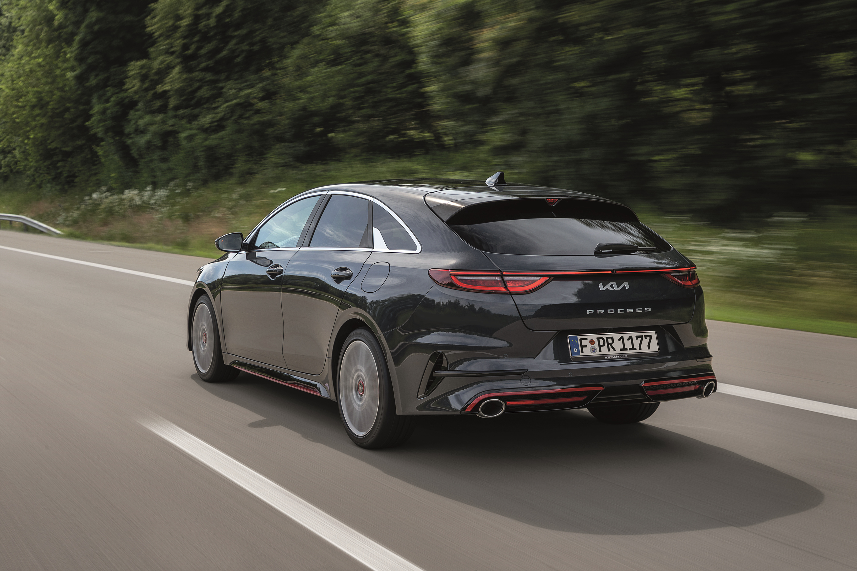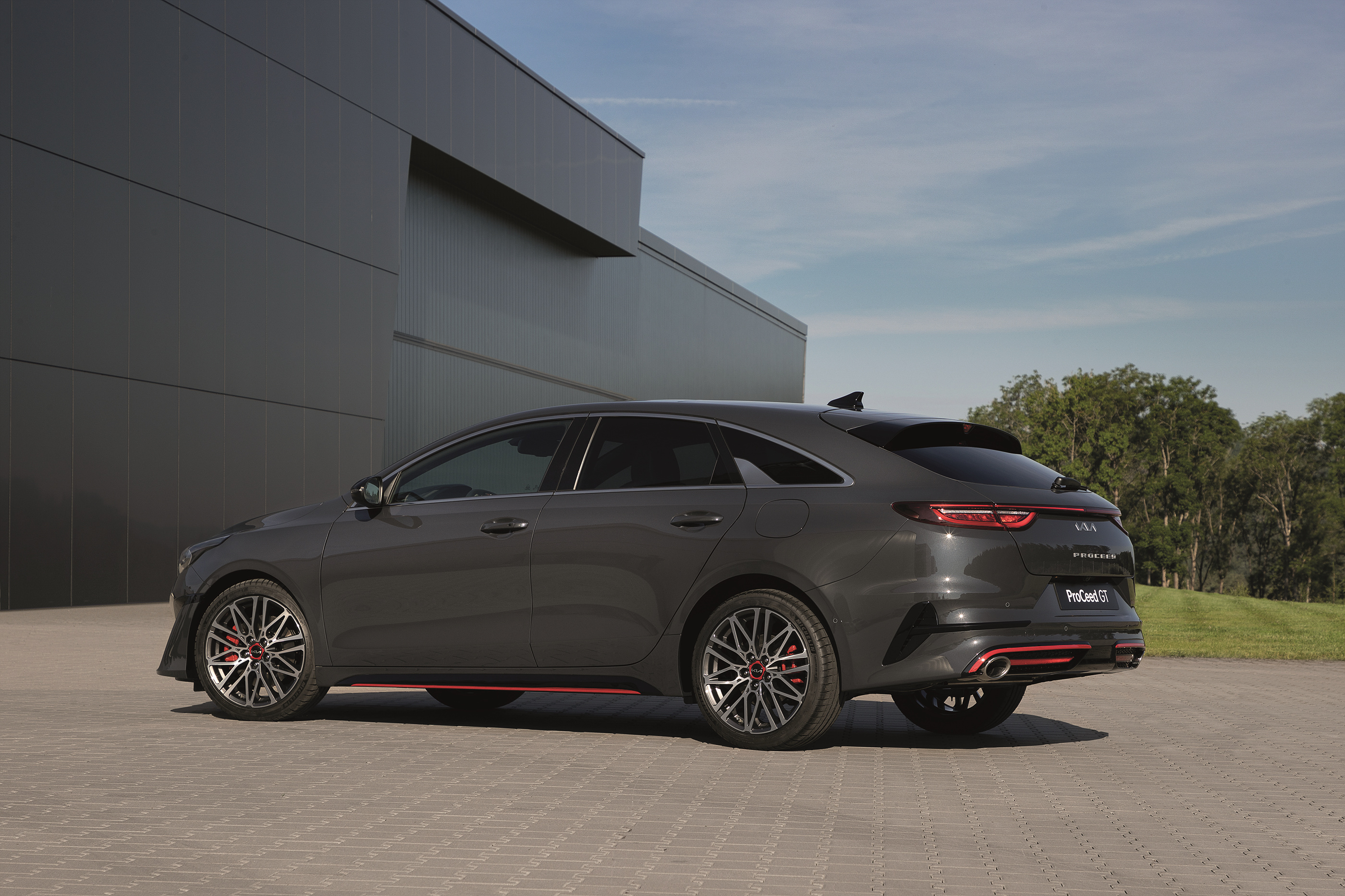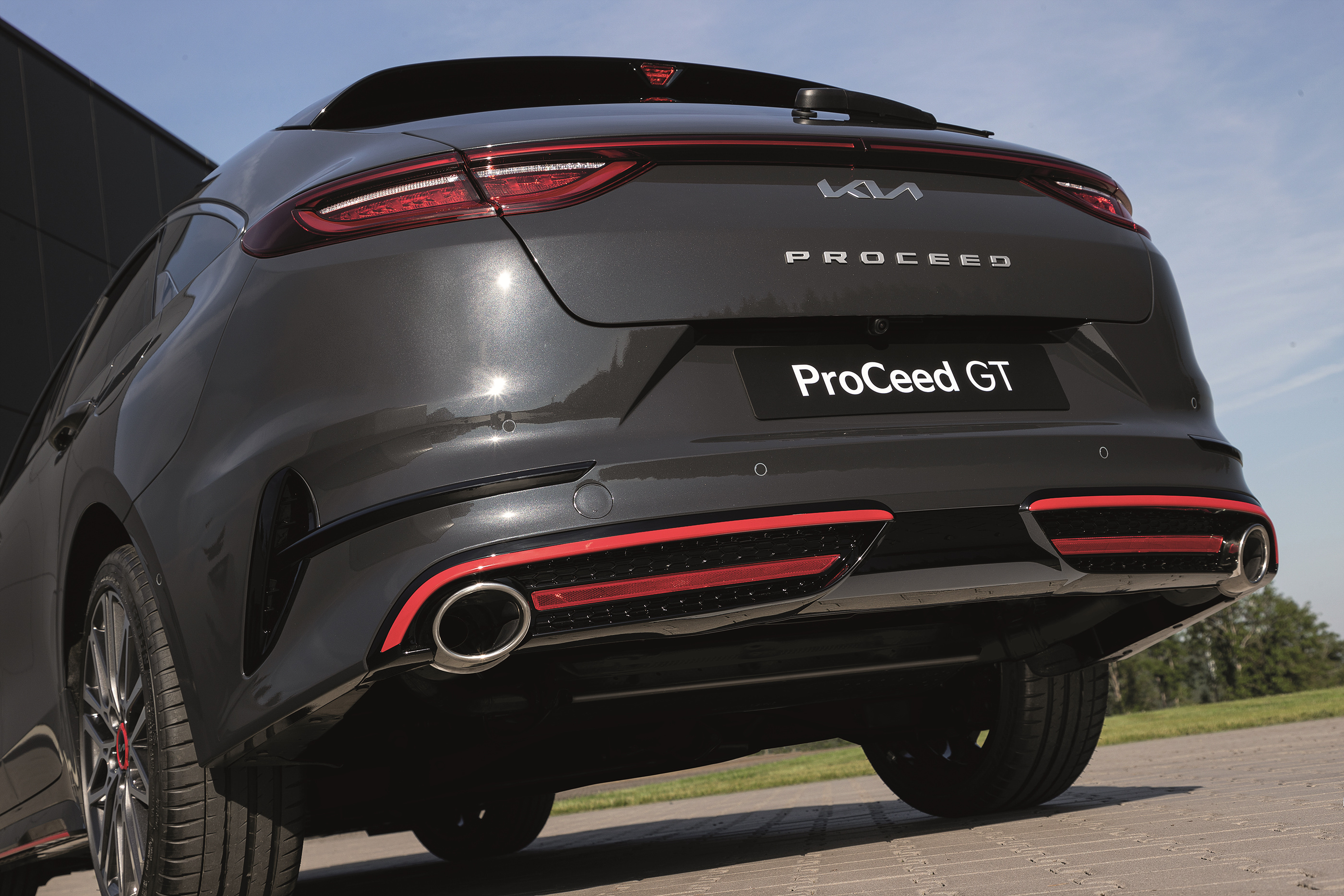 The ProCeed GT will turn heads thanks to bespoke design upgrades, including vibrant red accents at the front, side and rear to highlight the car's sporting prowess. The signature tiger-nose grille on this range-topping model is formed from two-shot injection moulding to create a distinctive glossy black and red finish with dark chrome upper and lower trim. To the front, the GT's bumper displays a glossy black air intake grille with a specially developed 'GT red' trim at each end of the air intake grille. The sporty rear diffuser is accented by round dual exhaust tips and the distinctive new red trim. The GT now sits proudly on 18-inch dark metal alloys in a dedicated GT design with unique red wheel caps.
