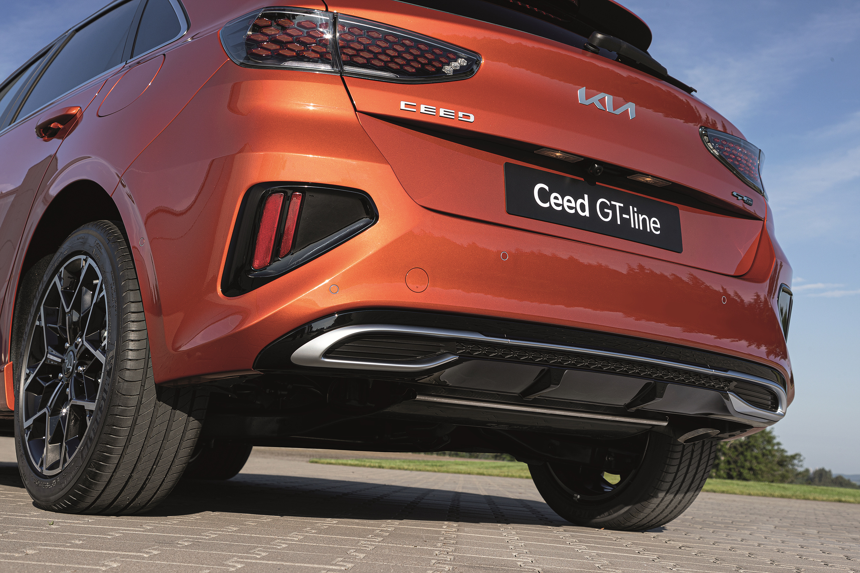 The iconic tiger-nose grille, which makes the Ceed a recognisable Kia, is upgraded to a black gloss finish with satin chrome upper and lower wing-shaped garnish for a sleek and modern appearance. To the sides, two large side air intakes shoot through the front bumper creating the sportier look. The ‘wing’ inspired theme repeats in other elements of the front redesign, such as the satin chrome trim on the lower air intake grille and the sweeping side garnish which extends into the front wheel arch. On the rear, to highlight the simplicity of the new Kia badge, the surface between the LED combi lamps has been smoothed out to accommodate the sleek new brand emblem. A new glossy black diffuser is added to the sporty rear bumper, which also echoes the satin chrome finish seen at the front of the car.