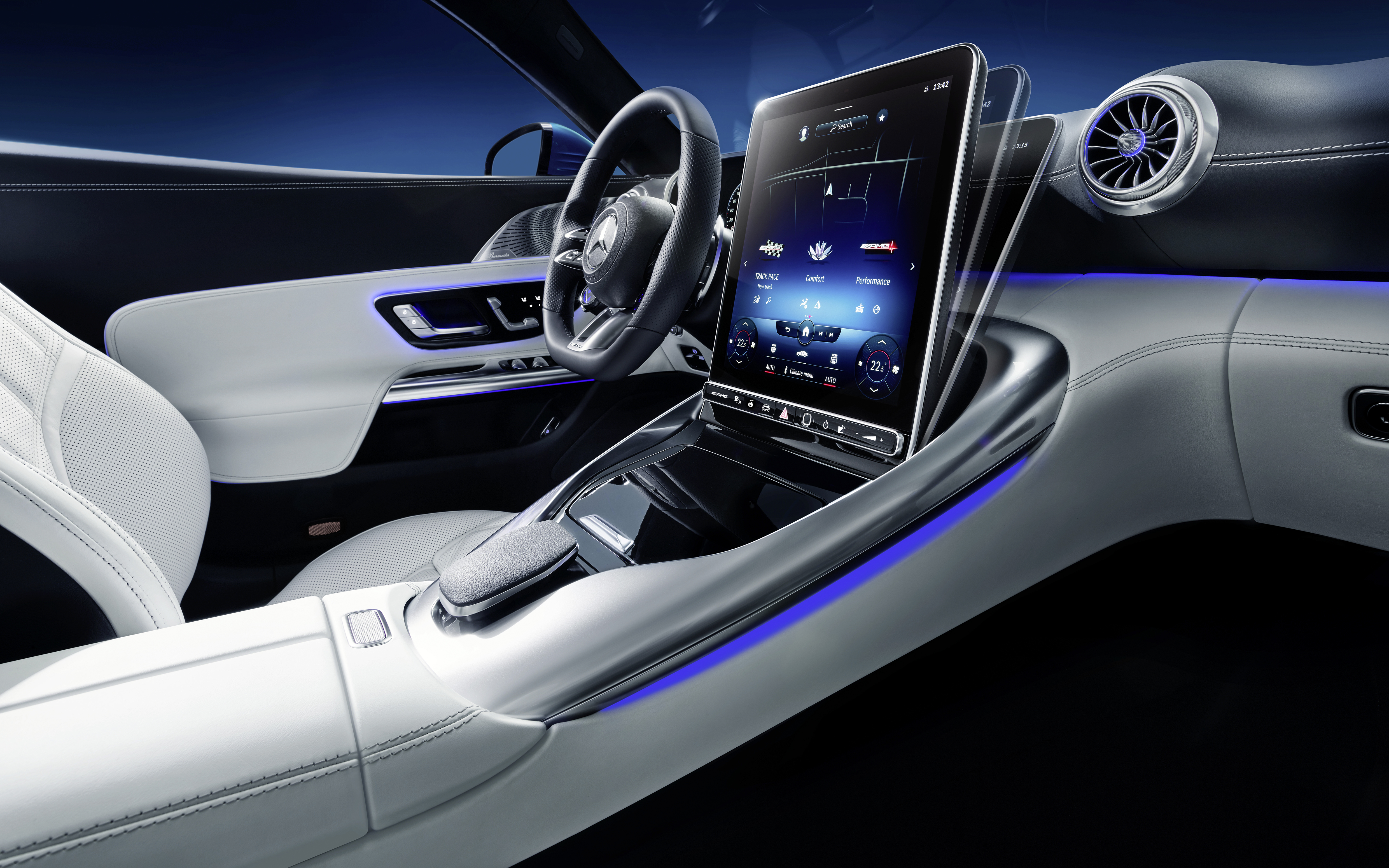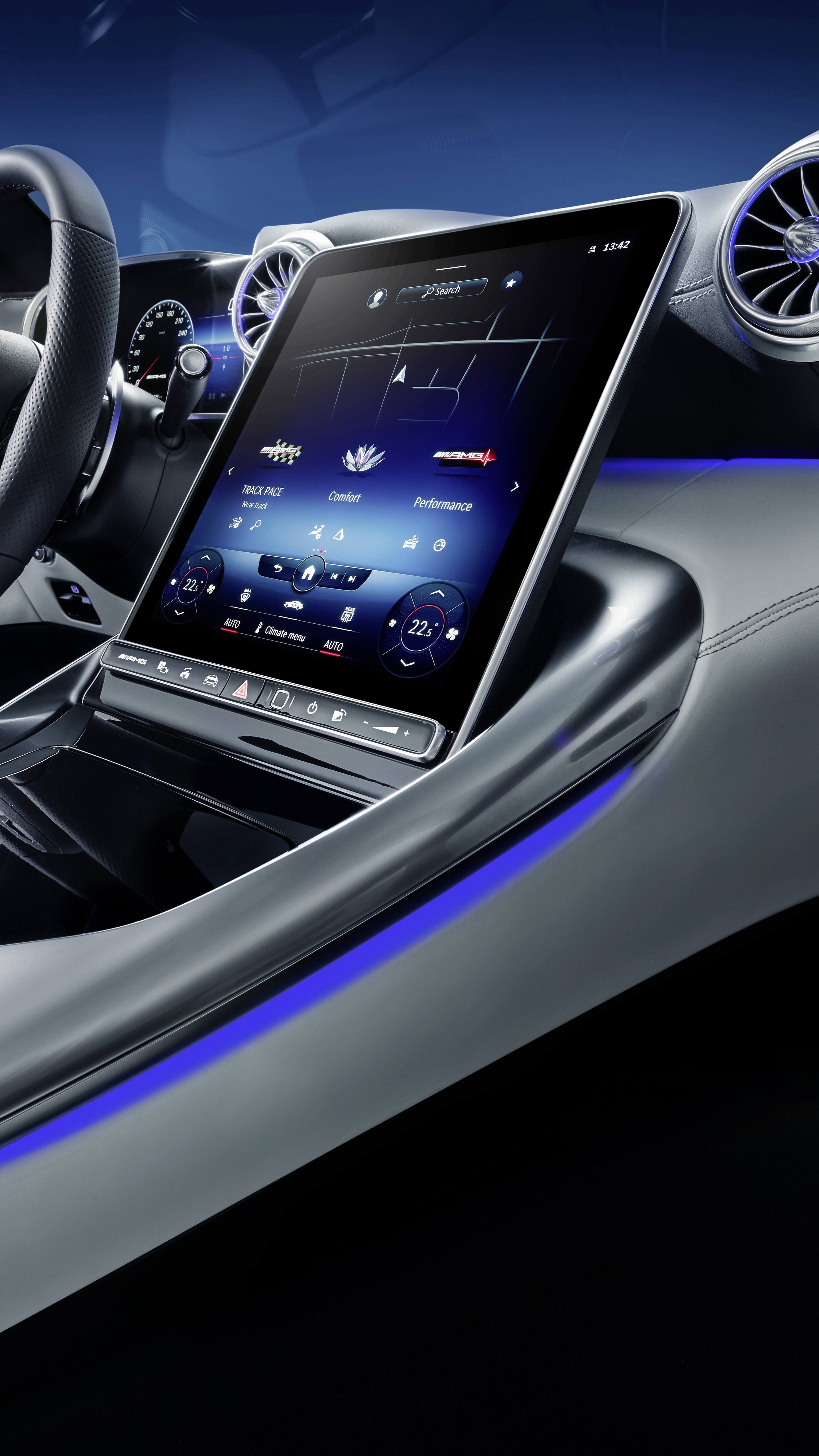 The operating structure and some key functions of this second-generation MBUX system correspond to those found in the latest S-Class. They have been extensively supplemented or replaced in some instances by AMG- specific content and views. This makes the new SL highly independent in terms of communication and information. Menu items such as "Performance" or "Track Pace" emphasize the sporty character. The interior has become even more digital and intelligent, as hardware and software have been extensively enhanced. Brilliant images on the LCD screens make it easy to control vehicle and comfort functions.