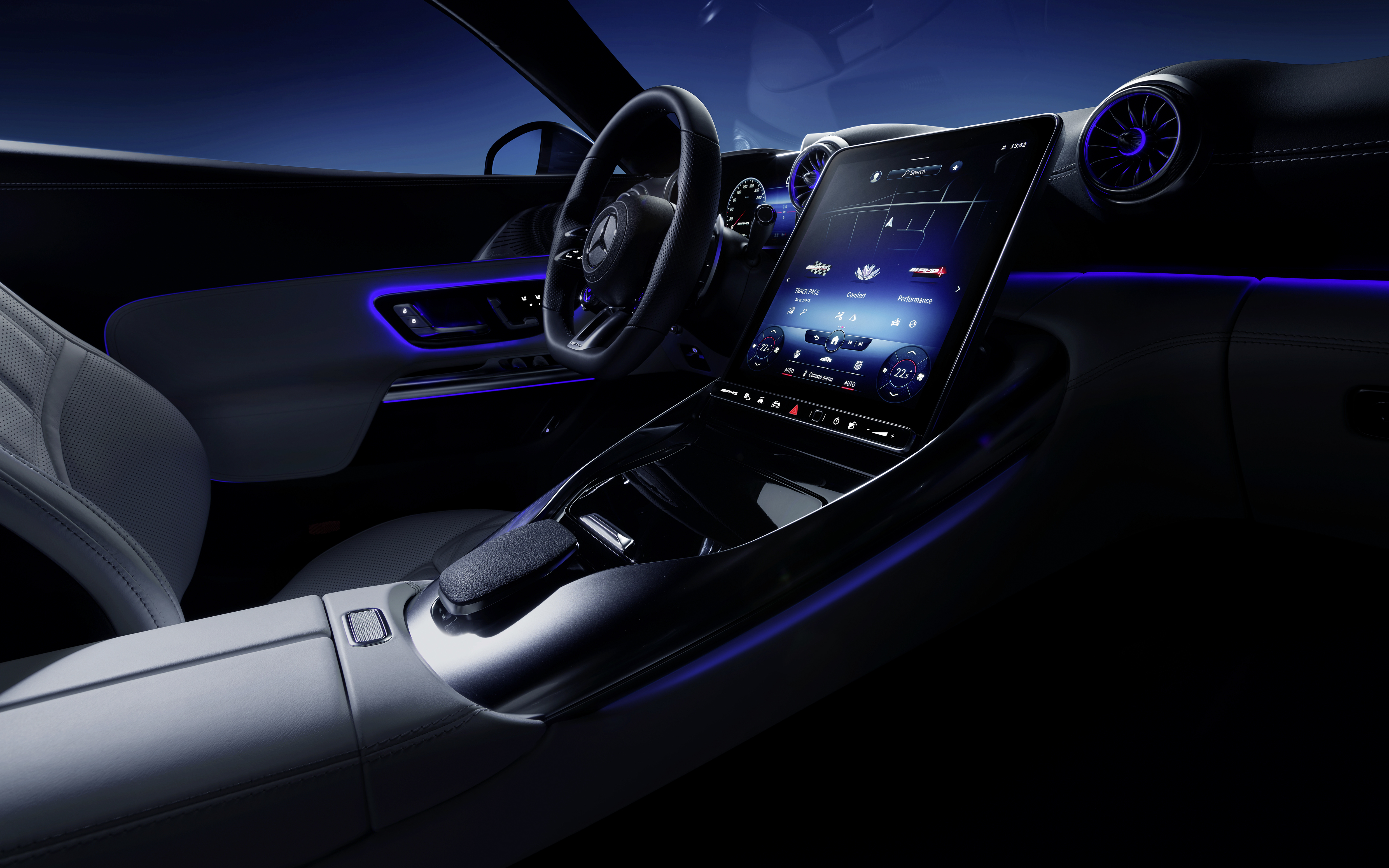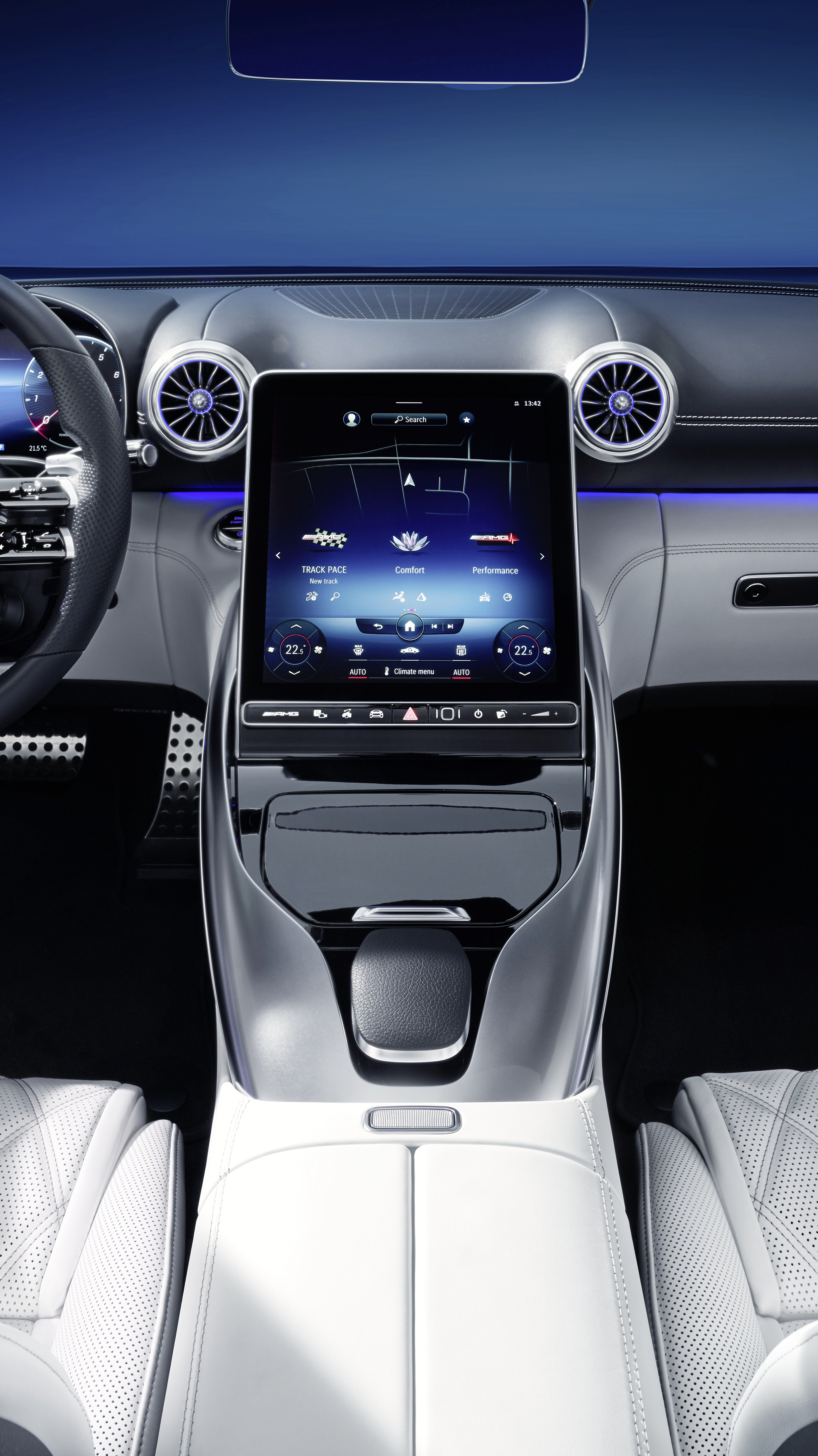 The operating structure and some key functions of this second-generation MBUX system correspond to those found in the latest S-Class. They have been extensively supplemented or replaced in some instances by AMG- specific content and views. This makes the new SL highly independent in terms of communication and information. Menu items such as "Performance" or "Track Pace" emphasize the sporty character. The interior has become even more digital and intelligent, as hardware and software have been extensively enhanced. Brilliant images on the LCD screens make it easy to control vehicle and comfort functions.
