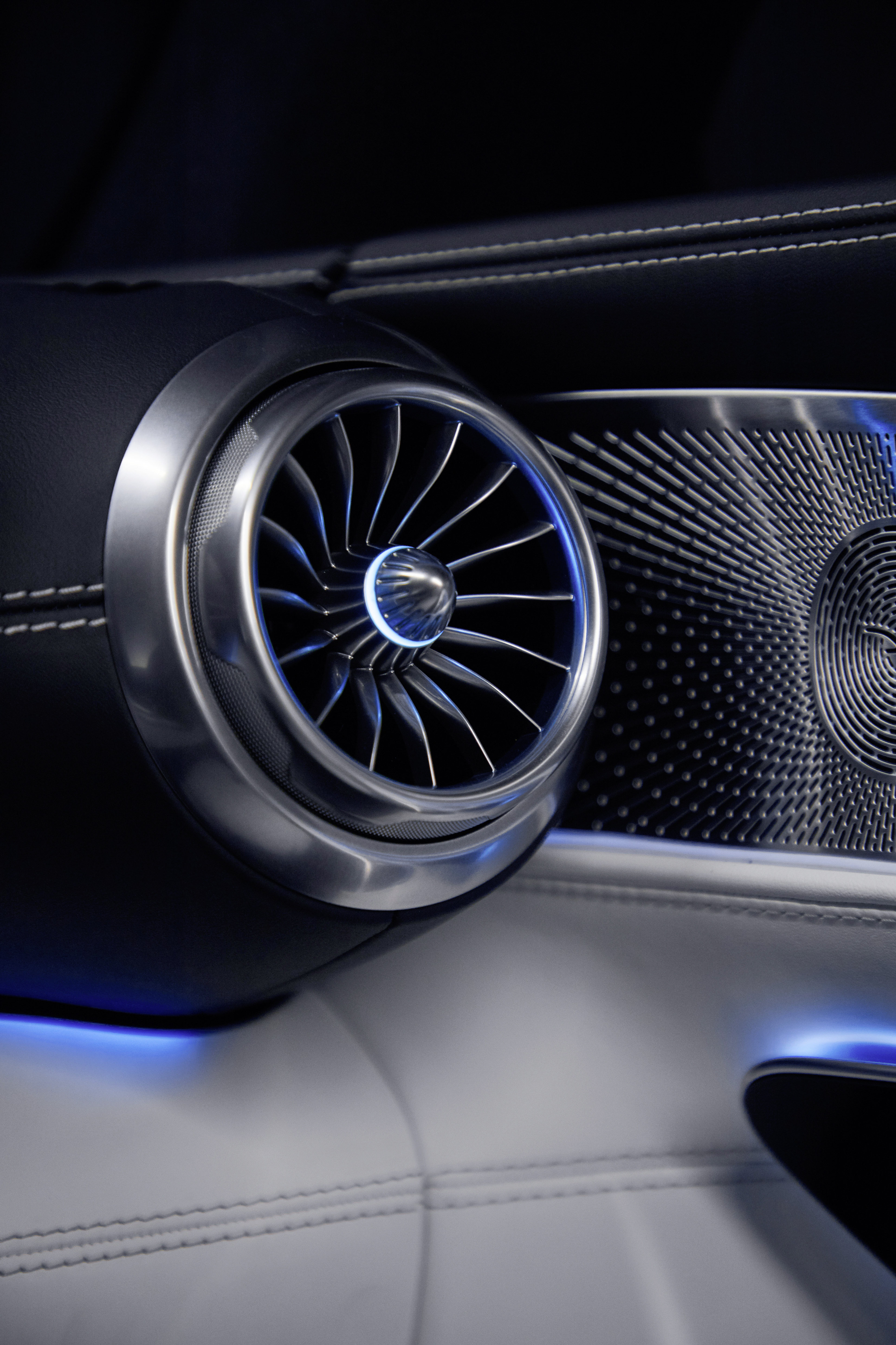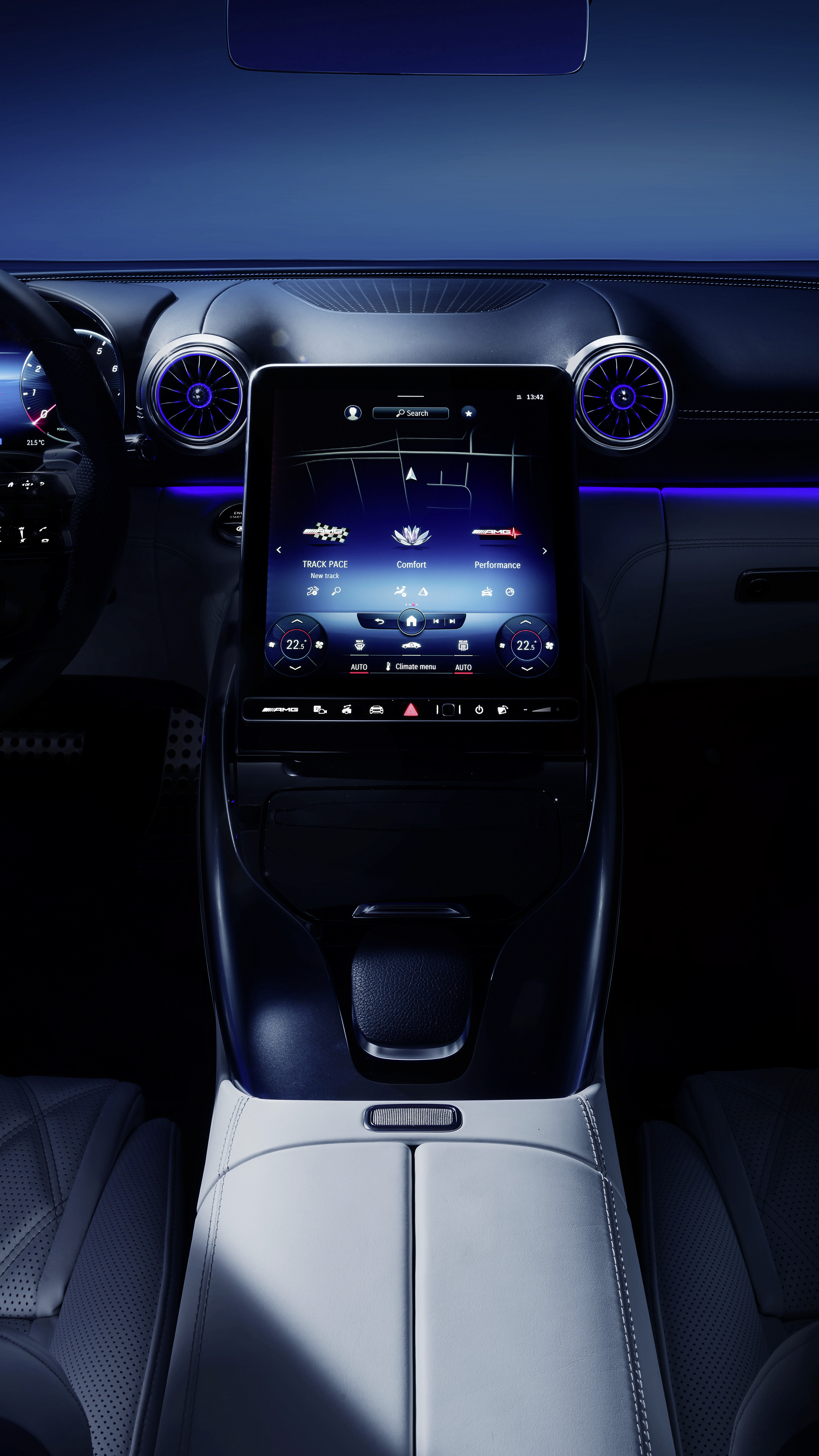 The center console provides visual interest in the space between the driver and front passenger. Of maximum width and rising sharply towards the front, it flows into the lower section of the instrument panel. The functional and visual center of the center console is the metallic panel that breaks through the leather surfaces at the front and rear. Featuring the air intake signature design element, it carries on the genes of the AMG GT and GT 4-Door Coupe. This design element thus becomes a hallmark AMG stylistic element in the interior. The air intake transitions almost seamlessly into the 11.9-inch multimedia touchscreen in portrait format. To avoid reflections caused by sunlight when driving with the top down, this screen can be adjusted electrically into a more vertical position. Its portrait format offers clear advantages, especially for navigation, as well as more space ergonomically. The touchscreen floats between the two central turbine nozzles as a digital contrast to more analog design elements.