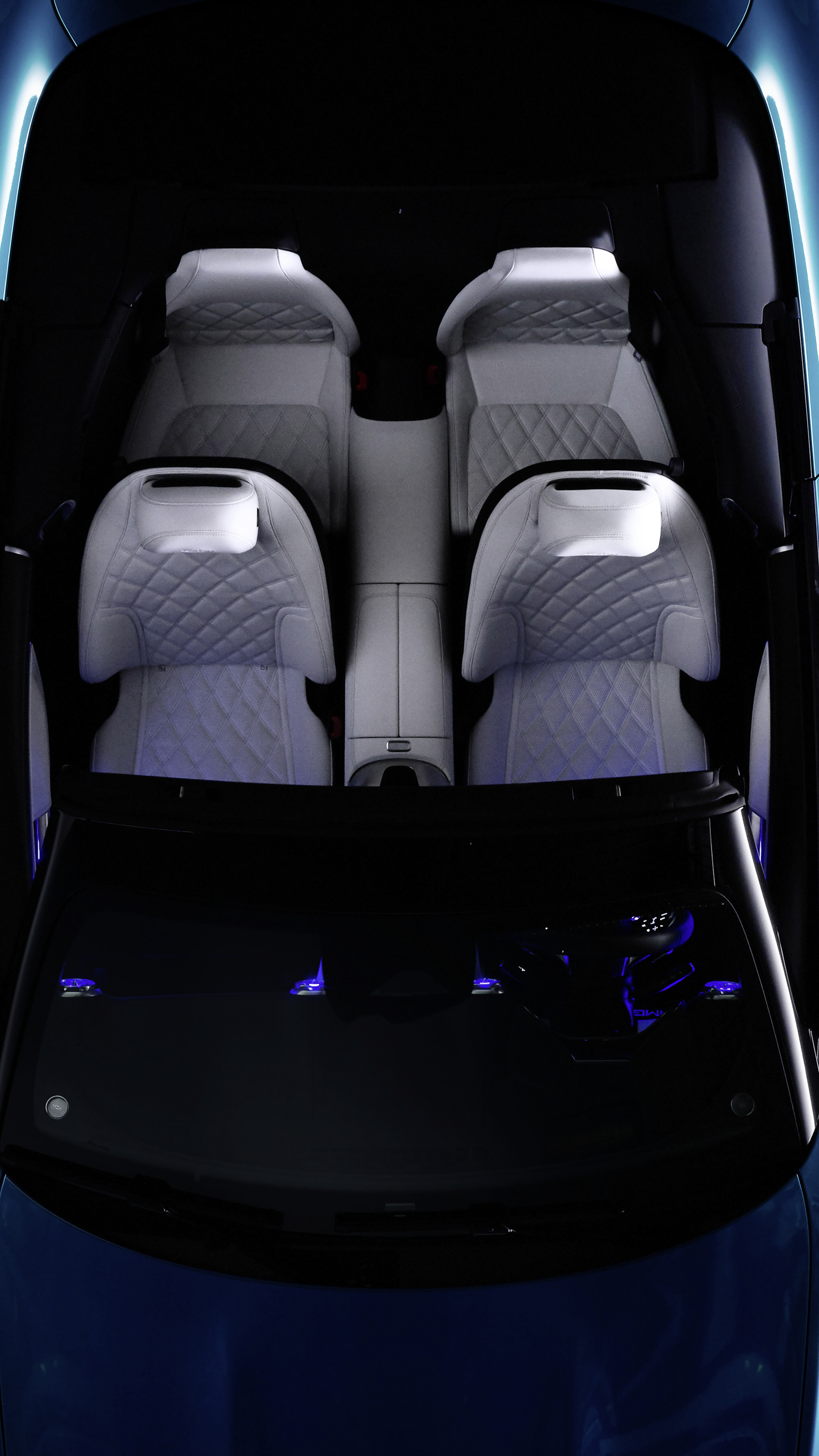 Similar to the center console, the surfaces in the doors also flow fluidly from the instrument panel. The result is a gradient accentuated with decorative topstitching, framing the entire interior and running past the turbine nozzles at the sides. The center of the door is designed as a sensual layered topography. The pull handle is also designed in the same way as the center console and is another eye-catching feature. The materials and modelling of the surfaces are repeated in the doors, creating balance in the interior. High-quality Burmester speakers in real metal, whose perforation pattern also stand out visually, are integrated into the doors.