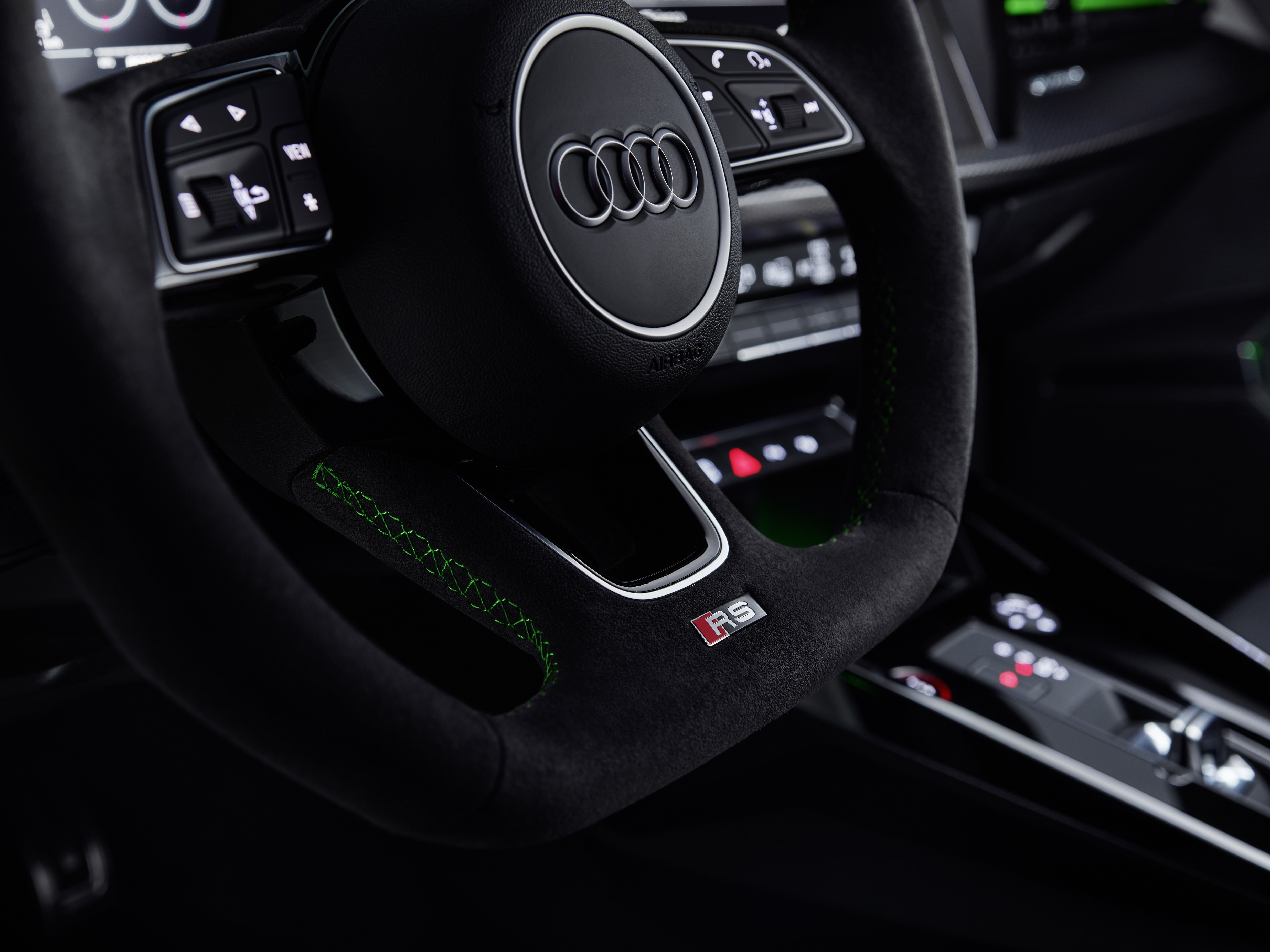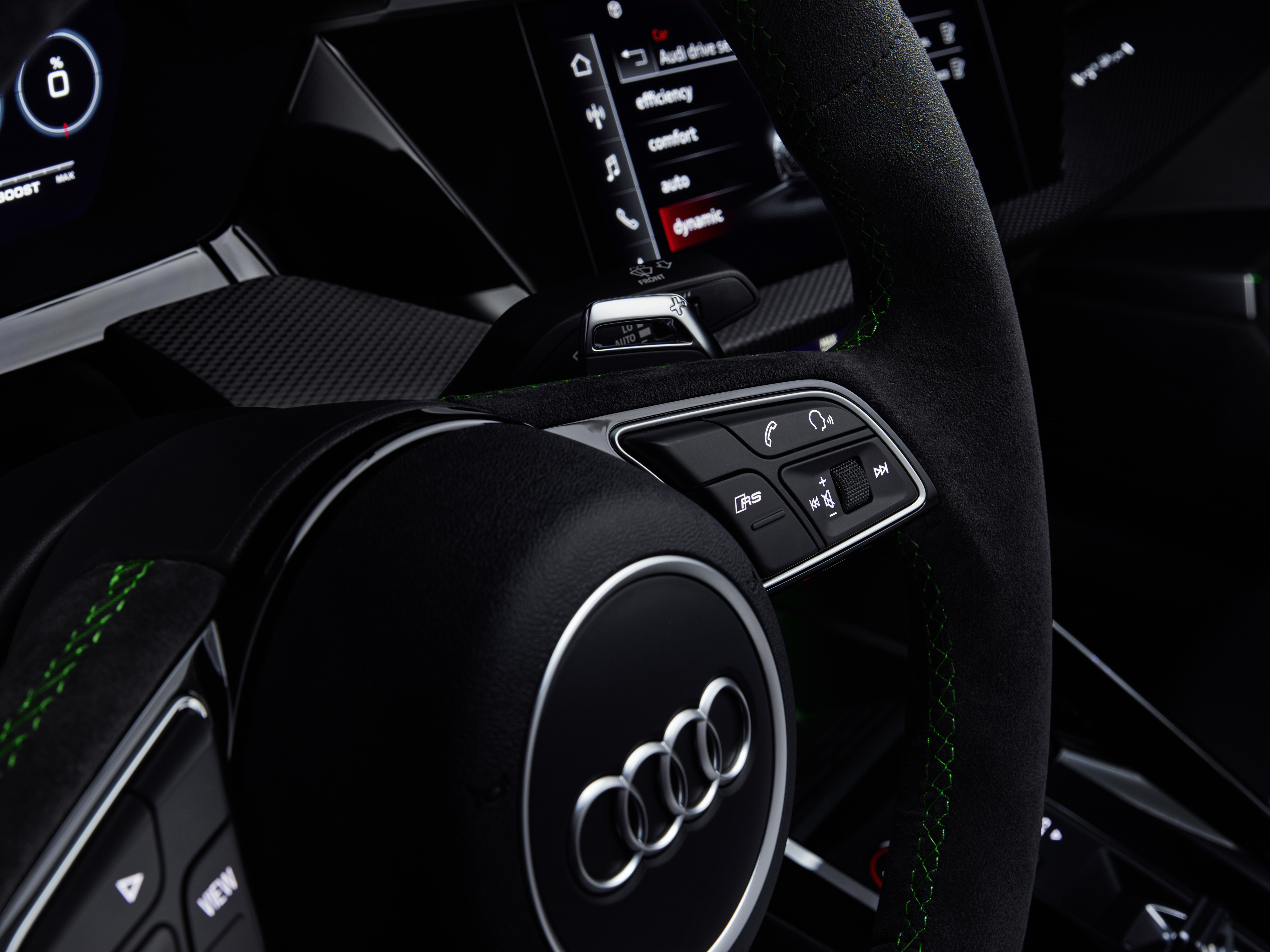 The RS 32 is standard-equipped with a three‑spoke RS Sport multifunctional leather steering wheel with a flattened bottom. It features built-in, high-quality die-cast zinc shift paddles. Those who opt for the Design package get, in addition to the RS badge, a 12 o’clock stripe for faster indication of the steering wheel position during dynamic driving. Alternatively, a round RS steering wheel is available with hands-on detection, i.e. capacitive grip recognition, for assisted steering functions. Both have the new RS Mode button on the right-hand steering wheel spoke in common. This button can be used to select the Audi drive select modes RS Performance, RS Individual, or the last mode used. In both RS modes, the display of the instruments and the head‑up display has an even sportier look with a blinking shift indicator.