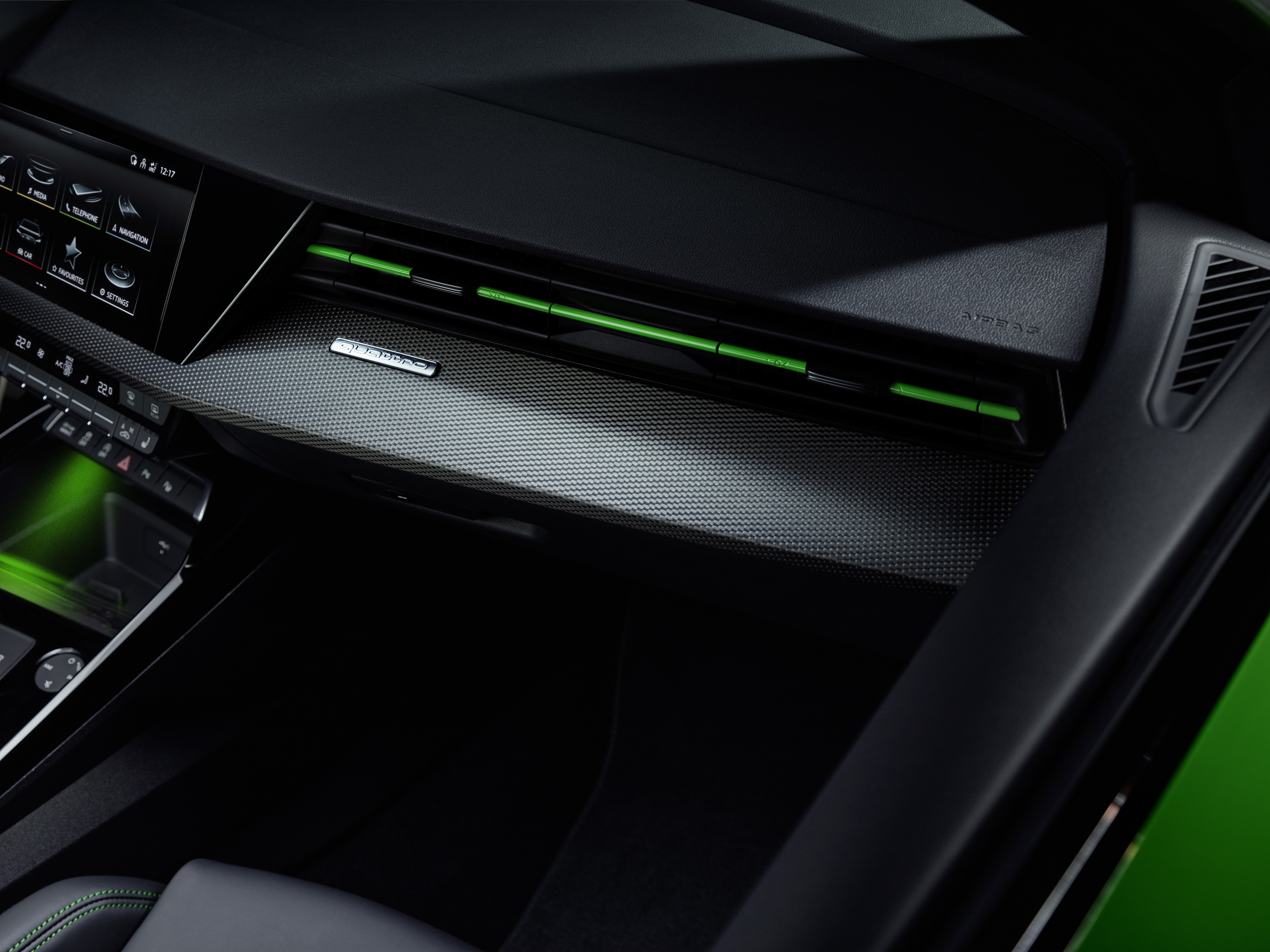 The genuine racing feeling is further enhanced by the carbon inlay in the instrument panel and RS sport seats with RS embossing and anthracite contrast stitching. The seat upholstery is optionally available in fine Nappa leather with RS honeycomb stitching and glossy black, red, or, for the first time, green contrast stitching. RS Design packages in red and green are available to match. They include special floor mats with contrast stitching and RS embroidery, as well as seatbelts with colored edges. The Design package plus includes seat corners in red or green and a colored accents on the air vents.