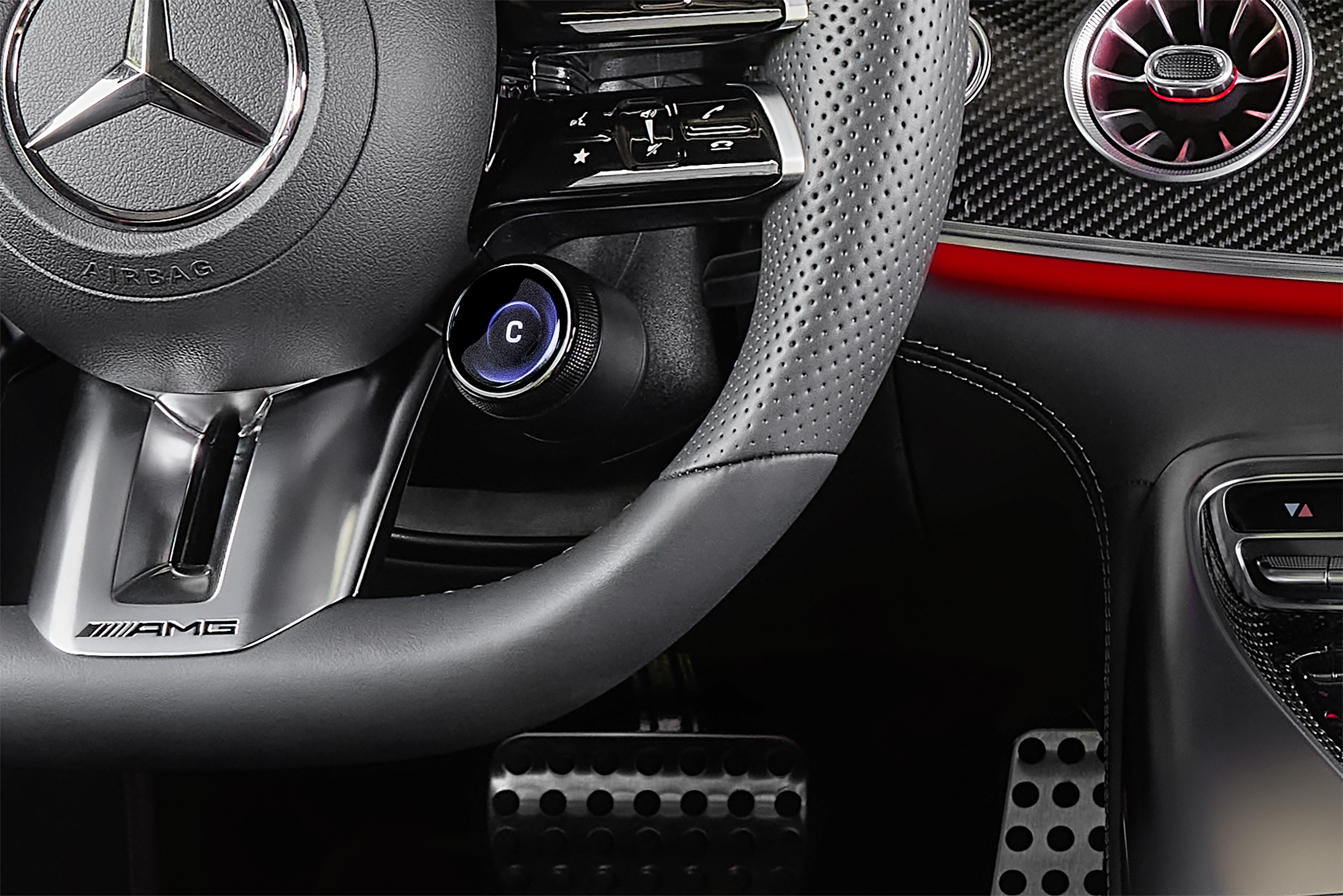The standard AMG Performance steering wheel with its distinctive twin-spoke design and seamlessly integrated control buttons also offers tangible and visible added value. The three rounded twin spokes combine strength with lightness. The round AMG steering wheel buttons impress with brilliant displays and their perfect turn-and-press operating logic. This allows important driving functions and all driving modes to be controlled without having to take one's hands off the steering wheel. As a new feature, it is possible to select the regeneration levels of the hybrid drive via the steering wheel buttons.