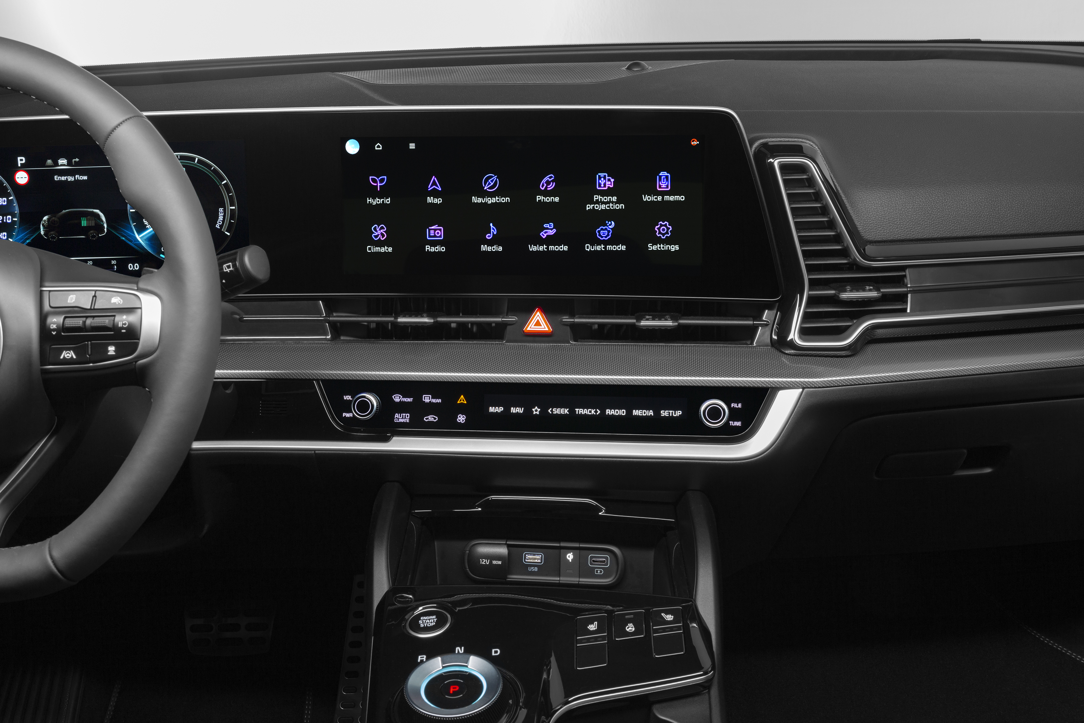 An ergonomic centre console has been optimally positioned for the driver and front passenger, providing storage, operating system configuration, cupholders and soft-touch switches, the latter sitting on a raised profile alongside the shift-by-wire transmission dial. A smartphone charging bay offers high-speed 15W wireless charging.