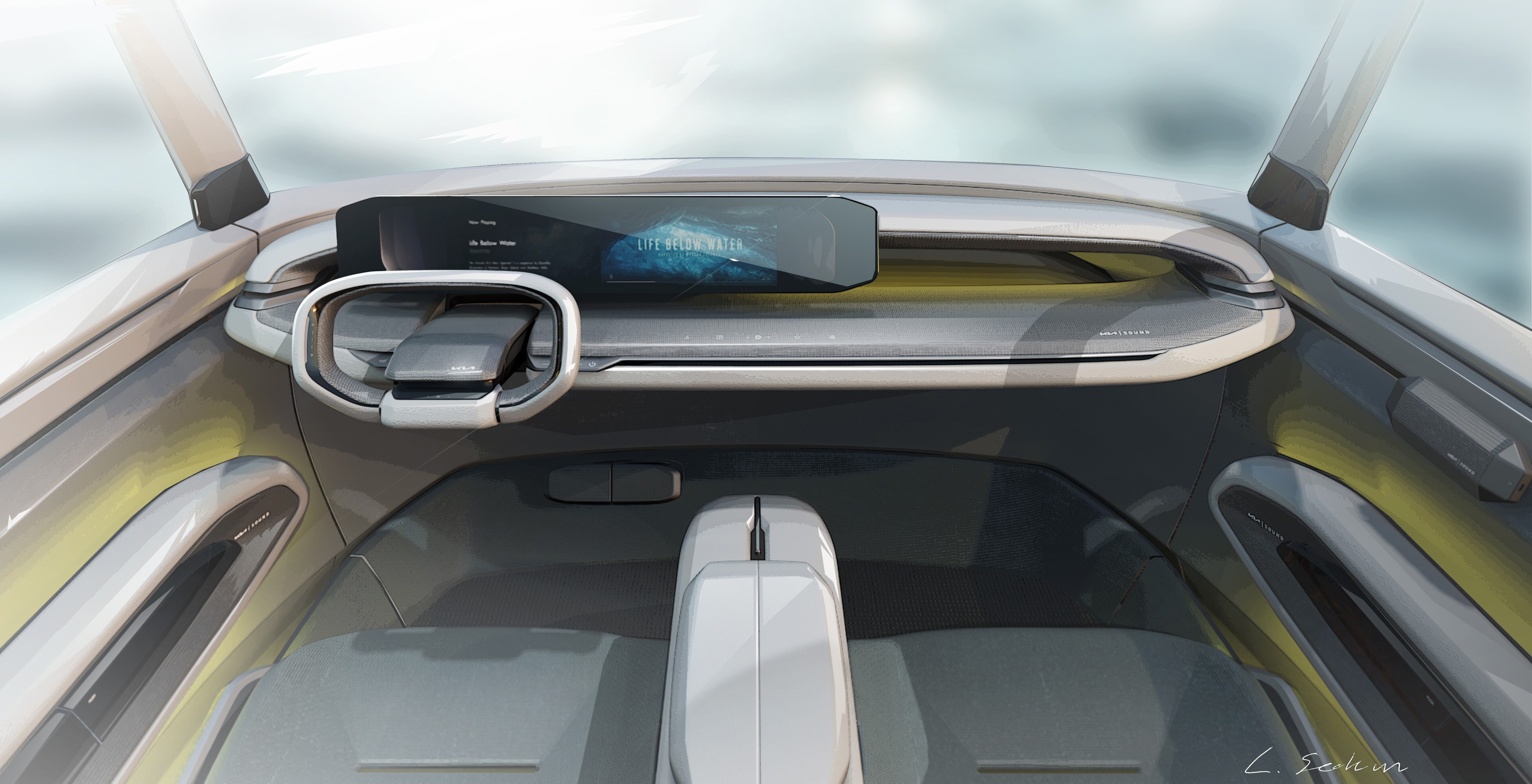 물의 요소에서 출발한 콘셉트 EV9은 ▲바다를 닮은 색상과 ▲물을 보전할 수 있는 지속가능하고 재사용가능한 자원을 실내 소재로 사용, 승객에게 자연과 연결되는 평온한 느낌을 선사한다.