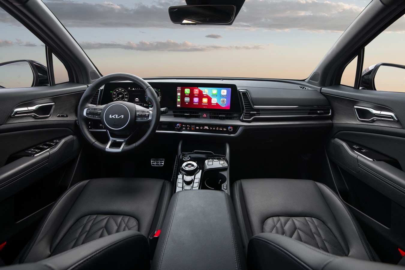 Inspired by high-end outdoor products, furniture, and modern architecture, the interior of the Sportage PHEV transforms the cabin into a pleasant living space. The futuristic driver cockpit with available dual panoramic curved display3 connects two screens for nearly 25-inches of viewing (12.3-inch digital instrument cluster, 12.3-inch infotainment screen).