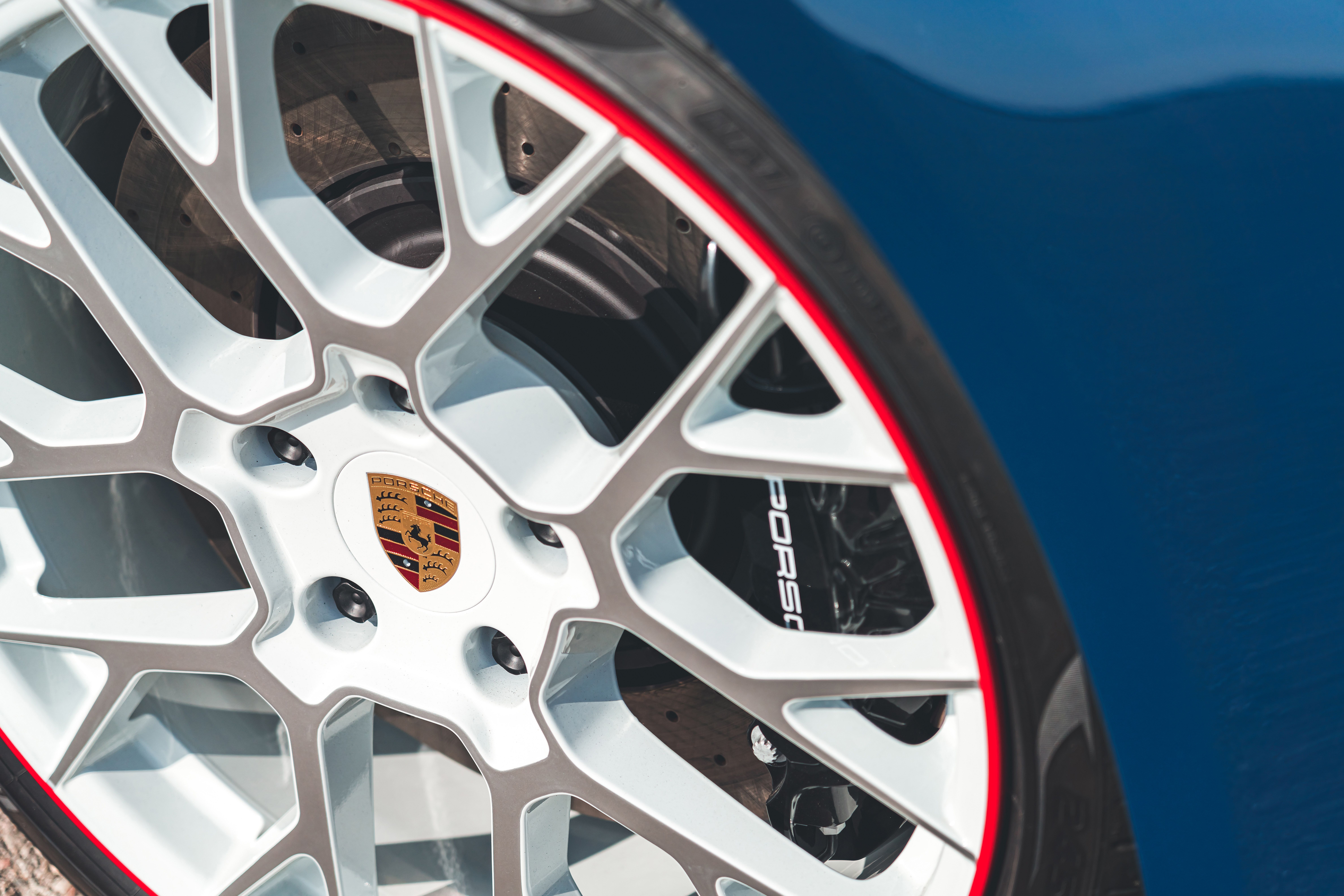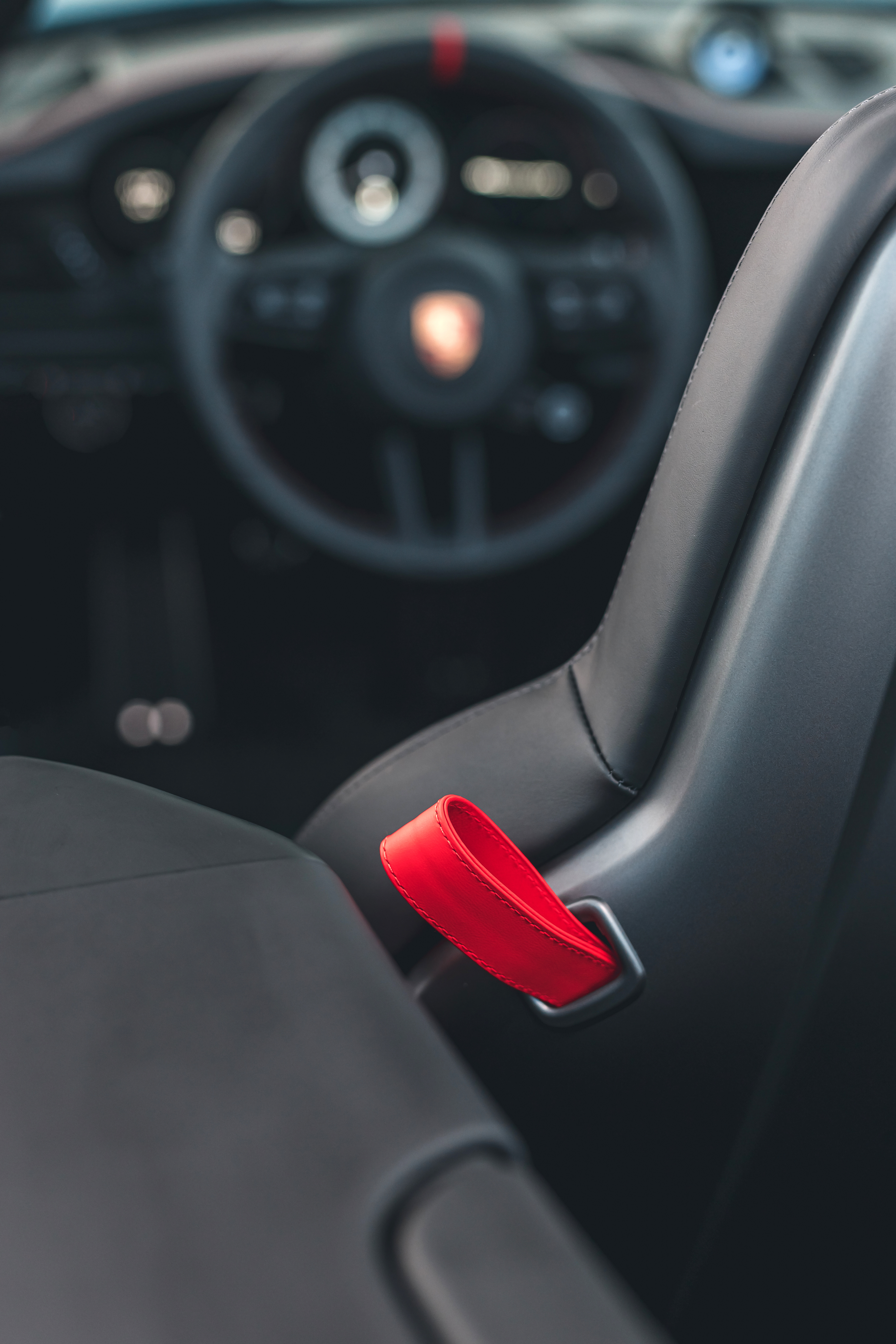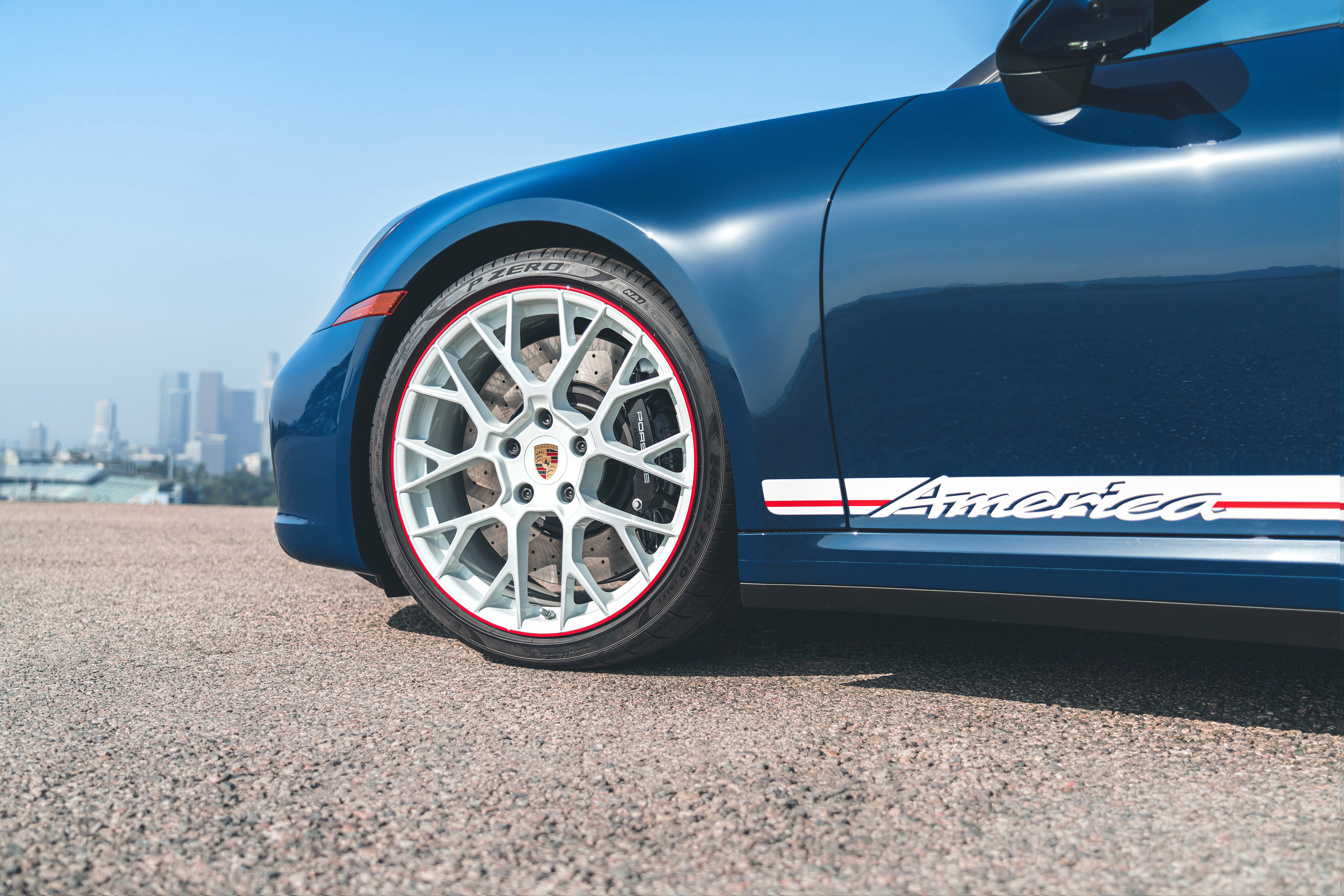 An optional extended interior package continues this theme with a 12 o’clock marking in Guards Red to the steering wheel and Guards Red cross stitching on the inside edge of the wheel. This package also adds two-tone stitching to the shift boot and adds a gear pattern on the manual lever in Guards Red. Sport Seats Plus with double stitching in Guards Red and Pebble Grey with “911” stitching on the headrests in Guards Red and the leather backrest release loops in the same color. The floor mats also gain the same two-tone stitching in Guards Red and Pebble Grey. Finally, the vehicle key is painted in Azure Blue 356 to match the car, and a leather key pouch with two-tone stitching and “America” embossment completes the package.