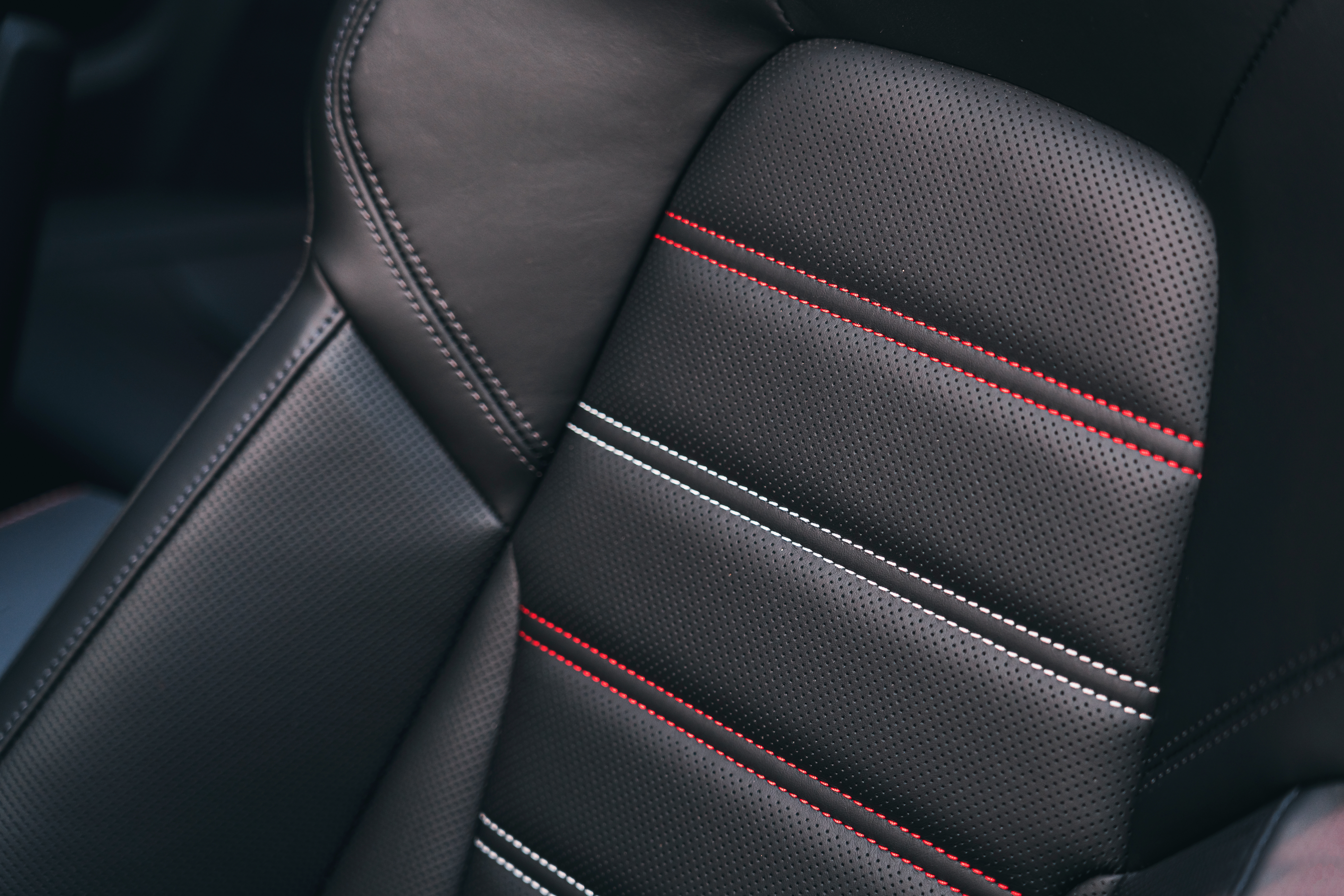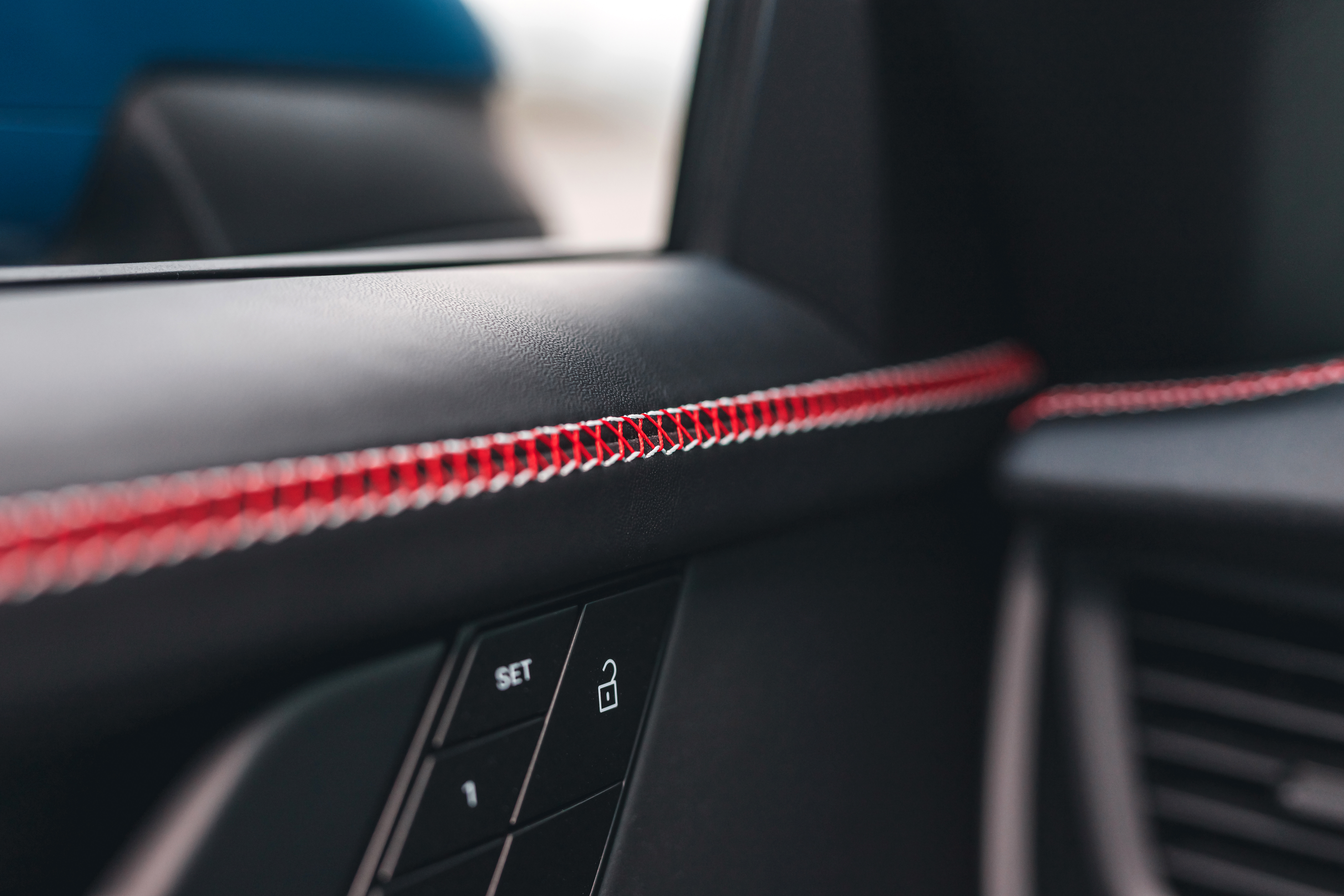 윈드실드 프레임은 사틴 블랙으로 처리해 통일감을 주었고 RS 스파이더 디자인 휠을 적용해 차별화했습니다. 실내에도 몇 가지 포인트가 있는데, 도어 안쪽과 시트, 스티어링 휠에 디자인 요소를 더했습니다.