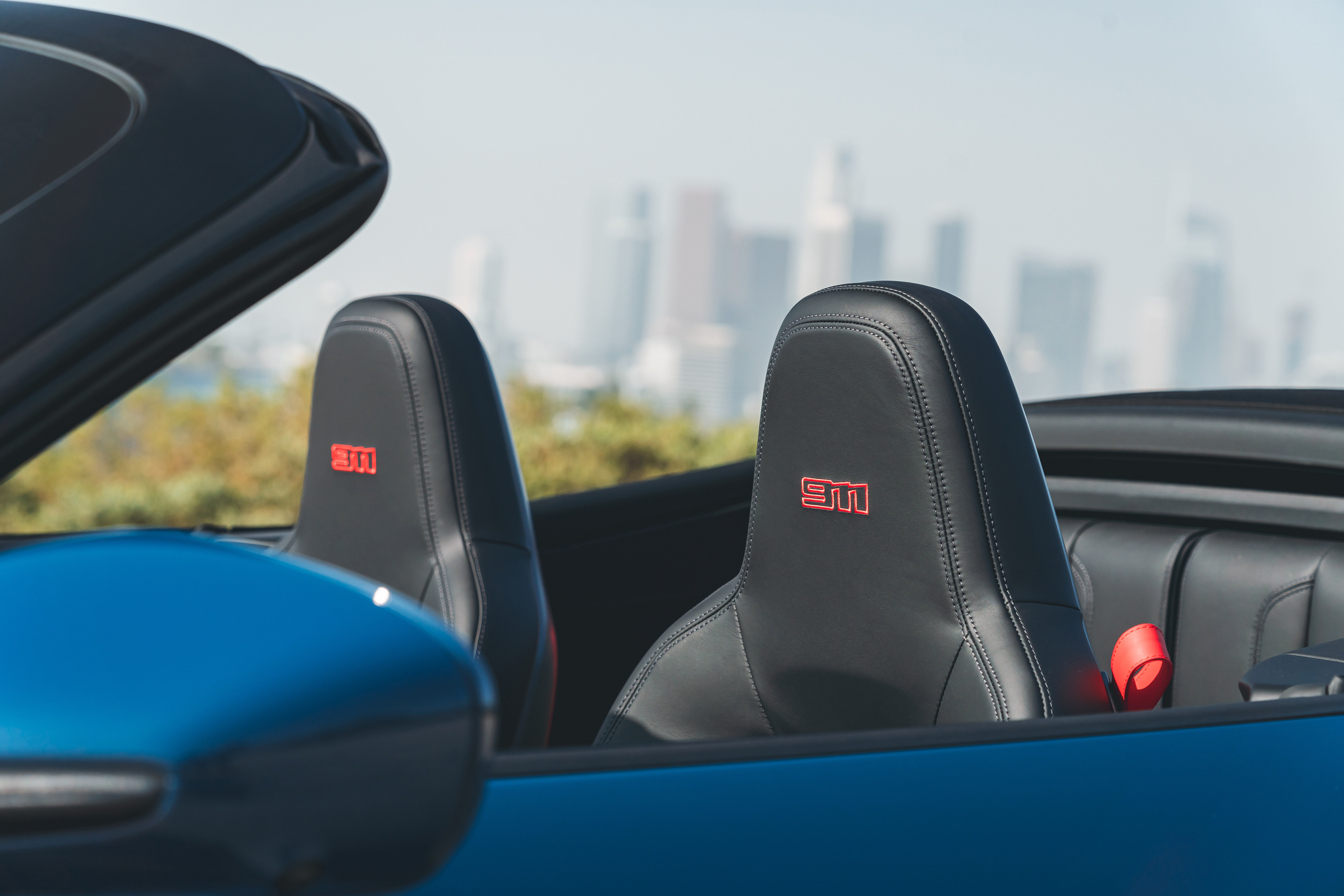 Aesthetic changes applied by Porsche Exclusive Manufaktur make this a striking sports car both from a distance and up close. The exterior color, Azure Blue 356, was inspired by the 1953 356 America Roadster. Through Paint to Sample Plus, the color is revived and reserved for this special vehicle in the 2023 model year. The windshield frame is finished in Satin Black. RS Spyder Design Wheels are specially-finished with the interior portion of the spokes in white, the outermost flat surfaces in silver and a Guards Red pinstripe along the edge of the rim.