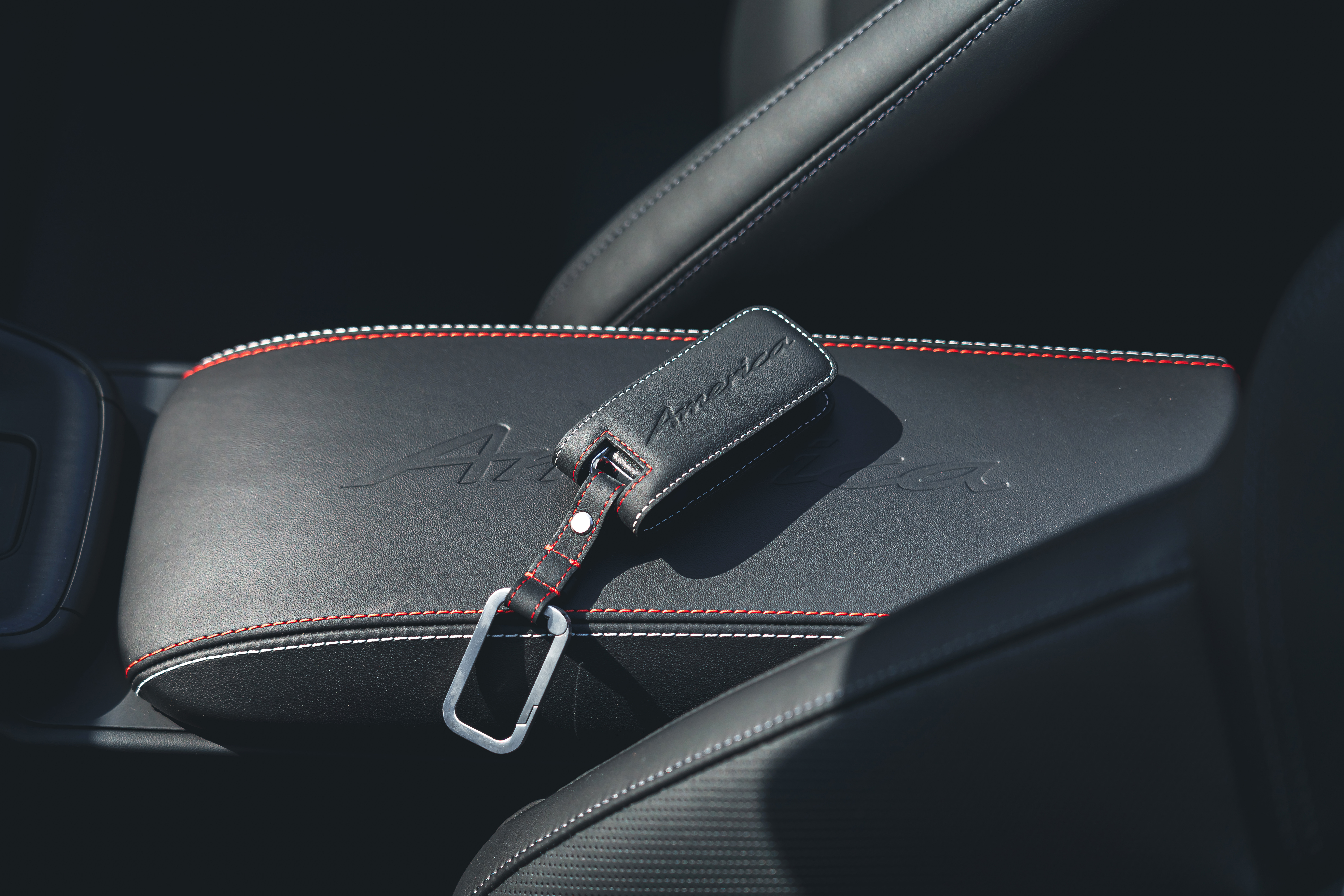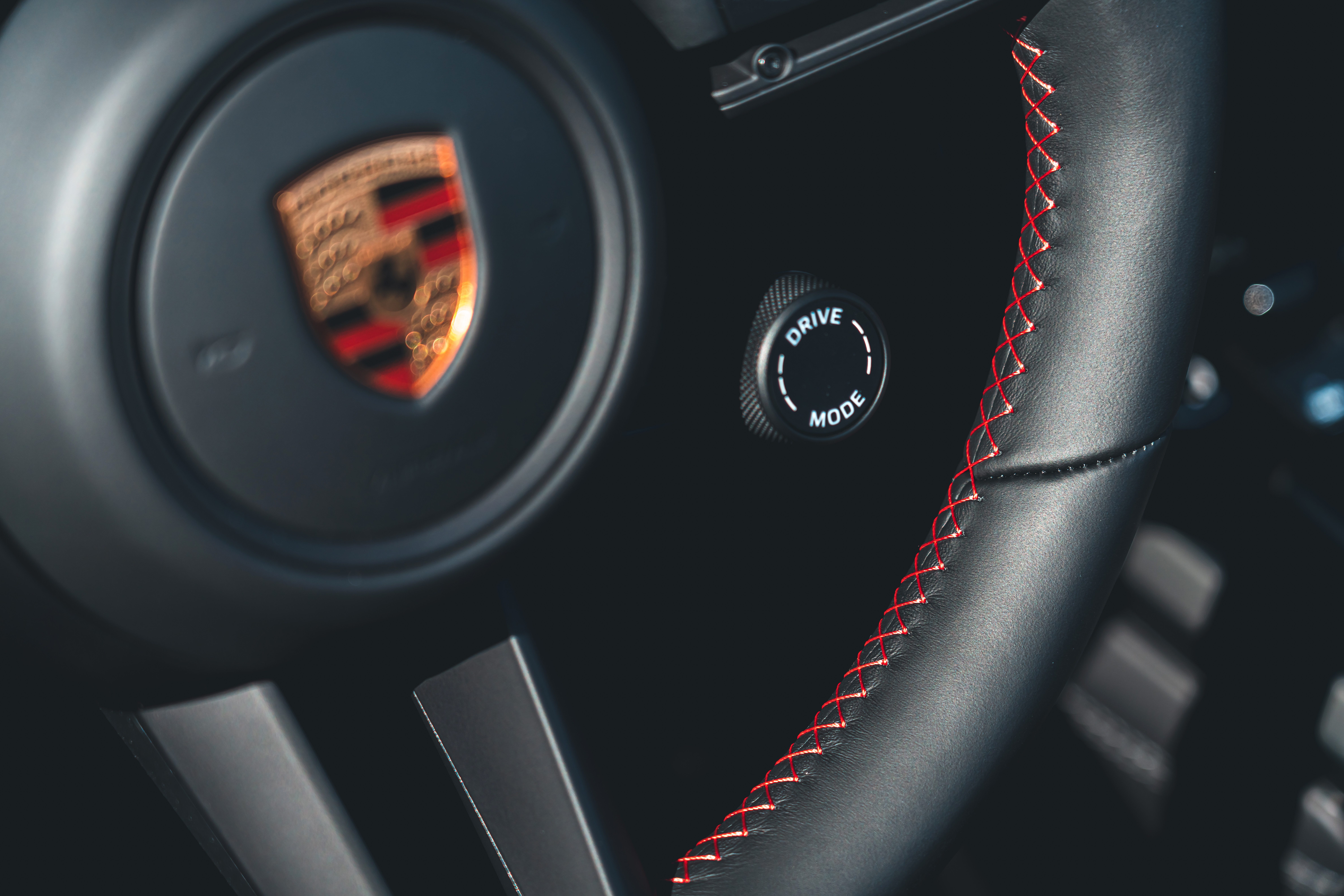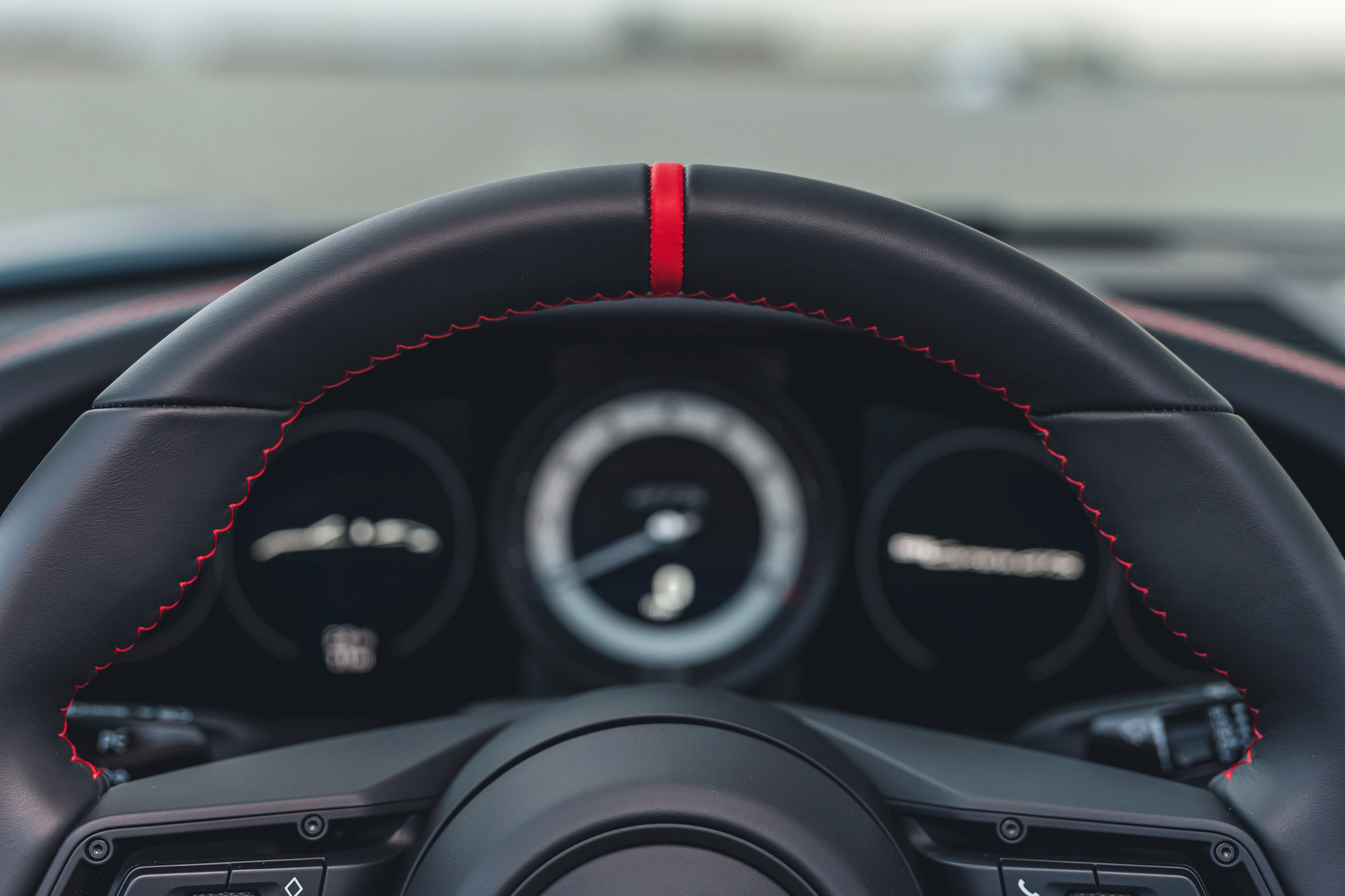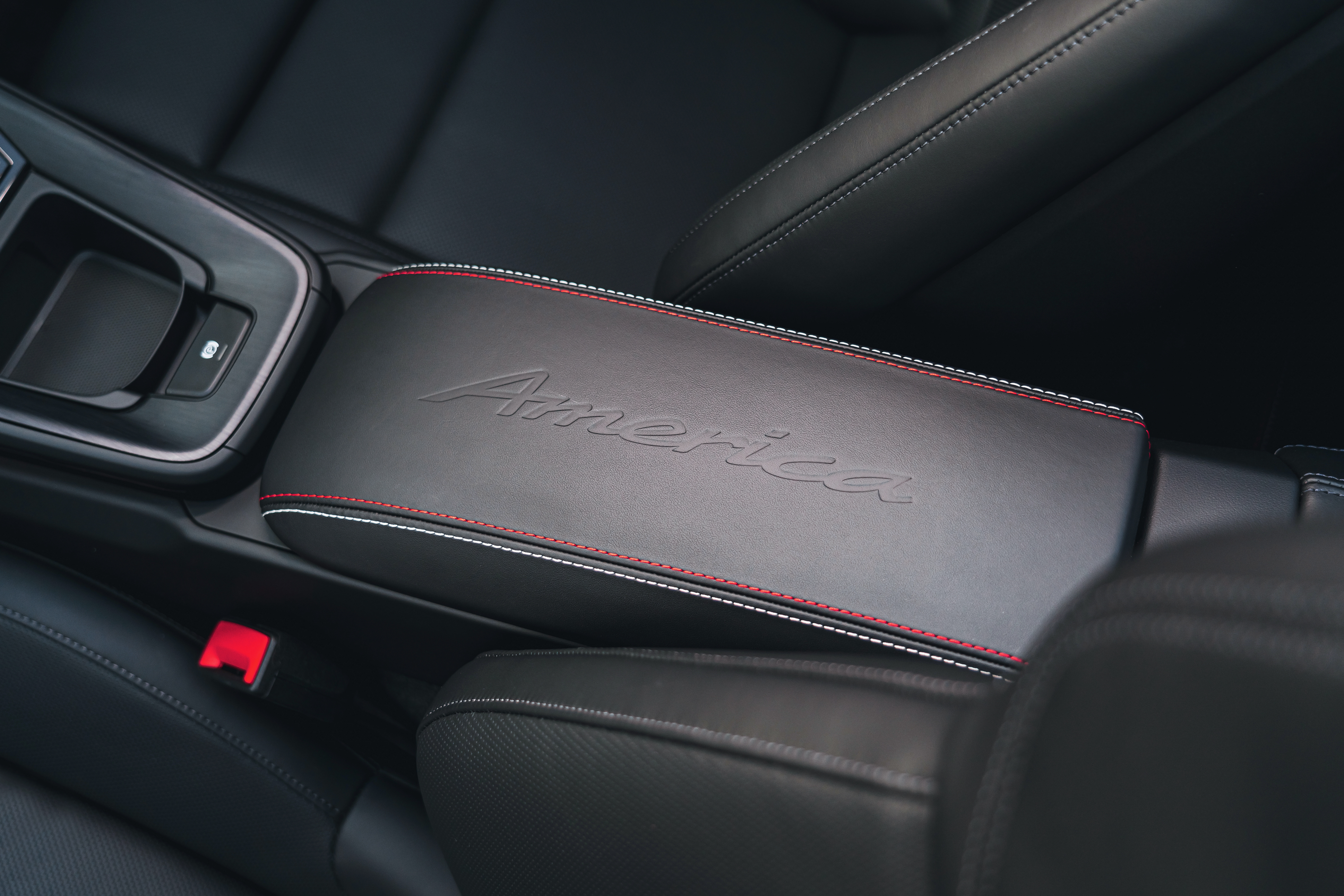 Cross stitching in Guards Red with surrounding stitching in Pebble Grey continue the color combination through the cabin, including along the upper dashboard and door panels. Two-tone stitching in Guards Red and Pebble Grey continue the contrast on the center console armrest where “America” is embossed in the leather. Unique illuminated door sill plates commemorating the 70th anniversary of the 356 America Roadster are also included as standard equipment, along with a leather interior in black, seat belts in Guards Red, the tachometer and instrument cluster in white and a heated GT Sport steering wheel.