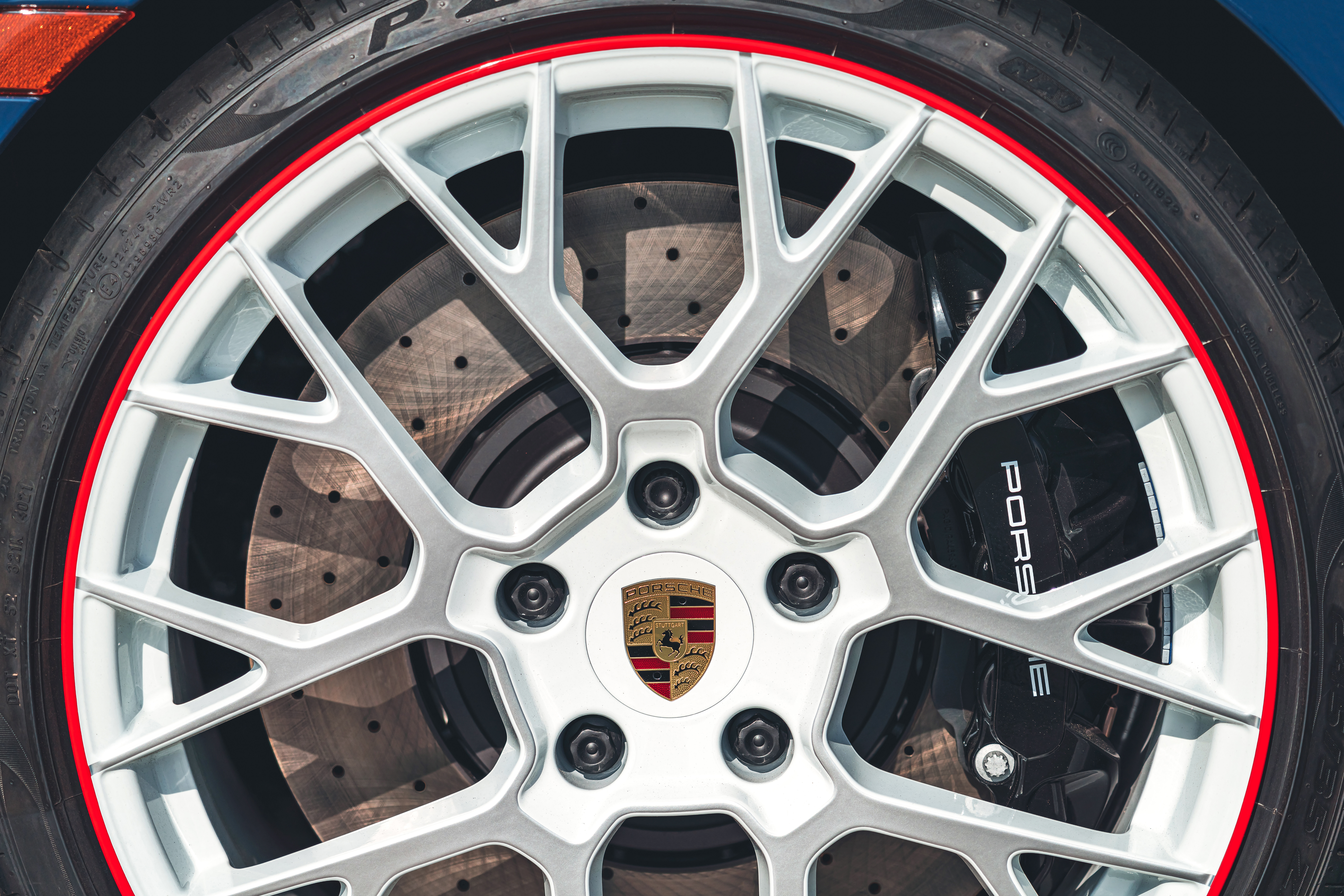 The new 911 Carrera GTS Cabriolet America uses a twin-turbocharged 3.0-liter boxer six-cylinder engine to generate 473 hp and 420 lb.-ft. of torque. Porsche Active Suspension Management (PASM) Sport is standard equipment, and lowers the ride height by 10 mm while adding helper springs to the rear axle. Sport Exhaust and the Sport Chrono Package are also both standard equipment. Rear axle steering and Porsche Ceramic Composite Brakes (PCCB) are available as added cost options. The standard cast iron brake rotors measure 408 mm (16 inch) in front with six-piston aluminum fixed calipers and 380 mm (14.9 inch) rotors in the rear with four-piston fixed aluminum calipers finished in black.