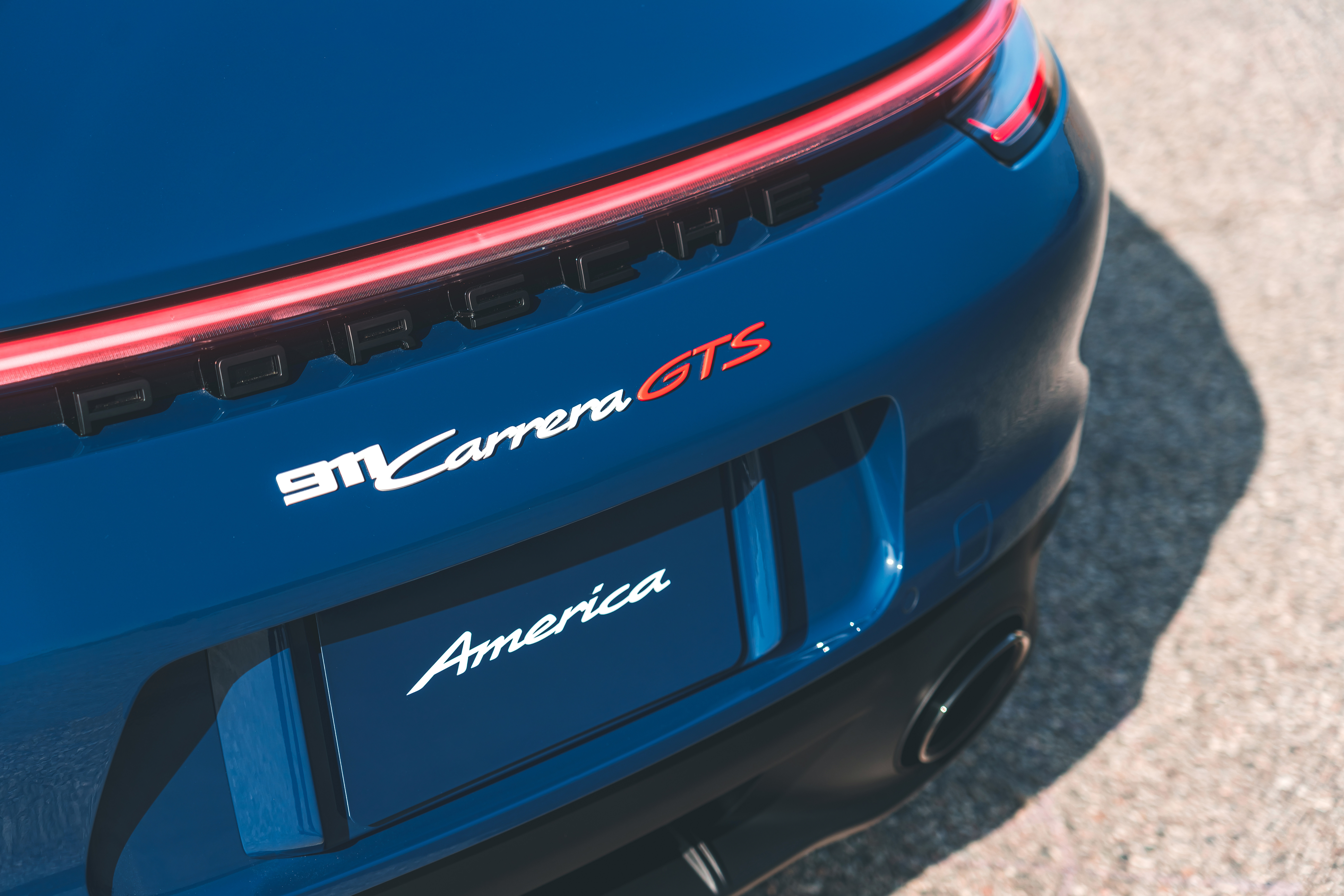 Along the doors, decals in white with Guards Red accents read “America” while the model designation on the rear features “911 Carrera” in white and “GTS” in Guards Red.