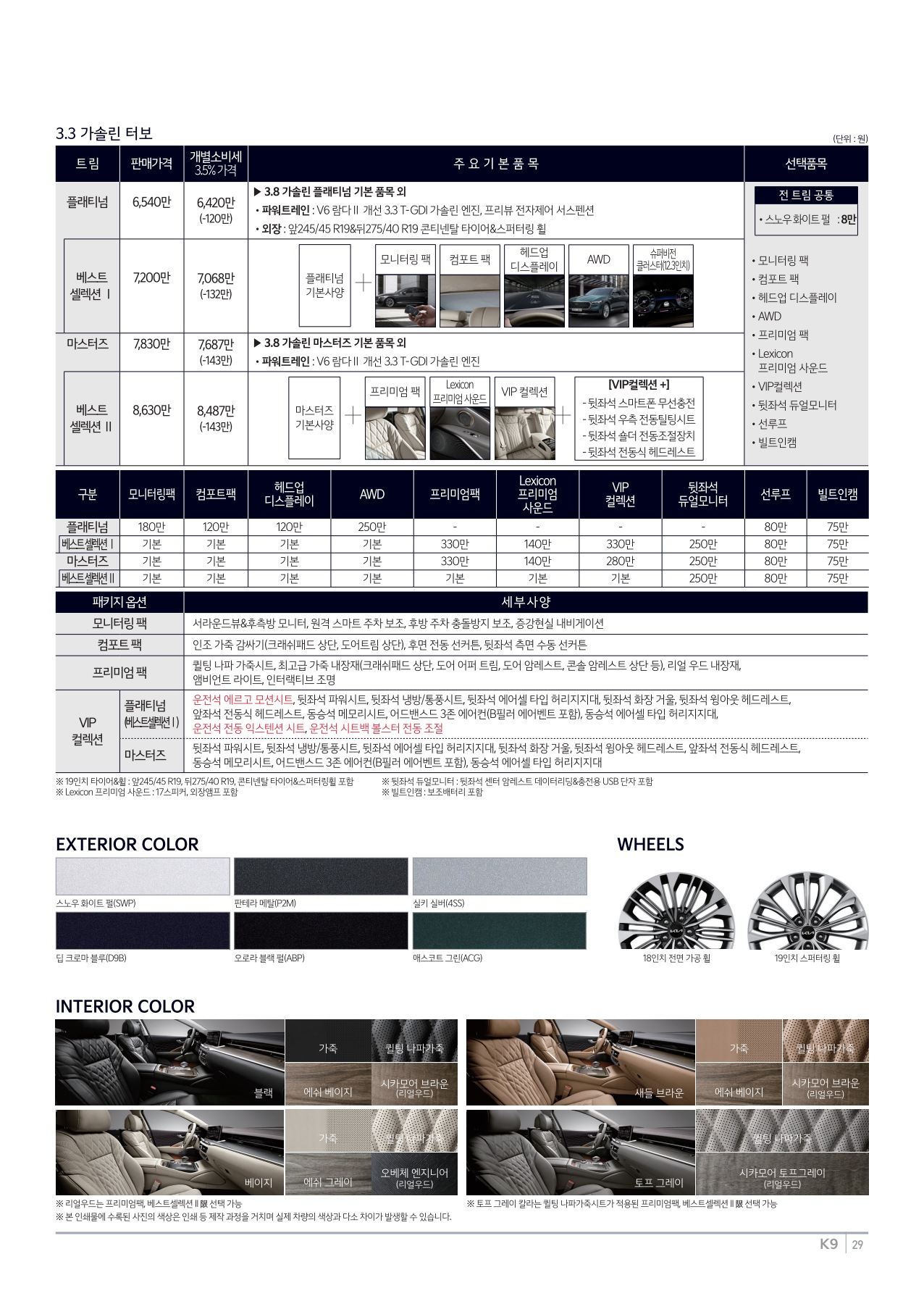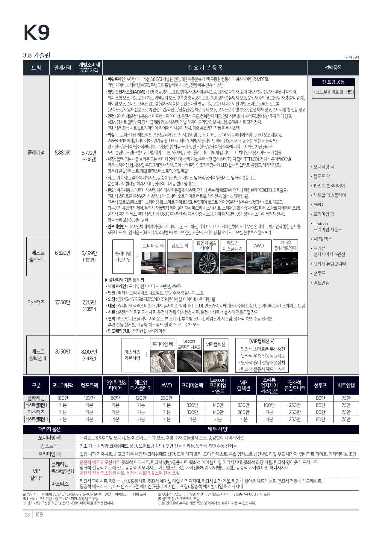 The 2023 K9의 가격은 3.8 가솔린 모델 플래티넘 5,772만 원, 마스터즈 7,215만 원이며, 3.3 가솔린 터보 모델 플래티넘 6,420만 원, 마스터즈 7,687만 원이다. (※ 개별소비세 3.5% 기준)