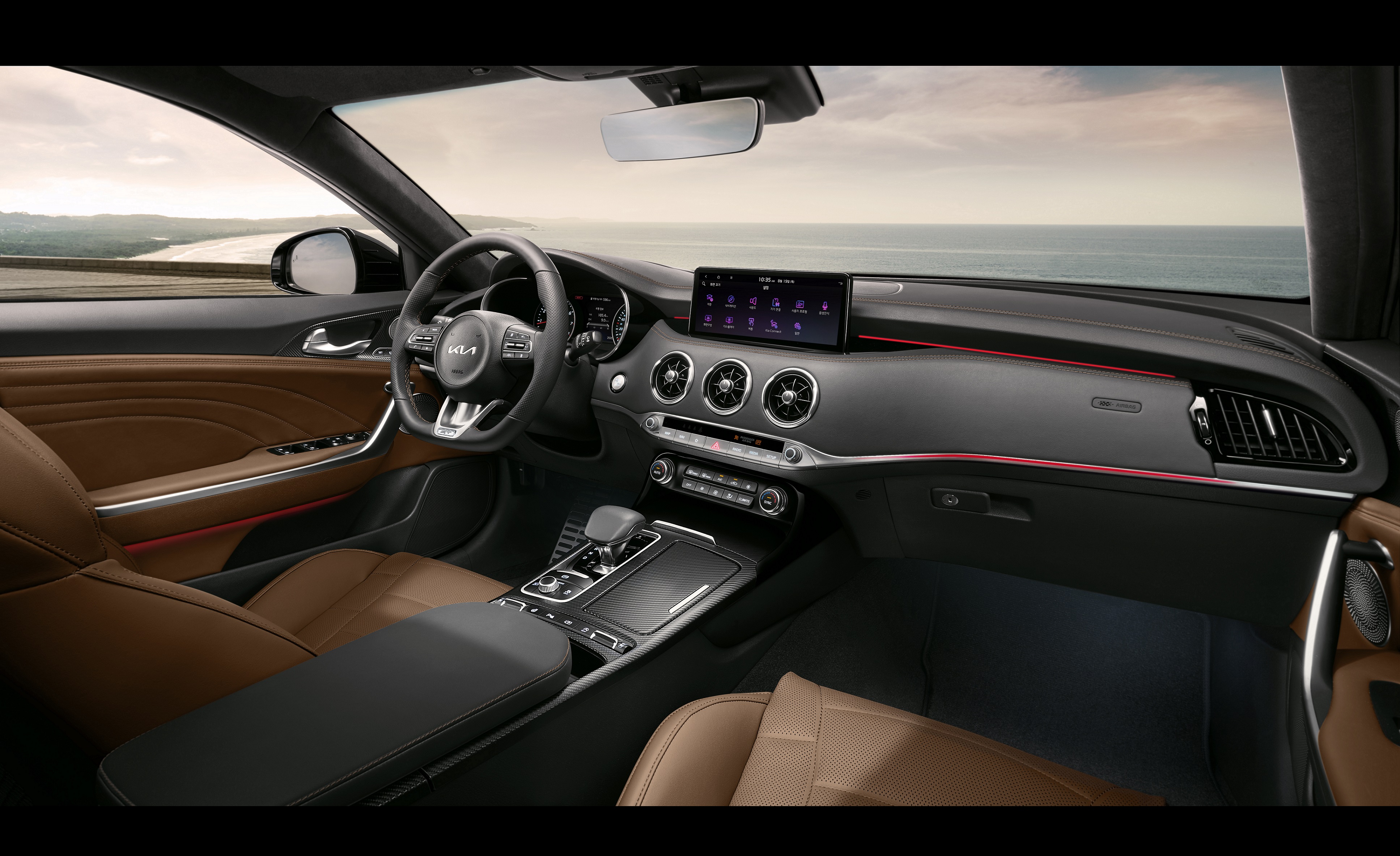 Inside, a carefully curated collection of design and material upgrades further enhance the sporting ambience of the Stinger’s spacious, technology-infused cabin. Bespoke Terracotta brown leather enriches the sports seat, and the material’s timeless appeal extends to features such as the steering wheel, door side trim and door handles. Kia’s designers have applied a carbon-effect finish to the console upper cover and the door panels to complement the new Terracotta leather trim.