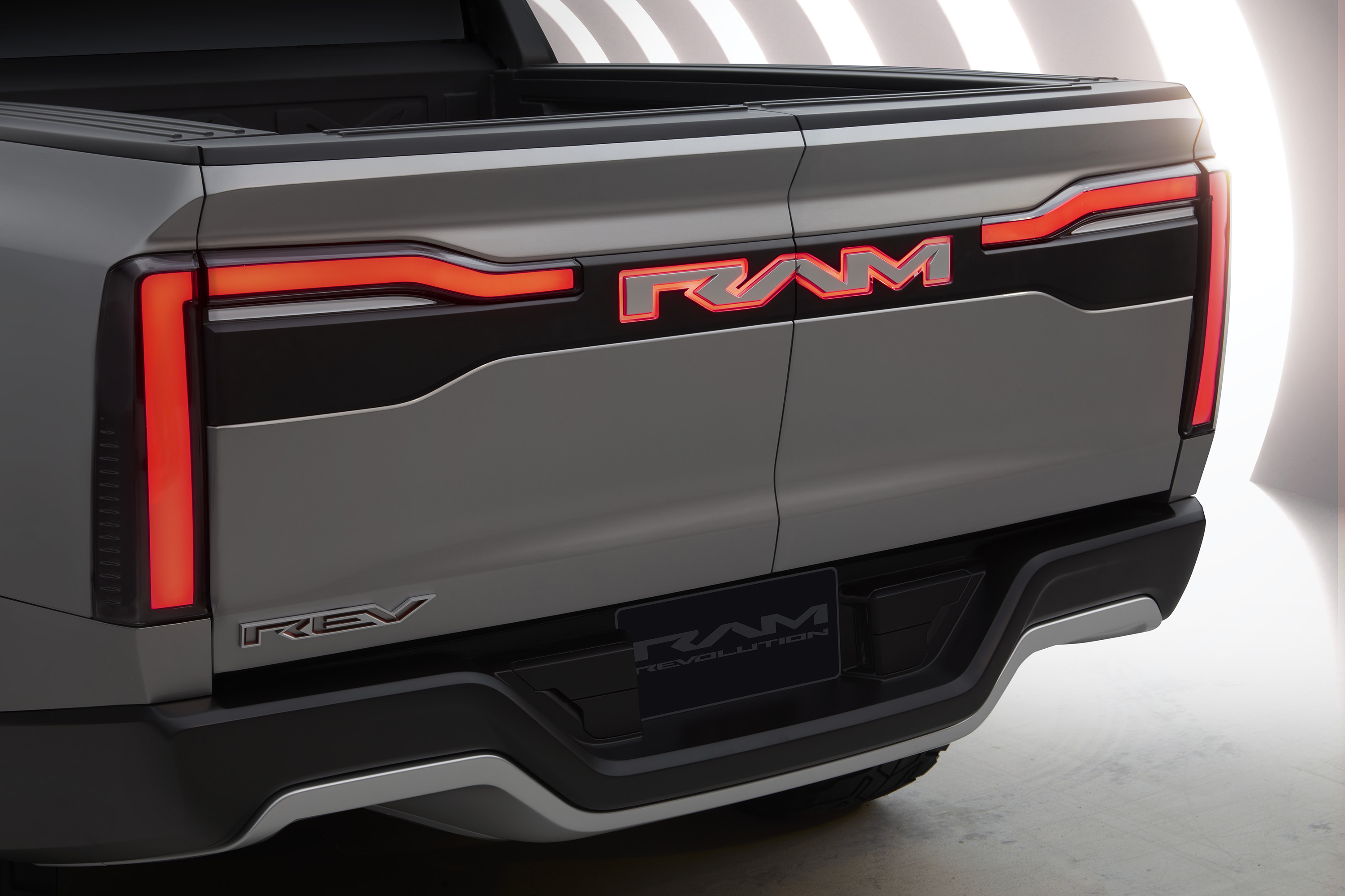 기능이 추가된 눈에 띄는 RAM 디자인에는 파워 다기능 테일게이트와 더 큰 RAMBox가 포함됩니다.날카로운 모래시계 차체 디자인과 펜더 웰은 새로운 독특한 디자인으로 35인치 타이어를 클리어합니다.1500Revolution BEV 컨셉은 셀프 레벨링 기능과 24인치 휠에 장착되며, 중앙 캡을 장착하여 조명을 켜고 제자리에 고정됩니다.