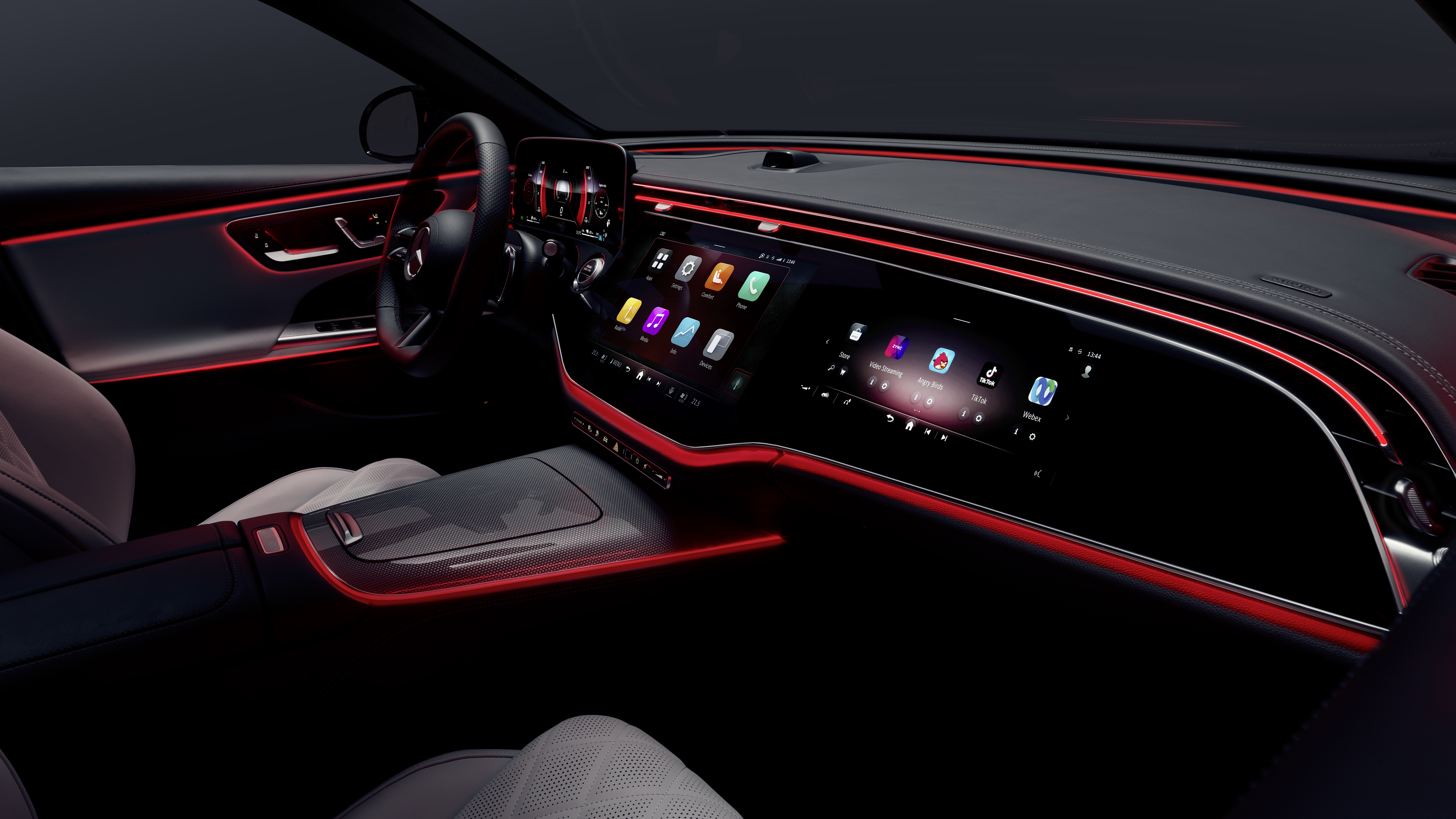 E-Class의 엔터테인먼트 프로그램은 그 어느 때보다 인터랙티브합니다. 메르세데스-벤츠의 소프트웨어 전문가들은 타사 앱을 설치할 수 있는 새로운 호환성 계층을 개발했습니다[4]. 더 뉴 E-클래스[5] 출시와 함께 중앙 디스플레이에서 엔터테인먼트 플랫폼 "TikTok", 게임 "Angry Birds", 협업 애플리케이션 "Webex", 오피스 애플리케이션 "Zoom", 브라우저 "Vivaldi" 등의 앱을 사용할 수 있습니다. 또한 ZYNC 엔터테인먼트 포털[6](선택 사항)은 하나의 사용자 인터페이스를 통해 중앙 및 조수석 디스플레이에서 비디오 스트리밍, 주문형 콘텐츠, 인터랙티브 경험, 지역 비디오 프로그램, 스포츠, 뉴스, 게임 등을 다양하게 제공합니다.