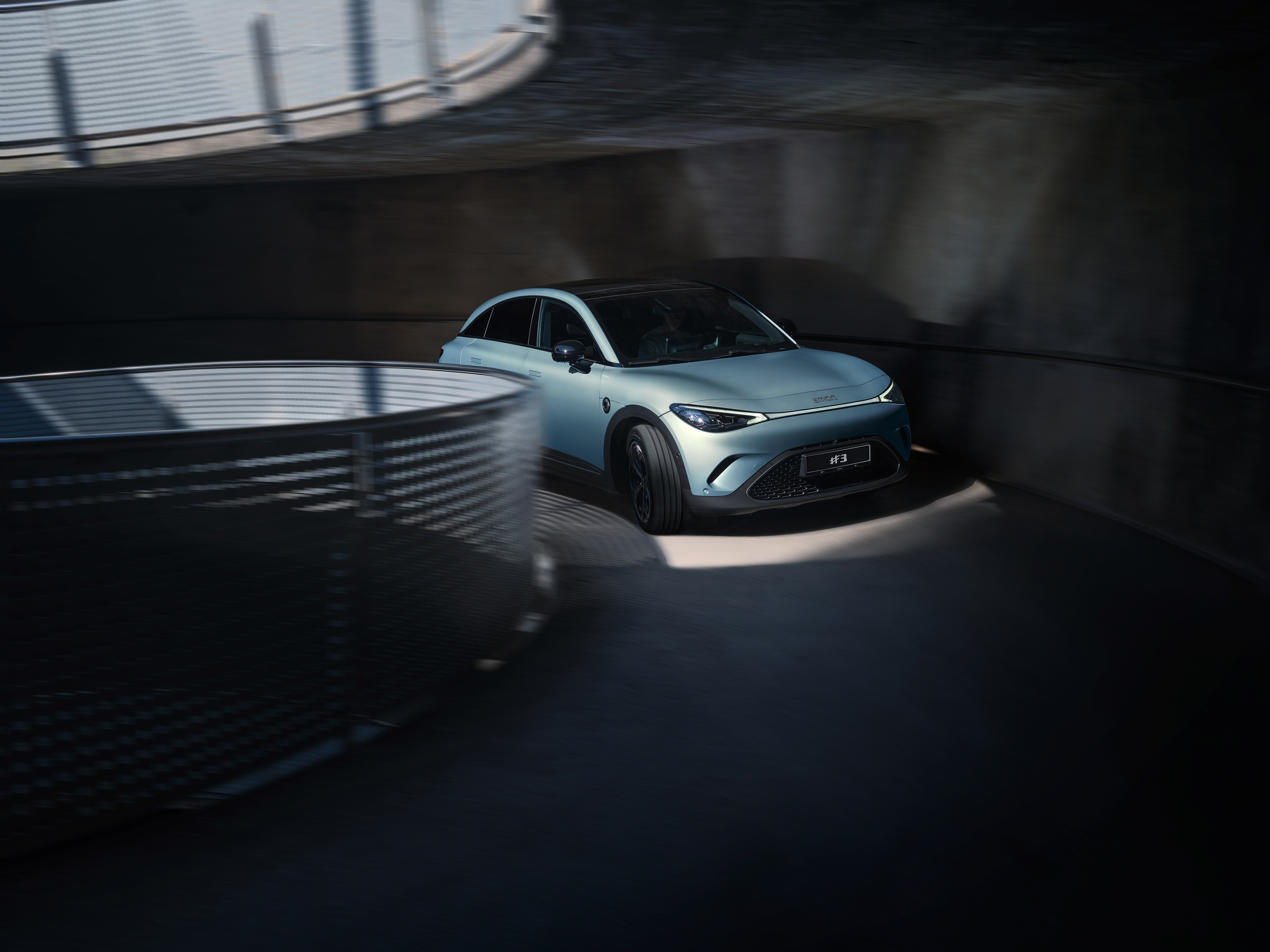 스마트 #3의 디자인은 공기역학적 성능을 향상시키기 위해 매끄럽고 부드러운 라인과 운동선수 같은 곡선으로 정의됩니다. 차체는 다양한 디테일로 더욱 강조됩니다. 전면부에는 슬림한 사이버스파크 LED 헤드라이트가 독특한 '샤크 노즈'와 A자형 와이드 그릴과 조화를 이룹니다. 측면에는 눈에 띄는 투톤 루프가 팽팽하게 당겨진 활을 연상시키는 시그니처 라인과 만나 매끄럽고 우아한 스포티 패스트백 실루엣을 완성합니다. 스포일러, C필러, 리어 펜더가 범퍼와 어우러져 모던한 곡선을 연출하고, 픽셀화된 요소의 테일라이트가 고급스러운 느낌을 더합니다.