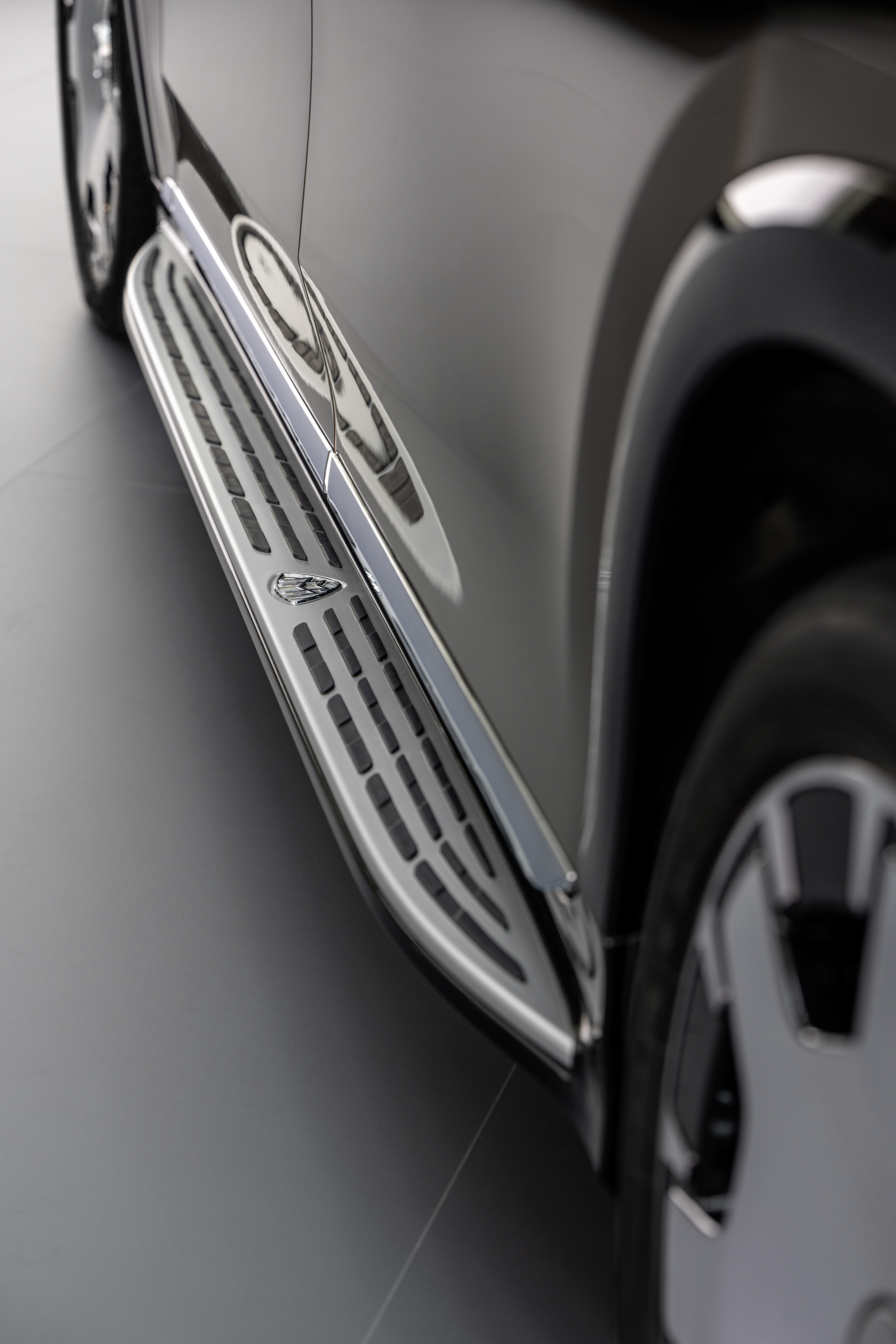 측면에서 보면 사이드 윈도우의 대담한 크롬 서라운드와 크롬 도금된 B 필러 트림이 눈에 띄는 특징입니다. 이 장식 요소는 메르세데스-마이바흐 시그니처의 필수적인 부분이며 뒷좌석 공간의 길이를 강조합니다. D 필러의 마이바흐 엠블럼은 고급스러움을 강조합니다. 전면 유리창 삼각형에는 EQS 레터링이 섬세하게 통합되어 있습니다. 뚜렷한 휠 아치와 고광택 검정색 클래딩은 SUV의 파워와 감성적인 존재감을 강조합니다. 이에 걸맞게 메르세데스-마이바흐 EQS SUV에는 전용 21인치 또는 22인치 알로이 휠과 단조 휠이 장착되어 있습니다. 정교하게 디자인된 통합형 휠 허브 캡에는 MAYBACH 레터링이 새겨져 있습니다. 또 다른 눈길을 사로잡는 것은 어두운 곳에서 조명이 켜지는 표준 러닝 보드입니다. 트레드는 아노다이징 처리된 알루미늄으로 제작되어 블랙 패널 전면의 핀스트라이프와 조화를 이룹니다. 마이바흐 엠블럼도 여기에 스타일리시하게 통합되어 있습니다.
