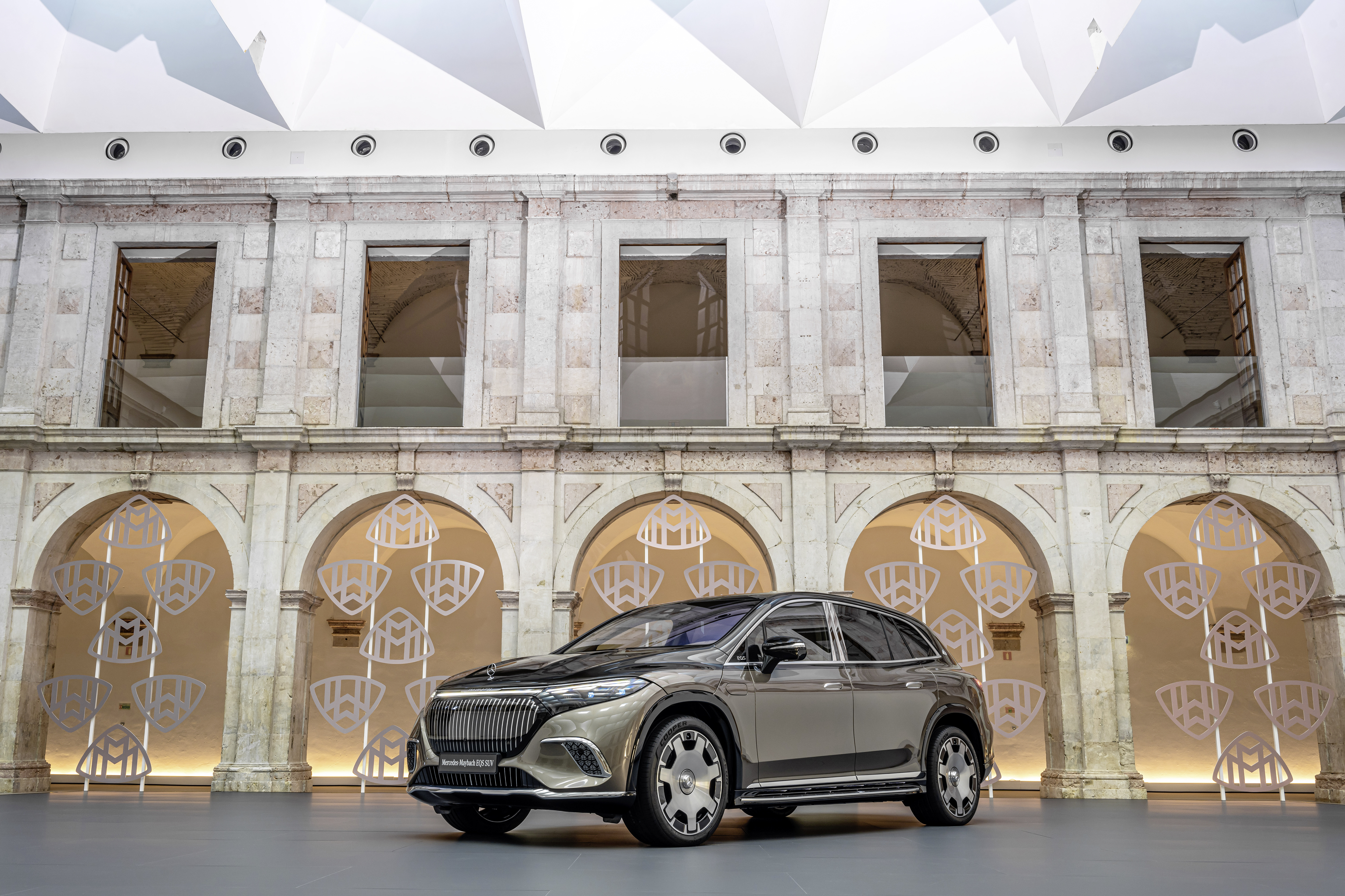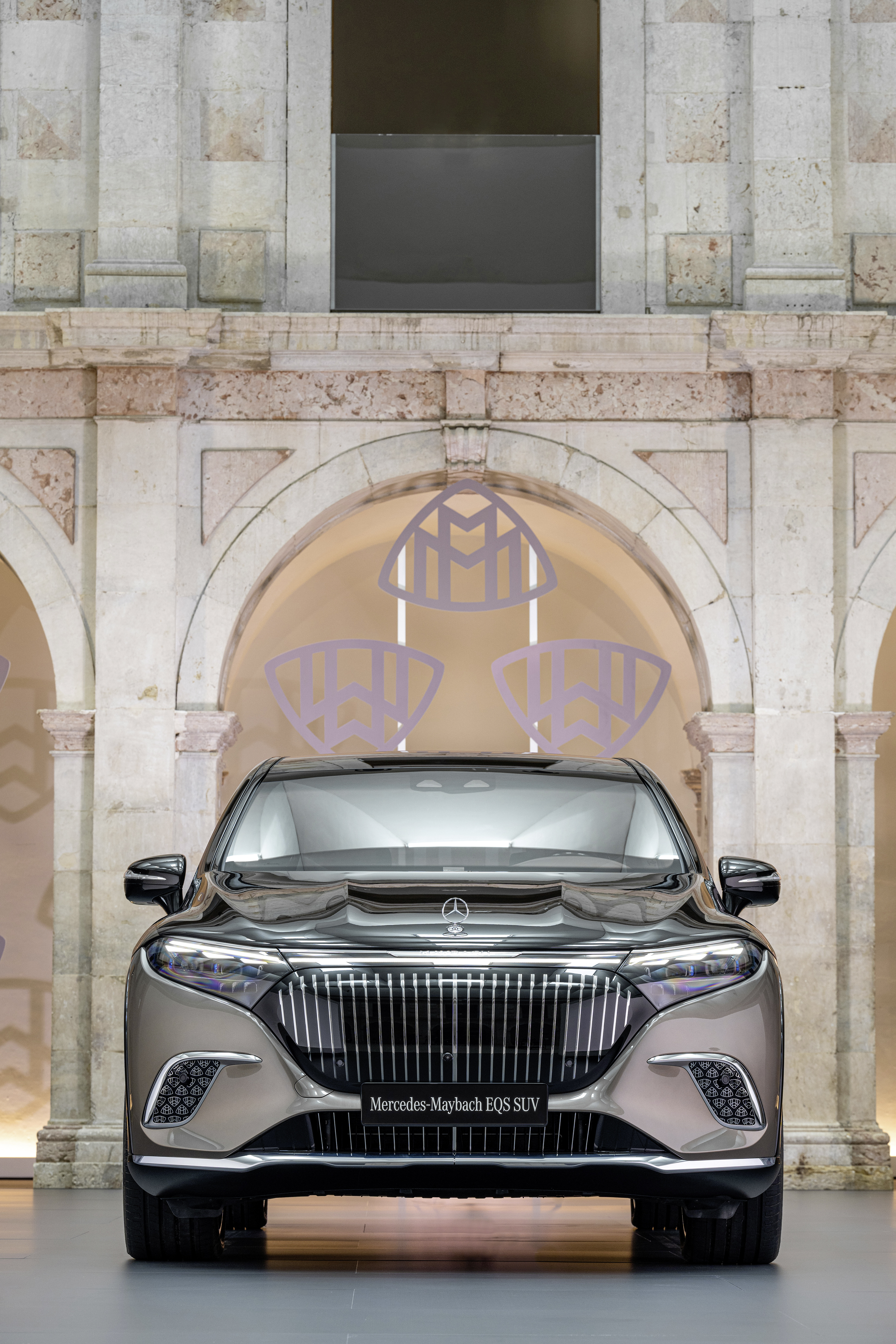 메르세데스-마이바흐는 메르세데스-마이바흐만의 개성을 부여하는 독점적인 요소로 메르세데스-벤츠 EQ의 SUV EQS의 다이내믹한 목적 디자인을 더욱 풍성하게 만듭니다. 메르세데스 스타가 후드에 자리 잡고 있어 위엄을 드러냅니다. 전면부는 브랜드 특유의 블랙 패널에 세로로 크롬 도금된 트림 스트립이 입체적인 깊이를 더하는 것이 특징입니다. 대형 블랙 패널은 처음으로 부드럽게 닫힙니다. 레이더 센서를 위한 하이테크 요소가 완전히 통합되어 더 이상 보이지 않습니다. 범퍼의 공기 흡입구에도 크롬 도금된 선조 세공 슬랫을 볼 수 있습니다. 클래식한 마이바흐 레터링은 크롬 도금 장식 스트립에 눈에 띄지 않게 통합되어 있으며, 기본 사양인 디지털 라이트 헤드라이트의 연속 라이트 스트립과 하나의 유닛을 형성합니다. 여러 개의 작은 브랜드 엠블럼이 있는 마이바흐 패턴은 사이드 범퍼의 트림 부분에서도 찾아볼 수 있습니다. DIGITAL LIGHT는 특별한 라이트 쇼로 운전자를 환영하고 작별 인사를 합니다. 또 다른 인사로 4개의 도어에 마이바흐 패턴의 애니메이션 프로젝션이 빛을 발합니다.
