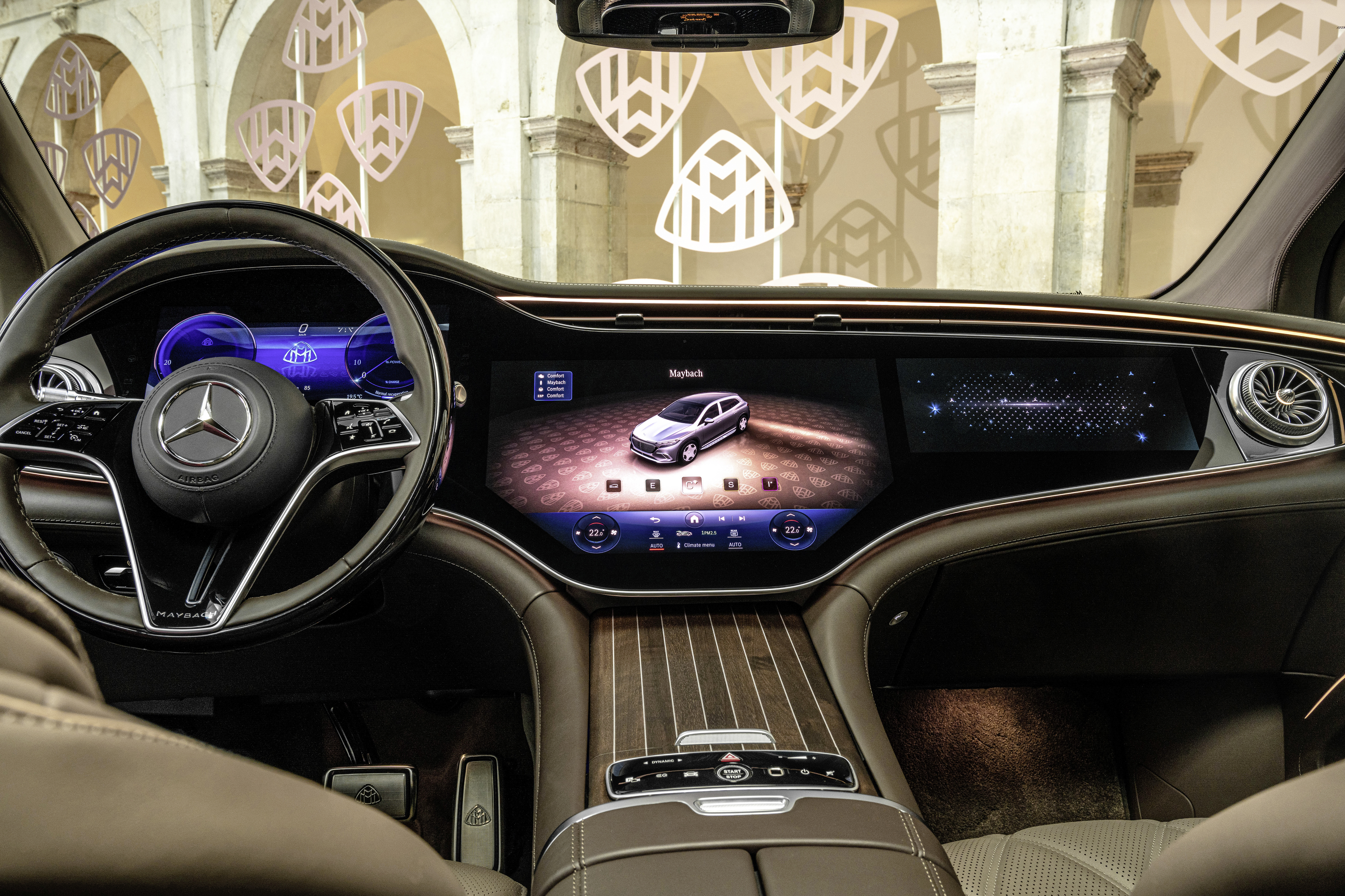 세 디스플레이의 기능적 콘텐츠와 작동 구조는 모두 메르세데스-벤츠 EQ의 EQS SUV와 일치합니다. 외관은 세 가지 디스플레이 스타일(디스크리트, 스포티, 메이바흐)과 세 가지 모드(내비게이션, 보조, 서비스)로 커스터마이징할 수 있습니다. 디스크리트 스타일에서는 콘텐츠가 최대한 줄어들고 선택한 주변 조명의 색상 변화와 조화롭게 조화를 이룹니다.