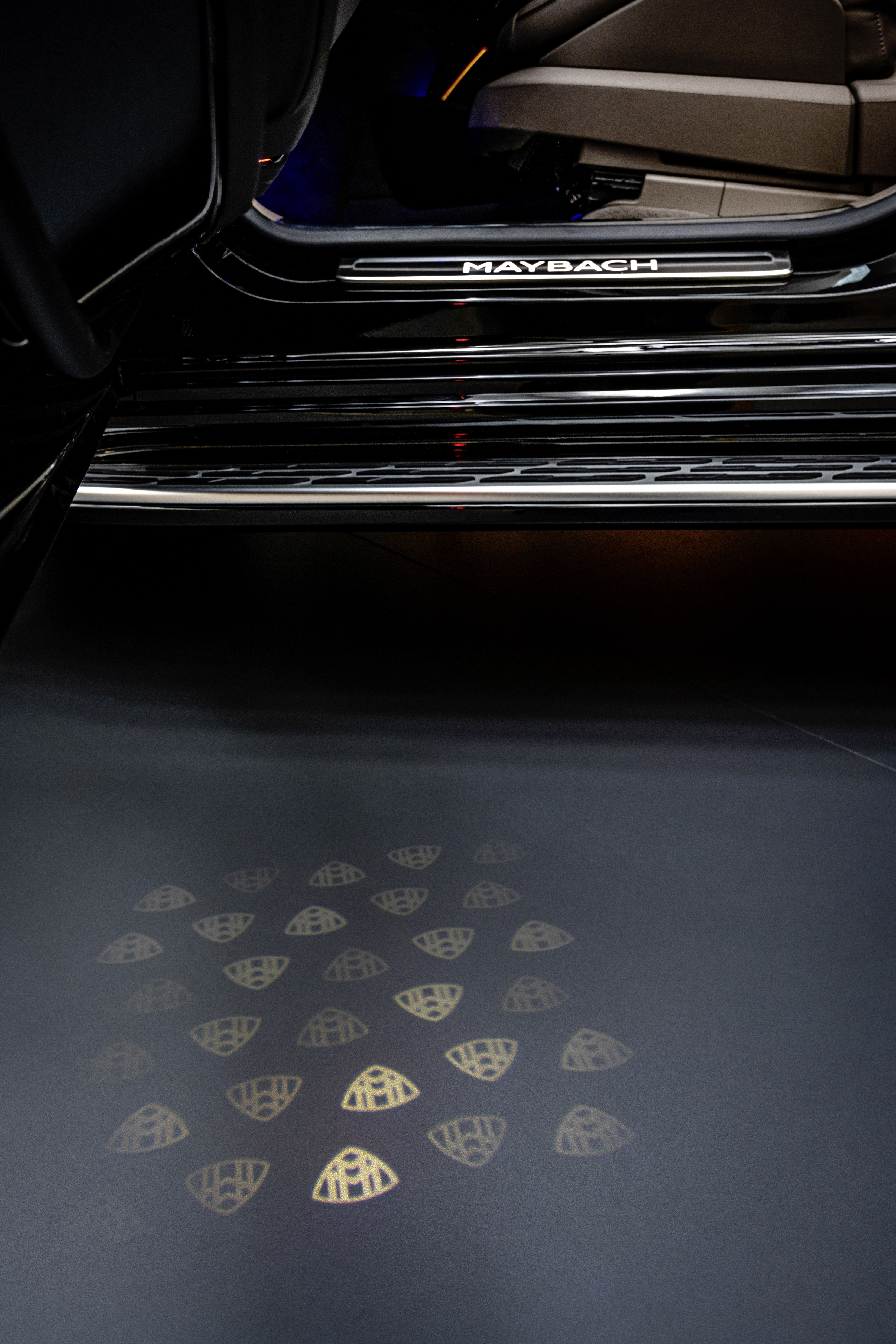 디자인 요소로 곳곳에 통합된 마이바흐 엠블럼은 브랜드 특유의 고급스러운 외관을 강조합니다. 스테인리스 스틸 페달 시스템, 헤드레스트의 쿠션, 앞좌석 등받이, 그리고 뒷좌석의 풋웰을 장식하고 있습니다. 퍼스트 클래스 리어와 함께 뒷좌석 사이의 우드 트림에서도 찾아볼 수 있습니다. 트렁크를 열면 테일게이트 안쪽 안감에서도 볼 수 있습니다. 브랜드 레터링은 스티어링 휠을 차별화하며, 스테인리스 스틸 도어 실에 조명을 비춰 모든 탑승객을 환영합니다.