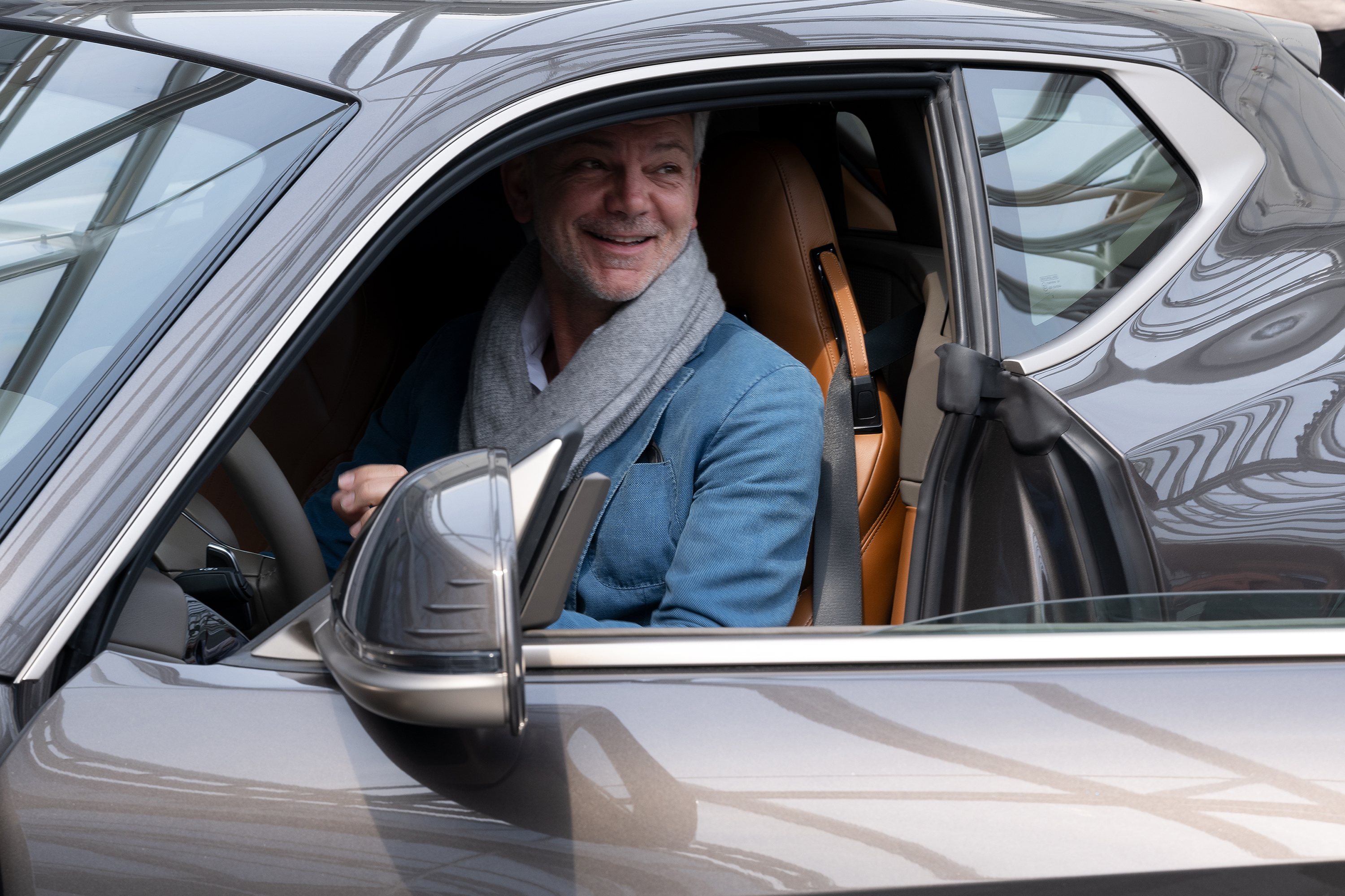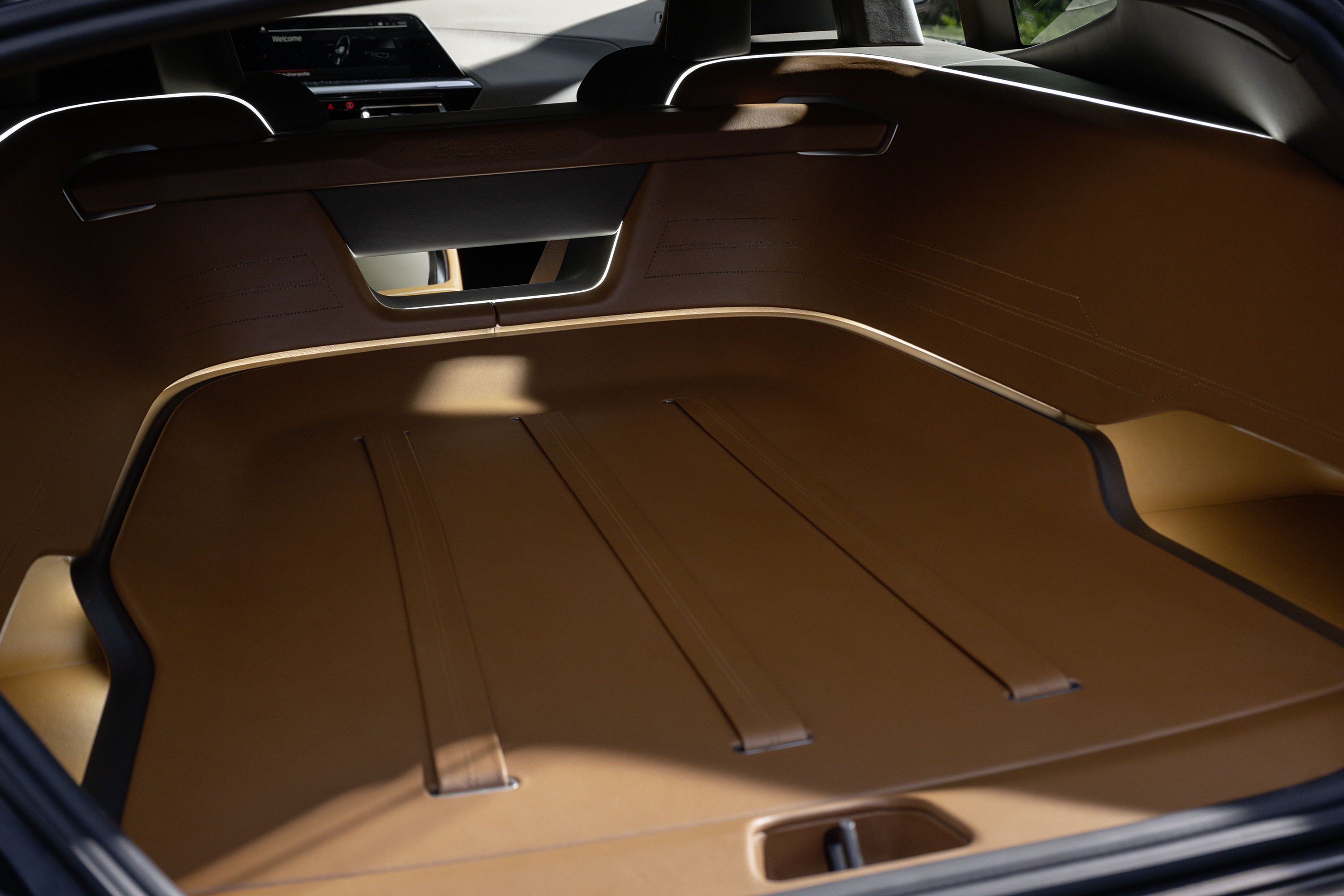 콘셉트 투어링 쿠페는 갈색 도장에 파란색 유리 조각이 박힌 독특한 "스파클링 라리오" 색상으로 마감되었습니다. 실버 브론즈 액센트와 수직 바가 있는 새로운 그릴이 색상을 보완하며, 20-스포크 알로이 휠은 앞 19인치, 뒤 20인치로 엇갈리게 배치되어 있습니다.