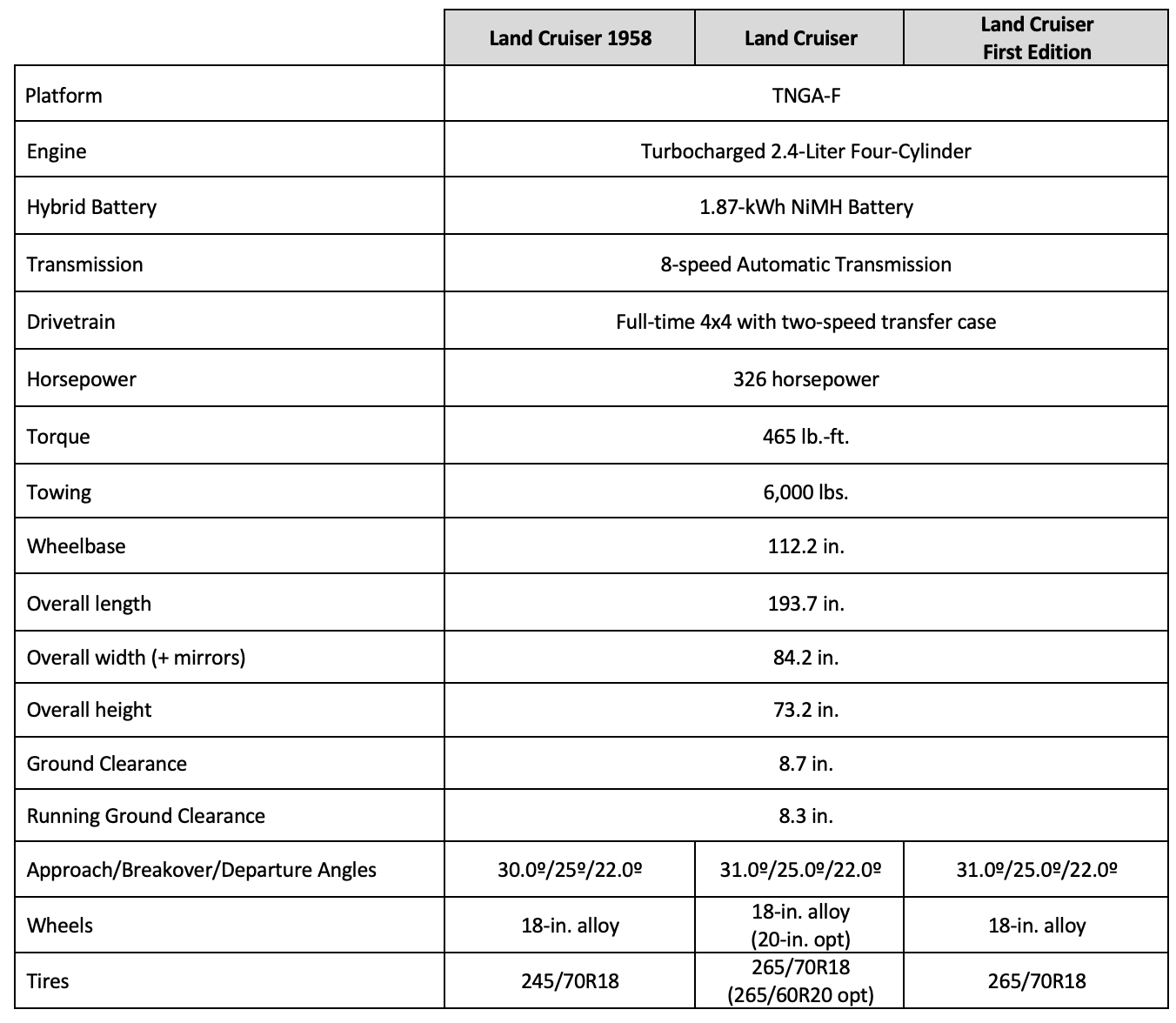 TNGA-F 글로벌 트럭 플랫폼을 기반으로 제작된 신형 랜드크루저는 가장 혹독한 환경에서도 견딜 수 있도록 설계, 엔지니어링 및 테스트를 거쳤습니다. 이 새로운 세대의 랜드크루저는 326마력과 465파운드-피트의 토크를 발휘하는 최고 출력의 i-FORCE MAX 하이브리드 파워트레인이 독점적으로 제공됩니다. 기존 200 시리즈 모델보다 약간 작고 폭이 좁아져 트레일에서 더욱 민첩하게 주행할 수 있으며, 최신 토요타 트럭에 적용된 오프로드 기술이 적용된 랜드크루저를 만나보세요. 생산 첫 두 달 동안 5,000대 한정으로 판매되는 랜드 크루저는 두 가지 새로운 투톤 페인트 색상과 추가 오프로드 장비가 포함된 퍼스트 에디션 등급으로 제공될 예정입니다.