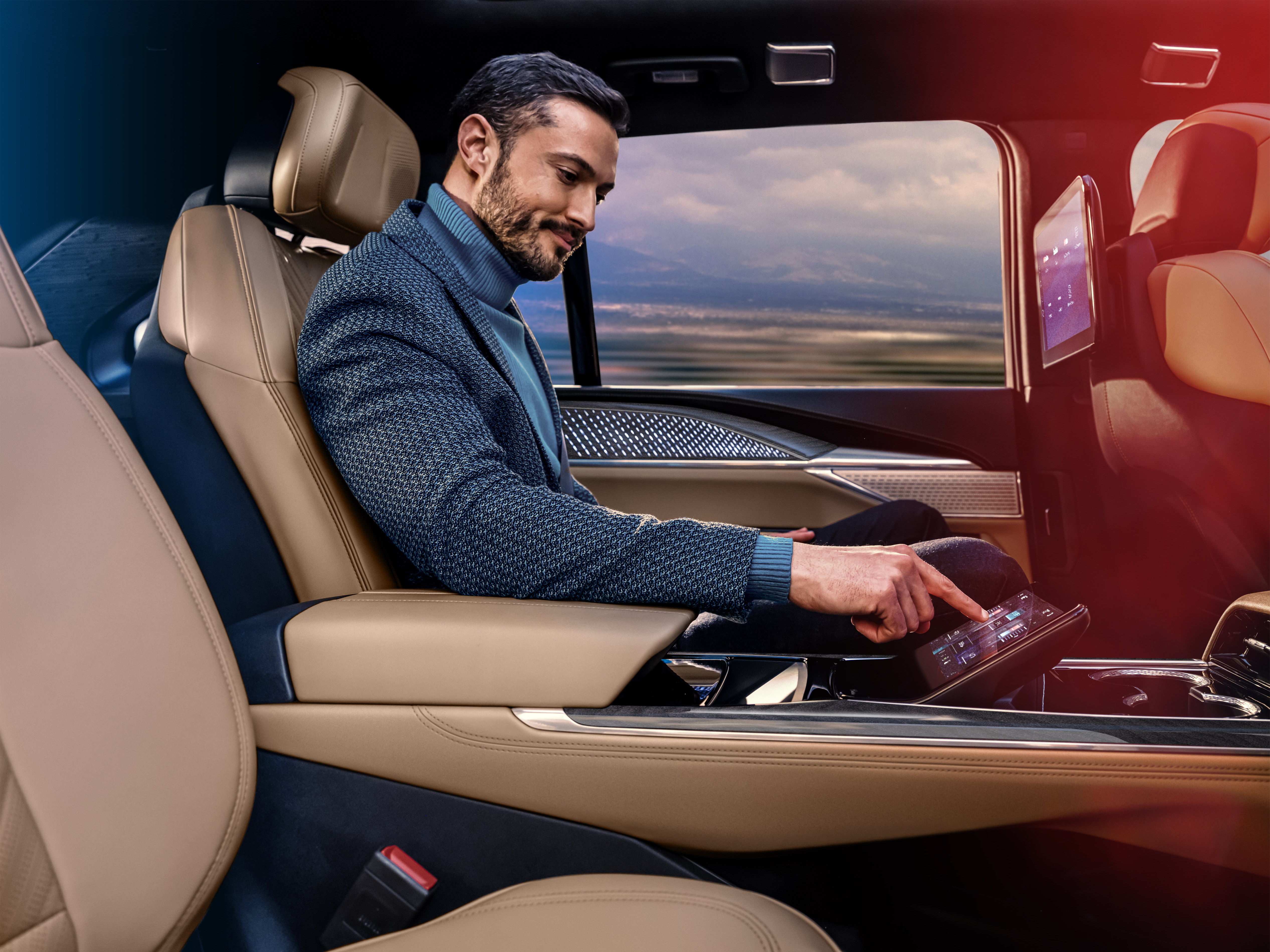 수납 가능한 트레이 테이블, 12.6인치 대각선 개인용 스크린, 리어 커맨드 센터 스크린, 듀얼 무선 휴대폰 충전 패드15, USB-C16 및 HDMI 포트, 마사지 시트, 헤드레스트 스피커 등의 기능이 포함된 이그제큐티브 2열 시트 패키지(선택 품목)는 아름다움과 업무 중심의 편안함이 조화를 이루는 디테일에 대한 세심한 배려가 돋보이는 선택 품목입니다.