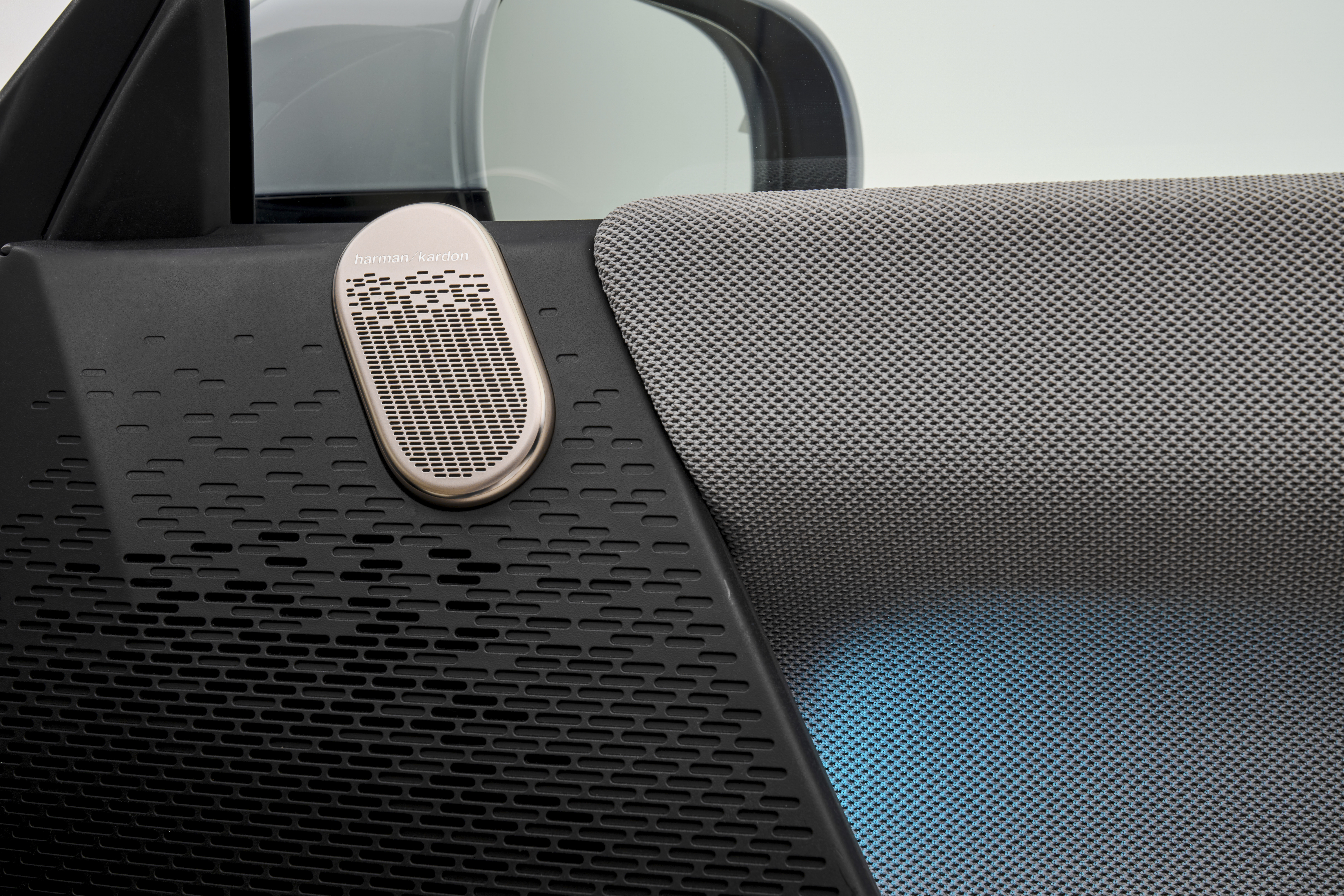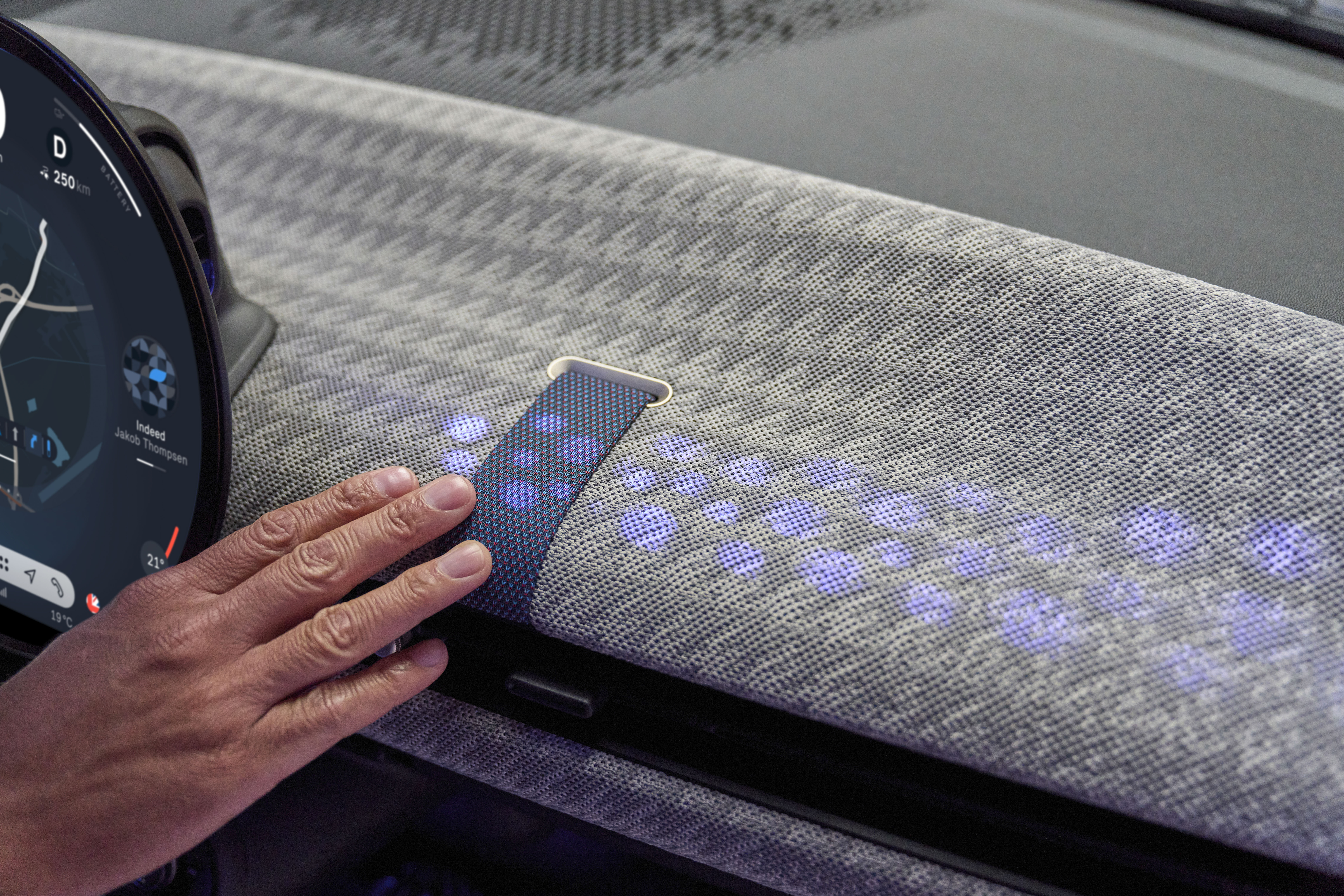 곡선형 대시보드에는 최초로 직물 표면이 적용되었으며, 특수 개발된 편직 공정을 통해 재활용 폴리에스터로 만든 두 가지 색상의 다용도 및 관리가 용이한 직물을 제작했습니다. 대시보드를 최대한 슬림하게 유지하기 위해 송풍구를 평평하게 배치했으며, 스티어링 휠 뒤에는 선택 품목인 헤드업 디스플레이를 통해 모든 관련 콘텐츠를 운전자의 시야에 표시합니다.