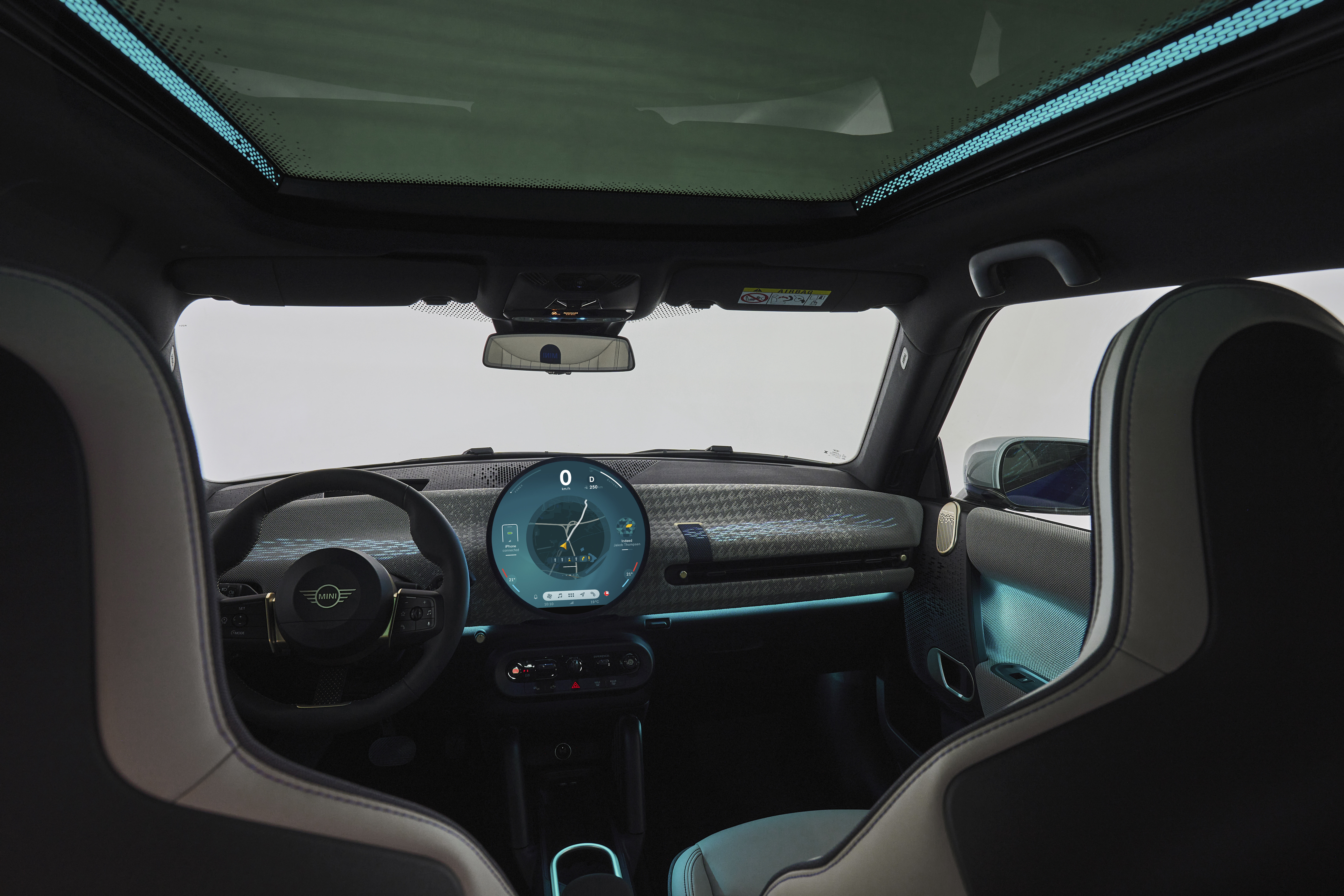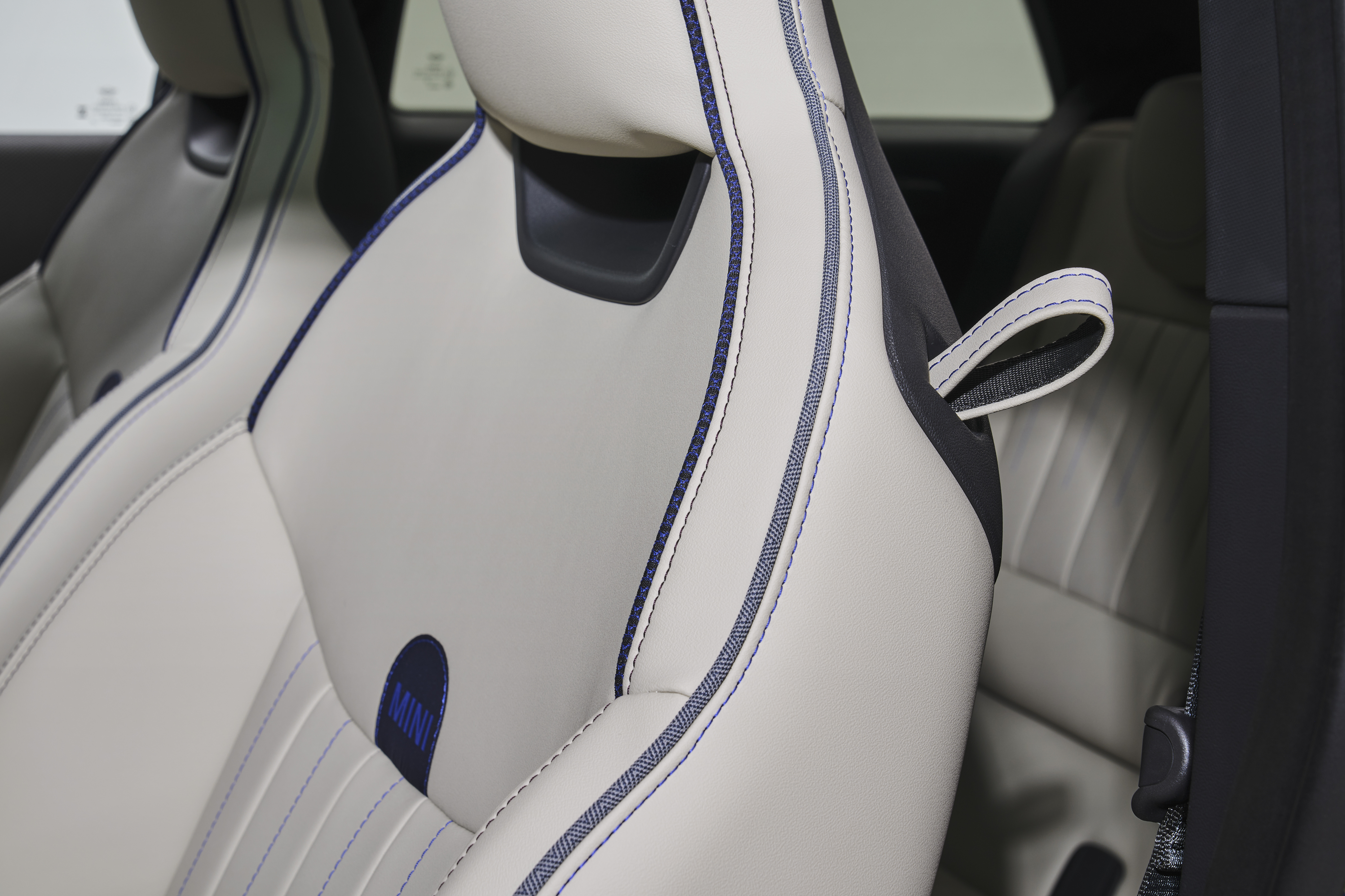 새롭게 디자인된 클래식, 익스클루시브, 스포츠의 세 가지 트림을 통해 고객들은 인테리어를 자신만의 취향에 맞게 선택할 수 있습니다. 클래식 트림의 경우, MINI는 최초로 생산 차량의 실내에 현대적인 2D 니트 직물을 적용했습니다. 고급 인조가죽 소재의 블랙 스포츠 시트에는 대시보드의 컬러 텍스타일 밴드와 어울리는 독특한 패턴의 멀티톤 텍스타일이 적용되었으며, 대시보드와 도어 핸들에는 투톤 블랙 니트 소재가 적용되었습니다. 또한 이 트림에는 타공된 하운드투스 패턴이 특징인 회색과 검은색 소재를 선택할 수 있으며, 측면은 파란색 텍스타일로 대비를 이룹니다.