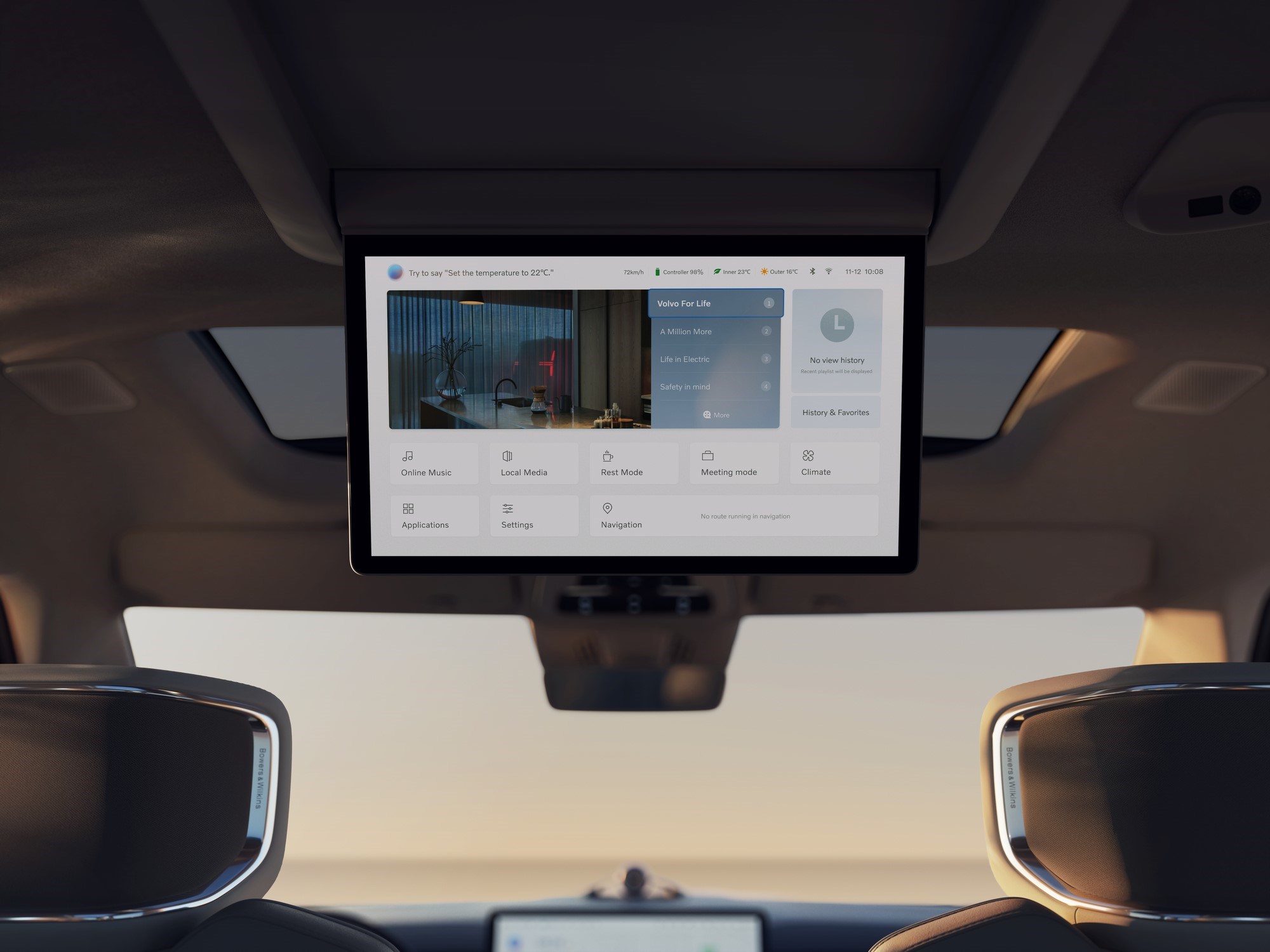 볼보 EM90은 볼보자동차의 첫 번째 순수 전기 프리미엄 MPV로, 단순한 이동뿐만 아니라 생활에 여유를 가져다주는 것을 목표로 하고 있으며, 3열 6인승이다. 팔걸이와 천연 원목에 장착된 터치스크린을 통해 개인 맞춤형 엔터테인먼트와 옵션을 조작할 수 있다.