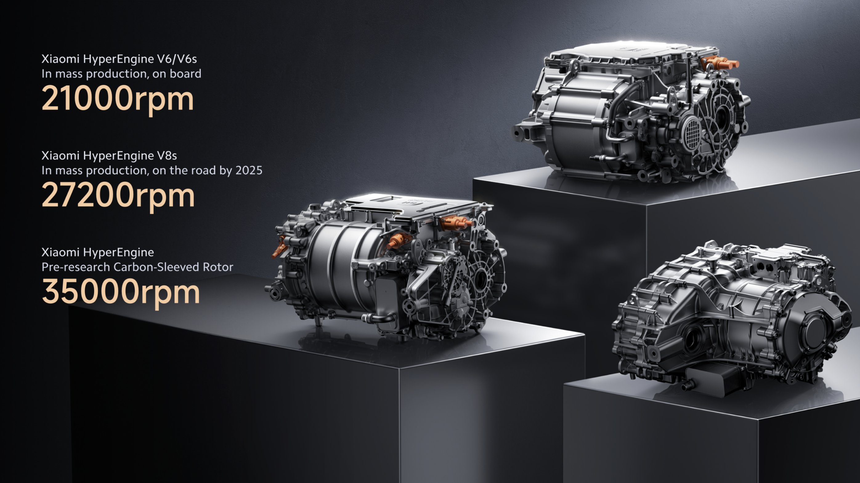 동력은 샤오미가 자체 개발한 전기 모터에서 나오는데, 기존 엔진 배열의 이름을 따서 V6, V6s, V8로 명명되었습니다.