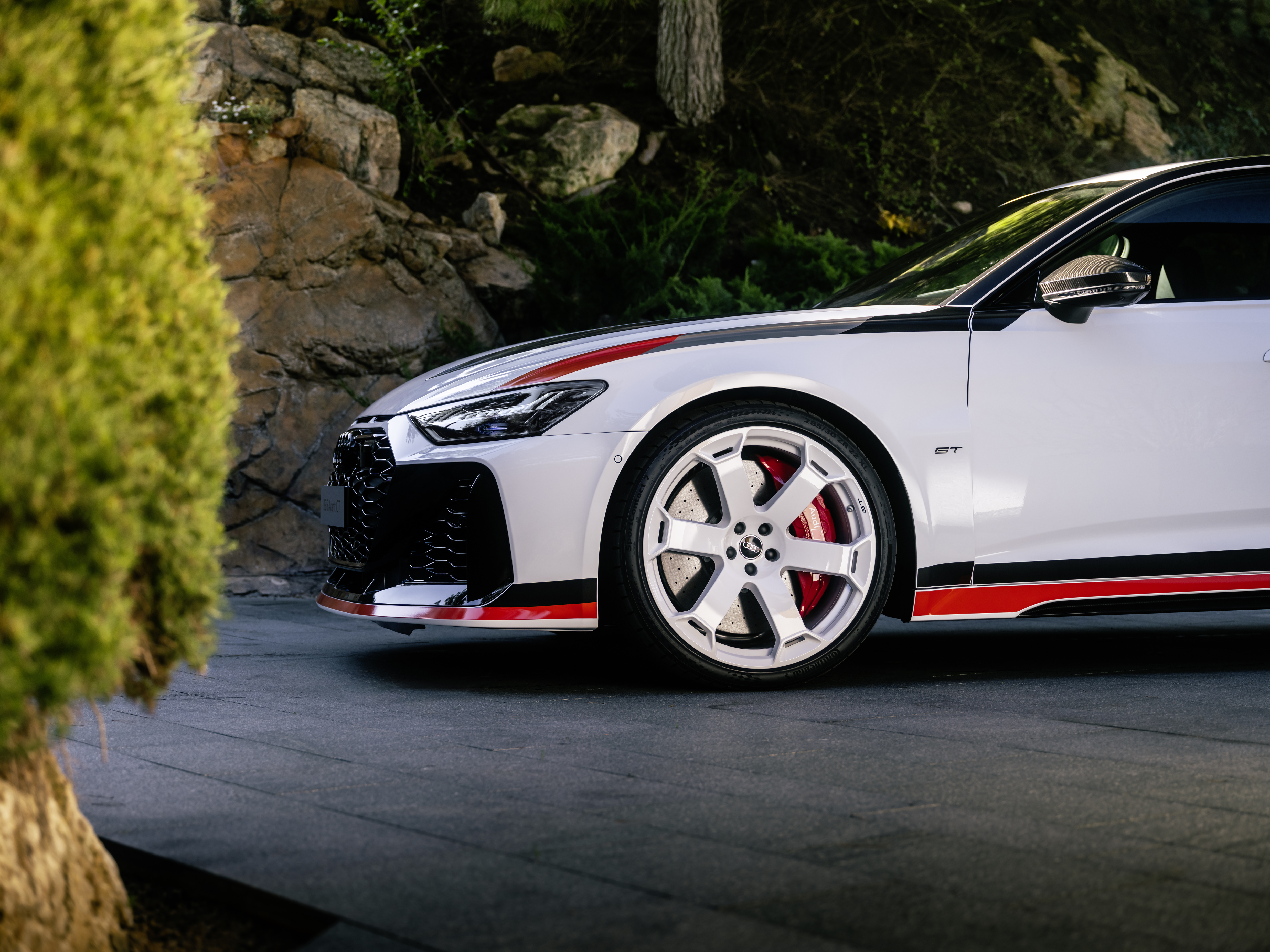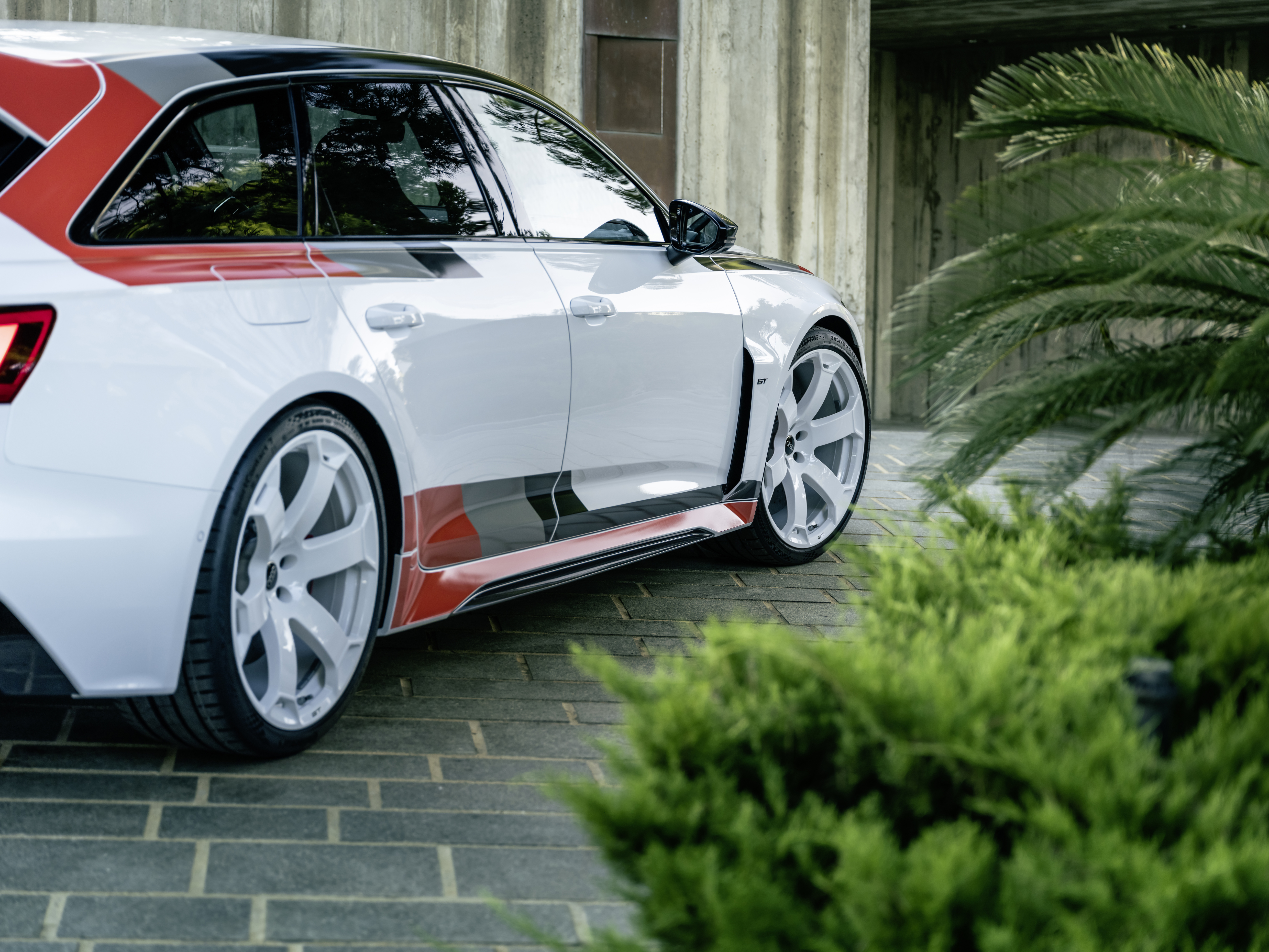 RS 6 아반트 GT의 경우, 고객은 두 가지 색상의 전용 데칼을 선택할 수 있습니다. 첫 번째는 아르코나 화이트 마감과 함께 아우디 스포츠의 전통적인 색상인 블랙, 그레이, 레드가 결합된 색상입니다. 전면과 후면의 모델 배지도 이 색상으로 제공됩니다. 이 색상 조합을 선택하면 독특한 디자인의 휠은 항상 고광택 흰색으로 제공됩니다. 또는 블랙과 그레이 톤의 데칼은 외장 컬러인 나르도 그레이 또는 미토스 블랙과 함께 제공되며, 휠은 무광 블랙으로 마감됩니다. 싱글프레임의 네 개의 링과 테일게이트, 그리고 모델 레터링은 블랙이 기본으로 적용됩니다. 외관은 다음과 같은 마감재를 선택할 수 있습니다: 아르코나 화이트, 나르도 그레이, 미토스 블랙 메탈릭.