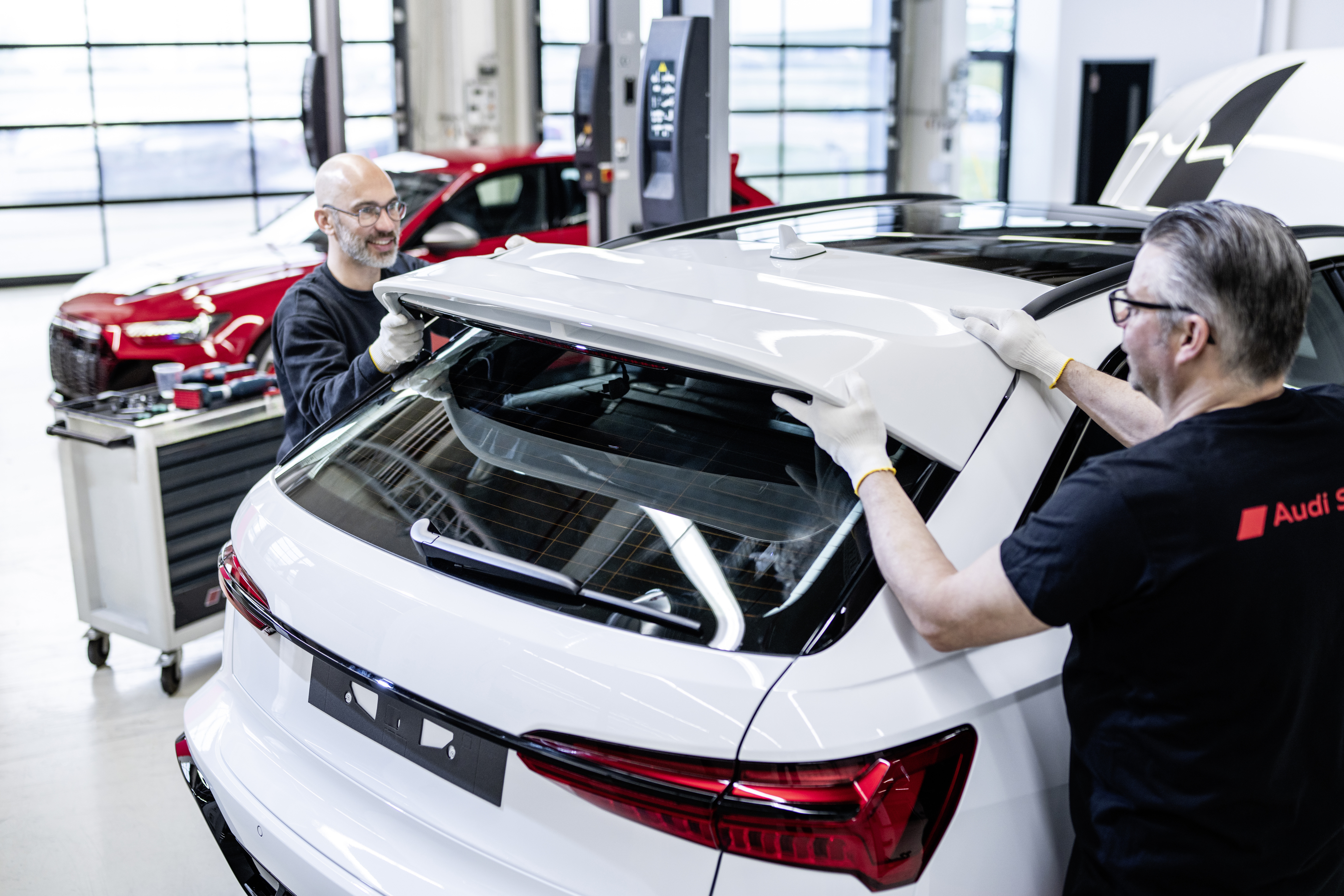 측면 디자인의 가장 큰 특징은 사이드 스커트의 인서트, 광택 카본으로 제작된 외부 미러 커버, RS 6 아반트 GT만을 위해 디자인된 6스포크 22인치 휠이다. 후면에는 블랙 ‘RS 6 GT’ 레터링, 시각적으로 낮아 보이도록 특별히 디자인된 테일게이트, 차체를 더욱 넓어 보이게 하는 수직 중앙 리플렉터가 포함된 기능성 디퓨저, 그리고 모터스포츠에서 영감을 받은 독특한 더블 윙이 두드러진다. 특히 더블 윙의 경우, RS 6 아반트 역사상 처음으로 루프 레일을 제거하여 더욱 평평하고 스포티한 실루엣을 구현했다.