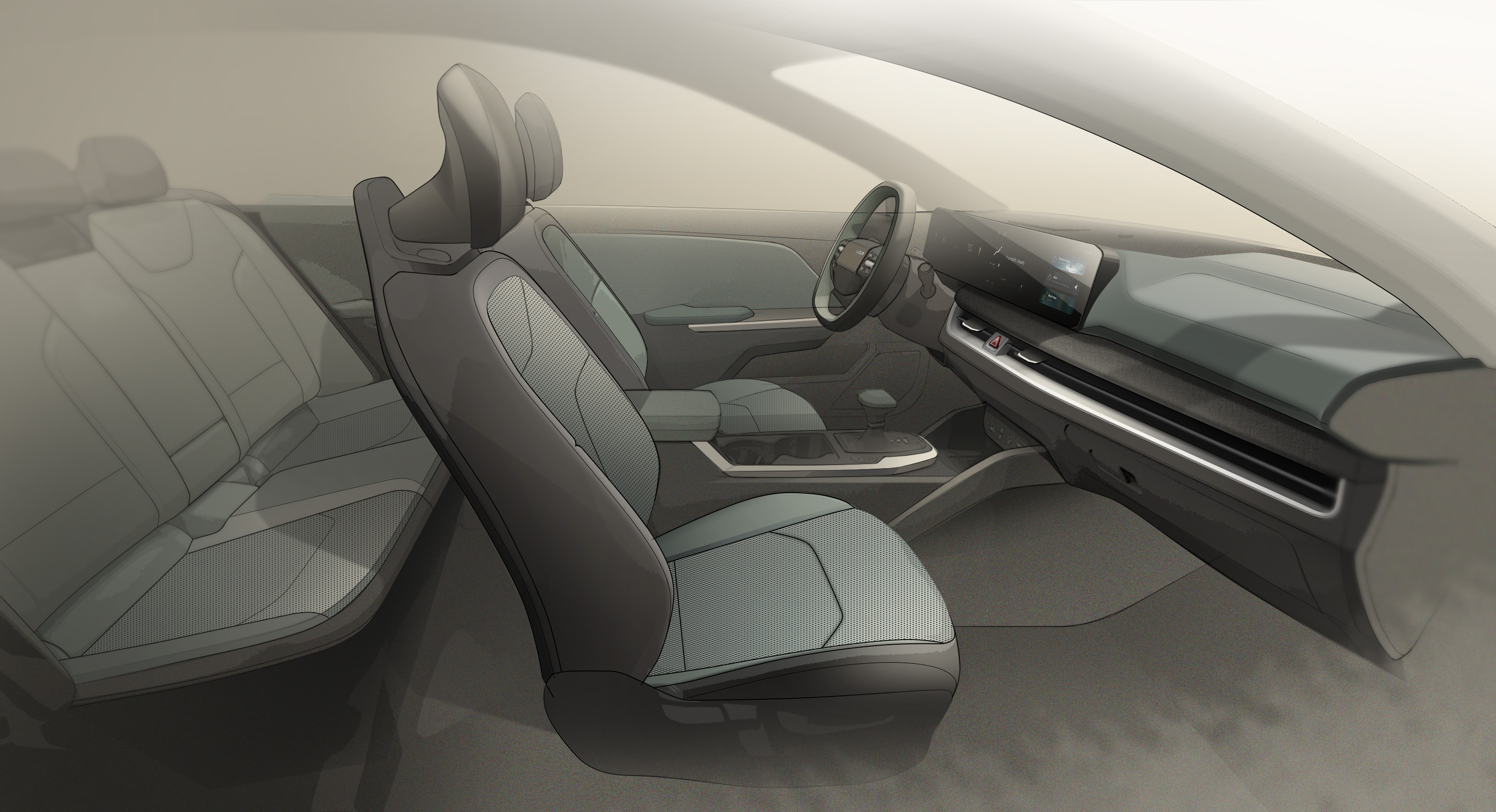 콤팩트 세단 부문에서 '예상되는' 것은 운전자 중심 인테리어인데, K4의 경우 운전자 지향 디자인 개념 자체에 도전하면서 '예상치 못한' 모습이 됩니다. 전통적인 운전자 지향 형태인 운전자를 향해 기울어진 화면과 컨트롤이 아니라, 이 인테리어는 대담한 그래픽 분할로 운전자와 탑승자를 분리합니다. 이 구분으로 두 공간이 명확해지는데, 기술적이고 기계적인 성격의 운전자 cockpit과 편안하고 인간적인 탑승자 캐빈입니다.