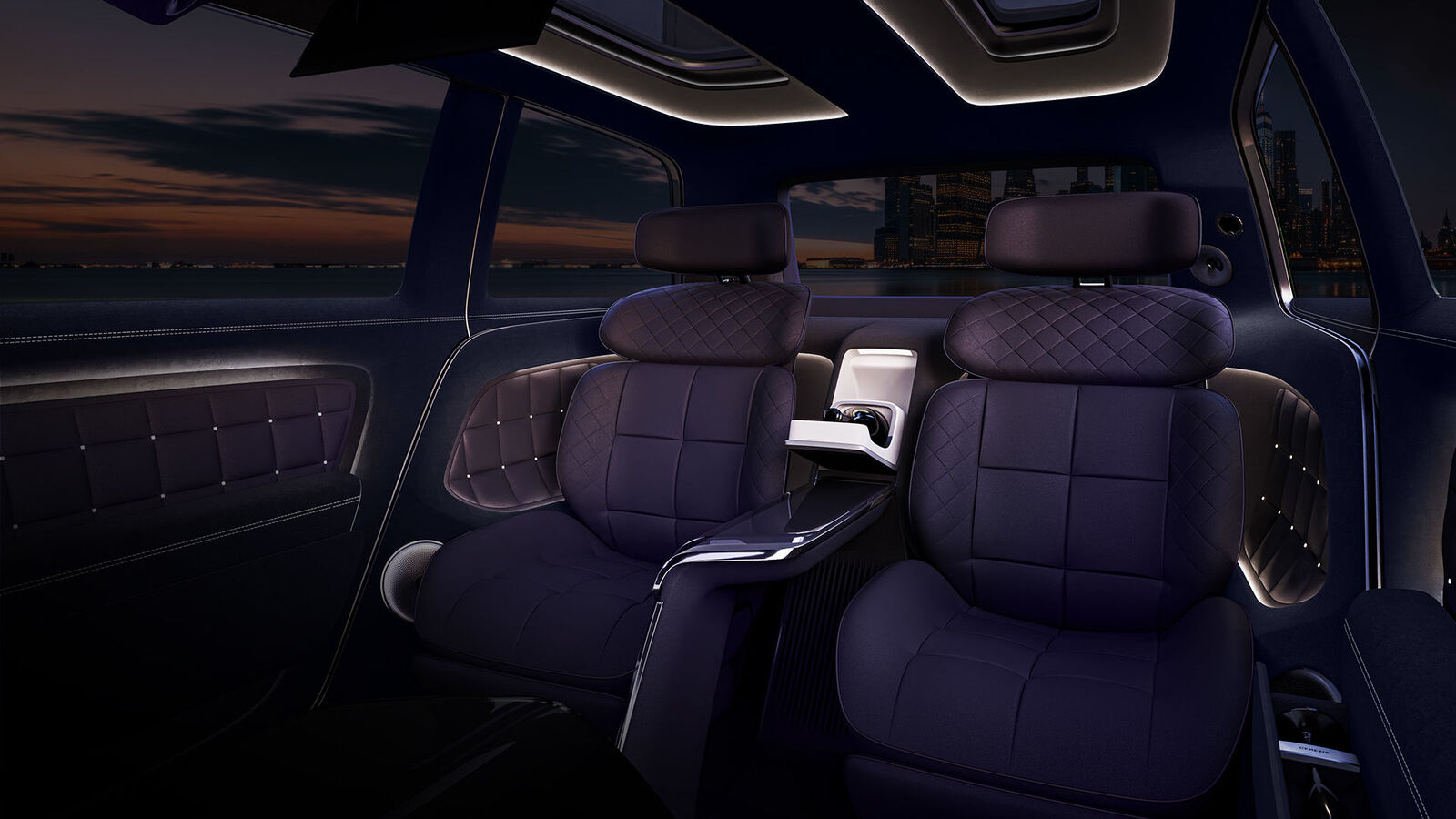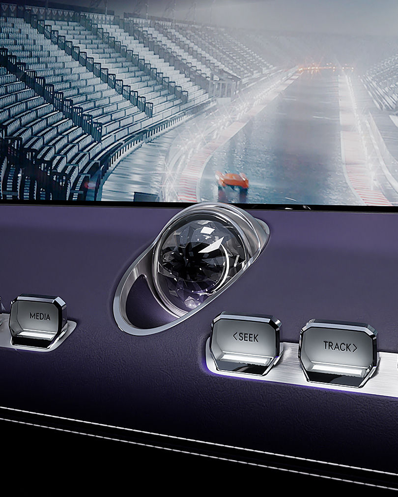 차량 전면에 자리한 ‘크리스탈 스피어 스피커’는 사용하지 않을 때는 실내 크리스탈 오브제로, 스피커 사용 시에는 고음역 트위터 스피커로 회전해 탑승자와 교감을 이뤄내는 요소로 구성했다.