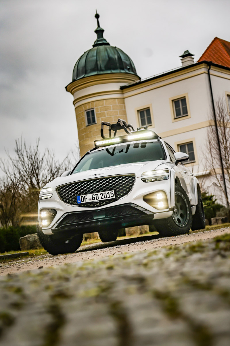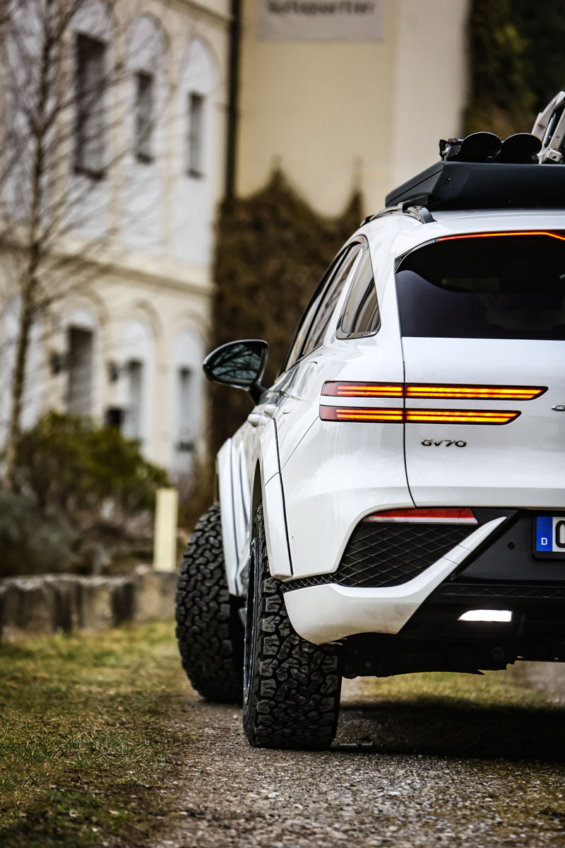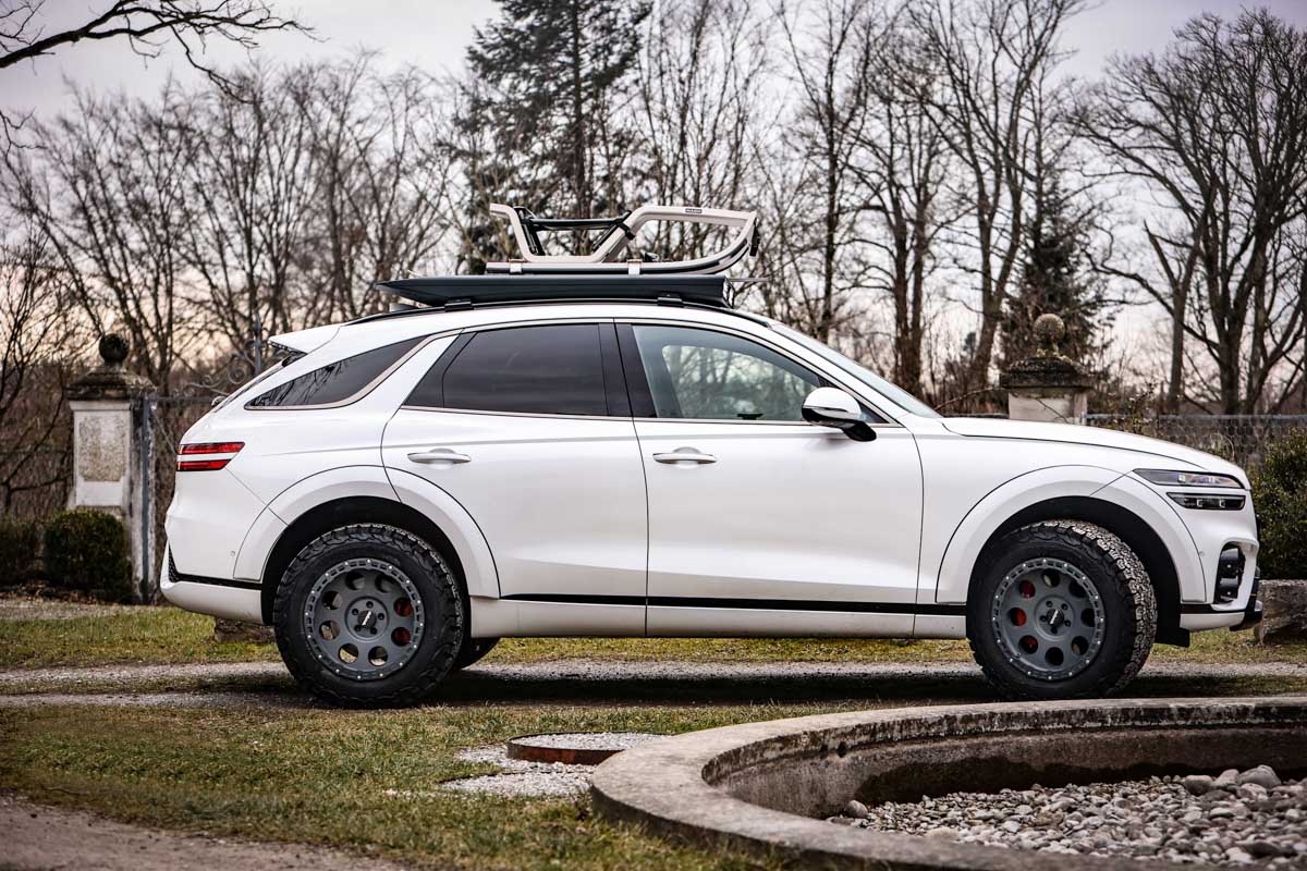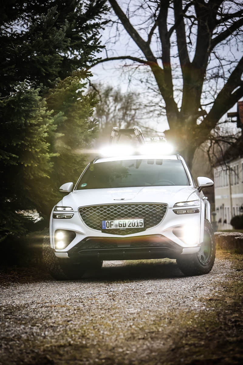 GV70 스노우는 제네시스와 오프로드 액세서리 전문업체인 독일 델타 4x4의 협업으로 탄생했습니다. 이 차량은 전천후 주행 가시성을 위해 40인치 LED 바 2개로 구성된 맞춤형 루프랙을 포함한 전문 윈터스포츠 장비를 갖추고 있습니다.