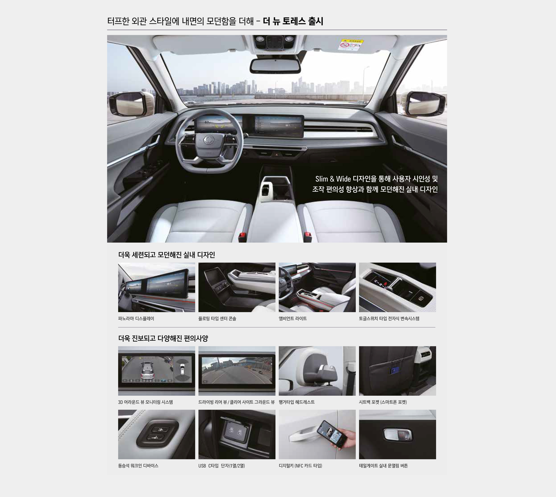 ‘더 뉴 토레스’의 실내 공간은 전면적인 변화를 통해 완전히 새로워진 인테리어를 자랑하며, Slim&Wide(슬림&와이드)를 바탕으로 한 인체공학적 디자인을 적용했다.