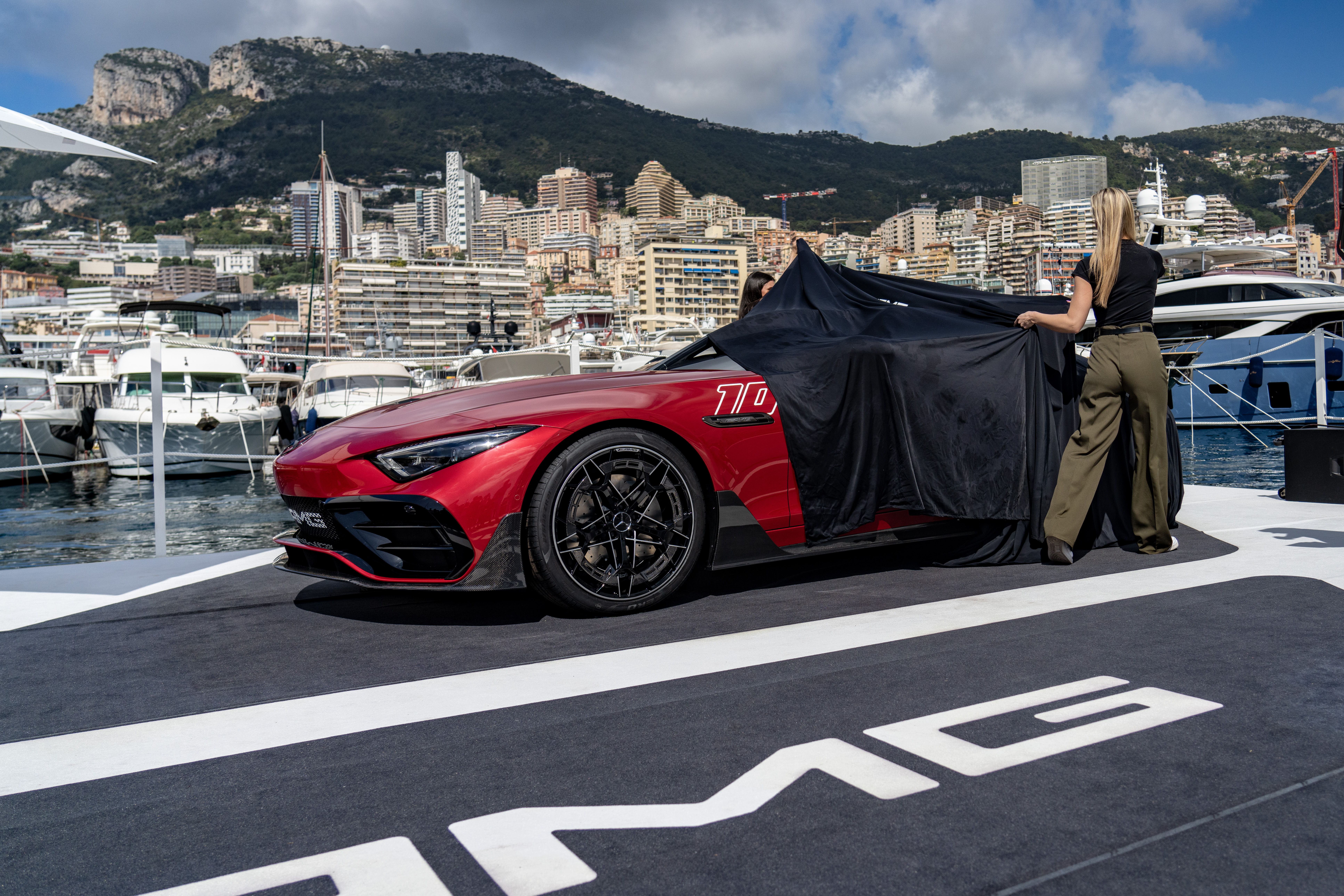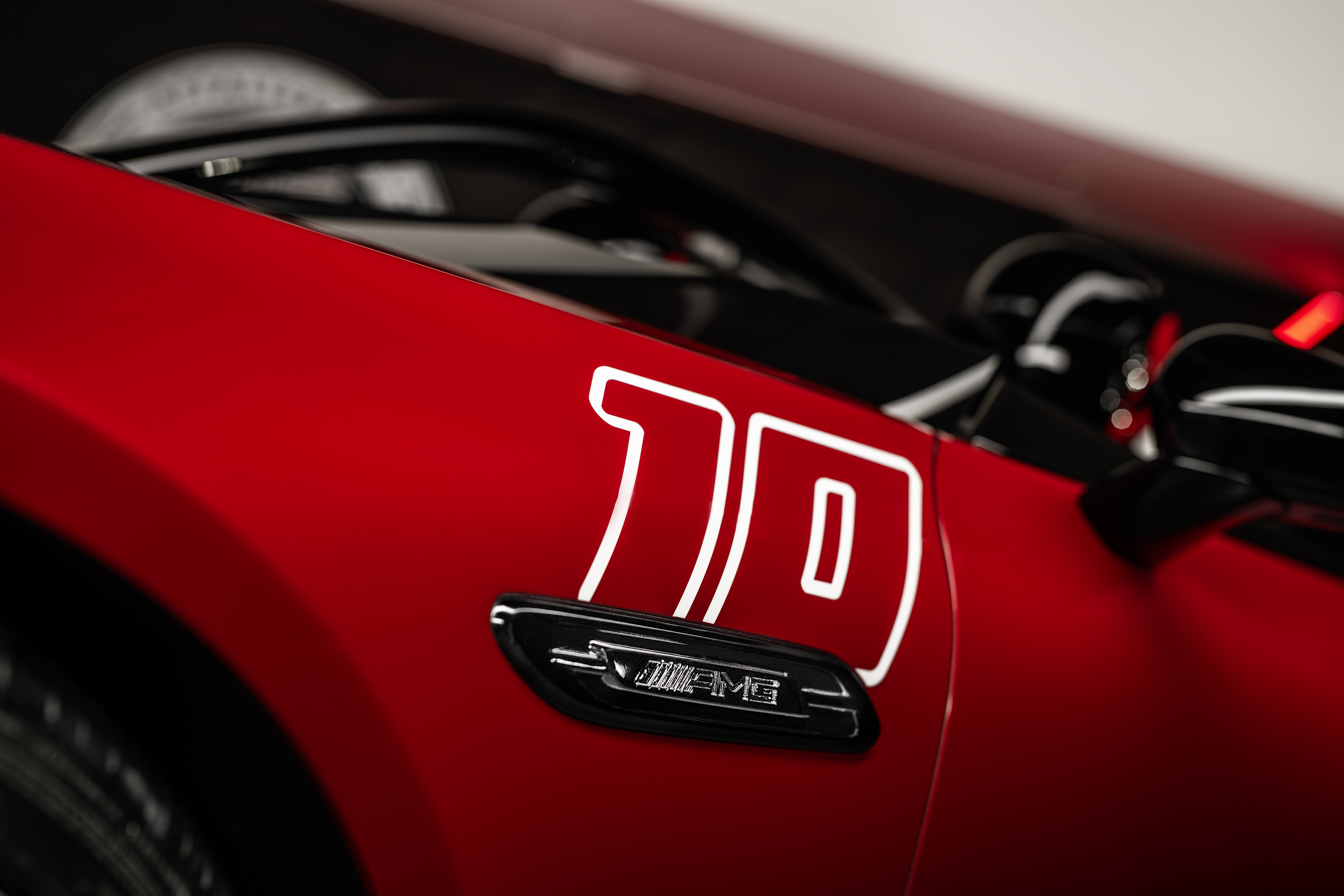 디자인에는 300 SLR을 연상시키는 시트 뒤 플라잉 버트레스를 비롯해 모터스포츠를 향한 오마주가 곳곳에 숨어있다. 눈길을 사로잡는 페인트 컬러는 1924년 타르가 플로리오 레이스에서 우승한 메르세데스 차량에서 영감을 얻었다. 르망 레드에서 그라파이트 그레이로 그라데이션되며 블랙 AMG 패턴이 더해졌다. 100년 전 타르가 플로리오 우승을 기념하는 레이스 넘버 '10'도 프런트 윙 양쪽에서 발견할 수 있다.