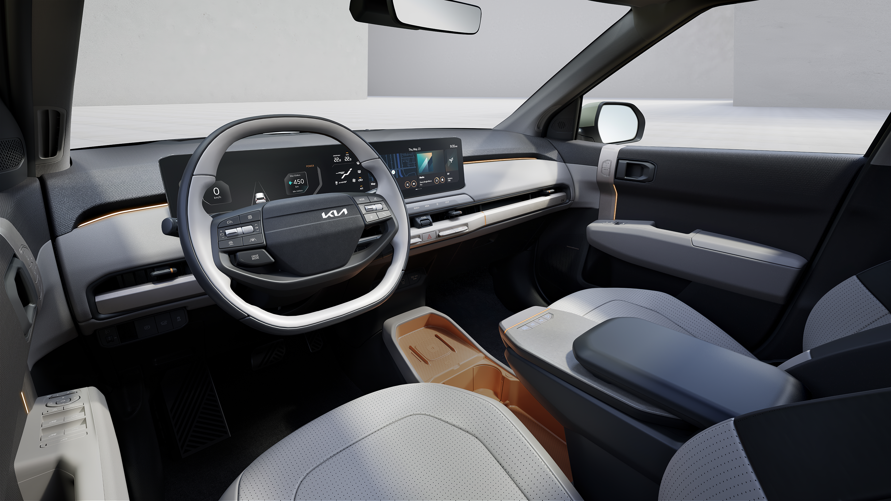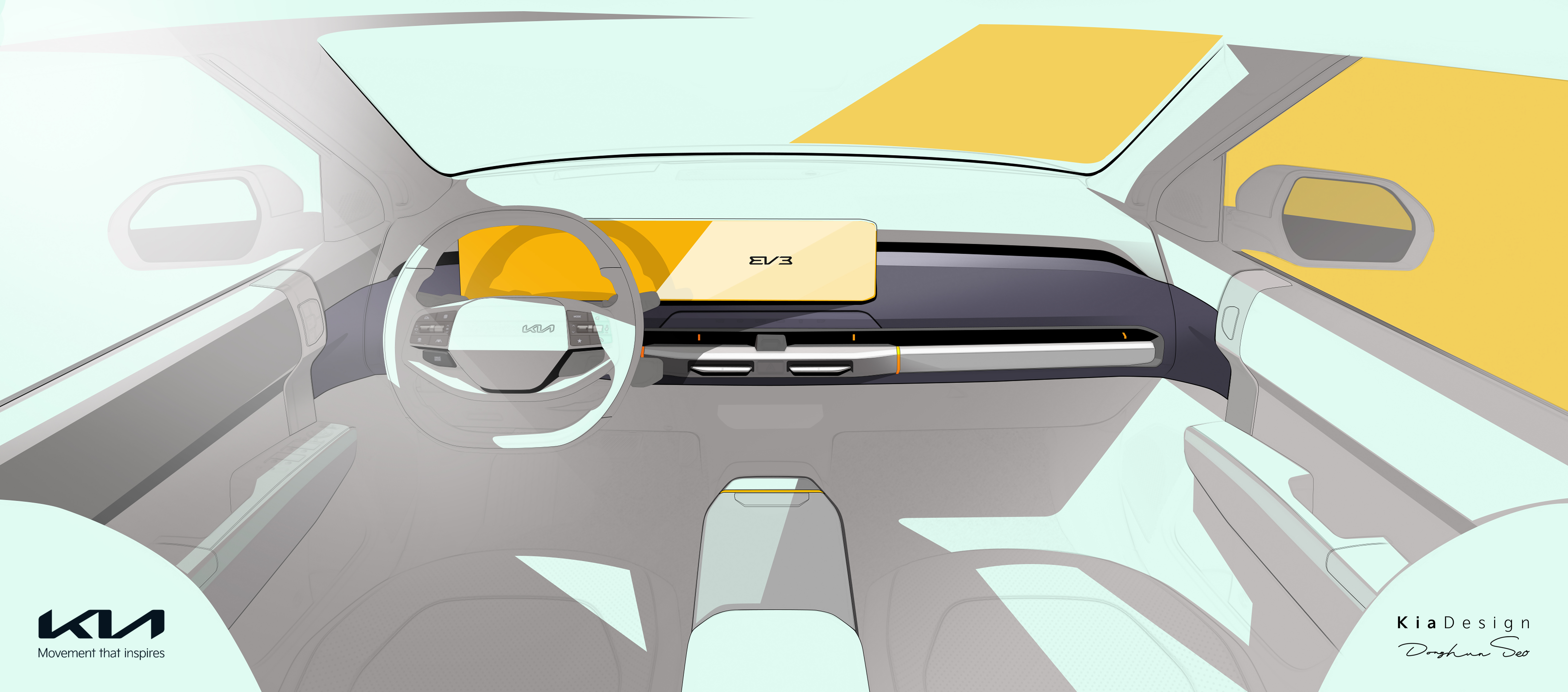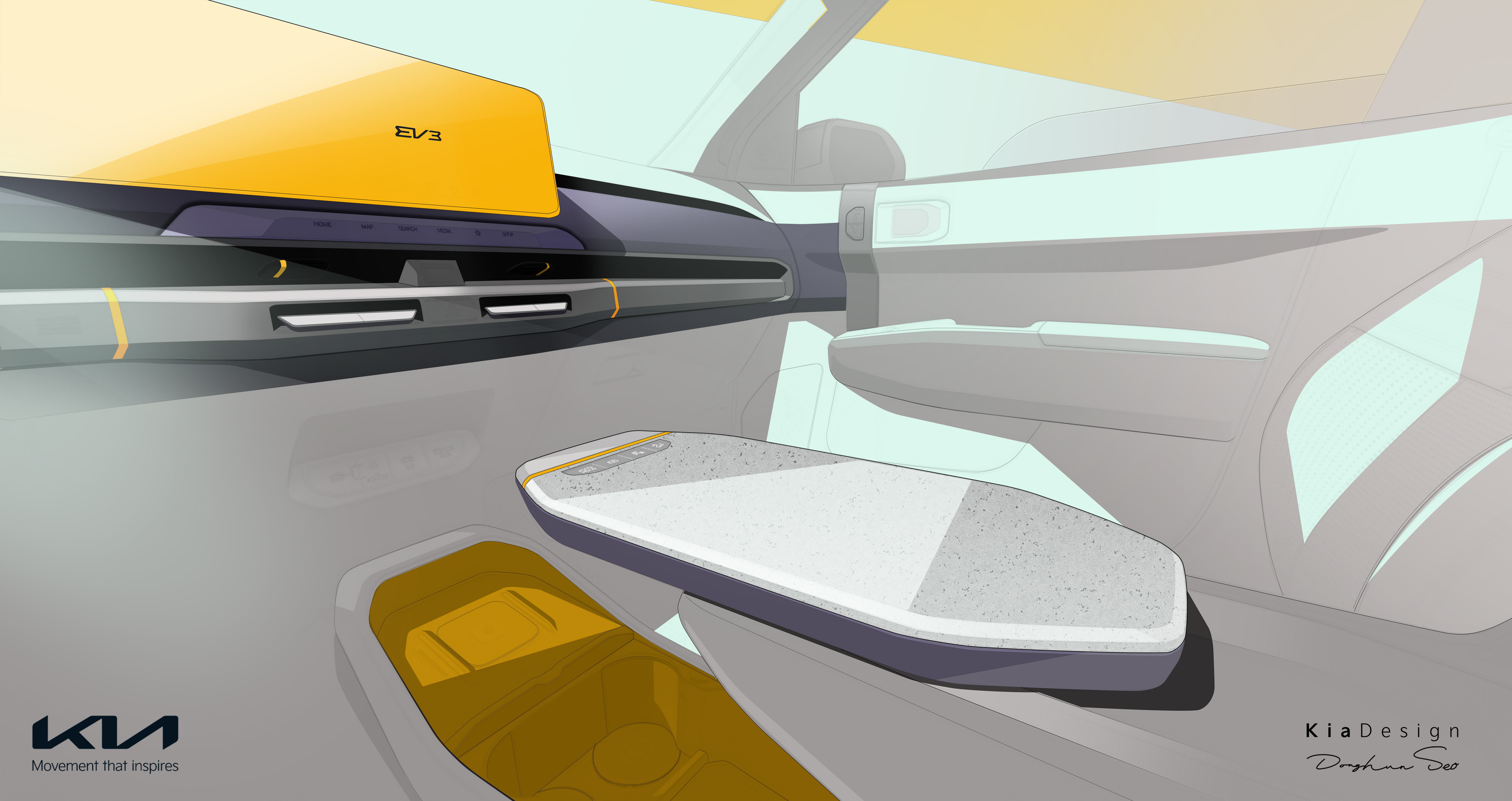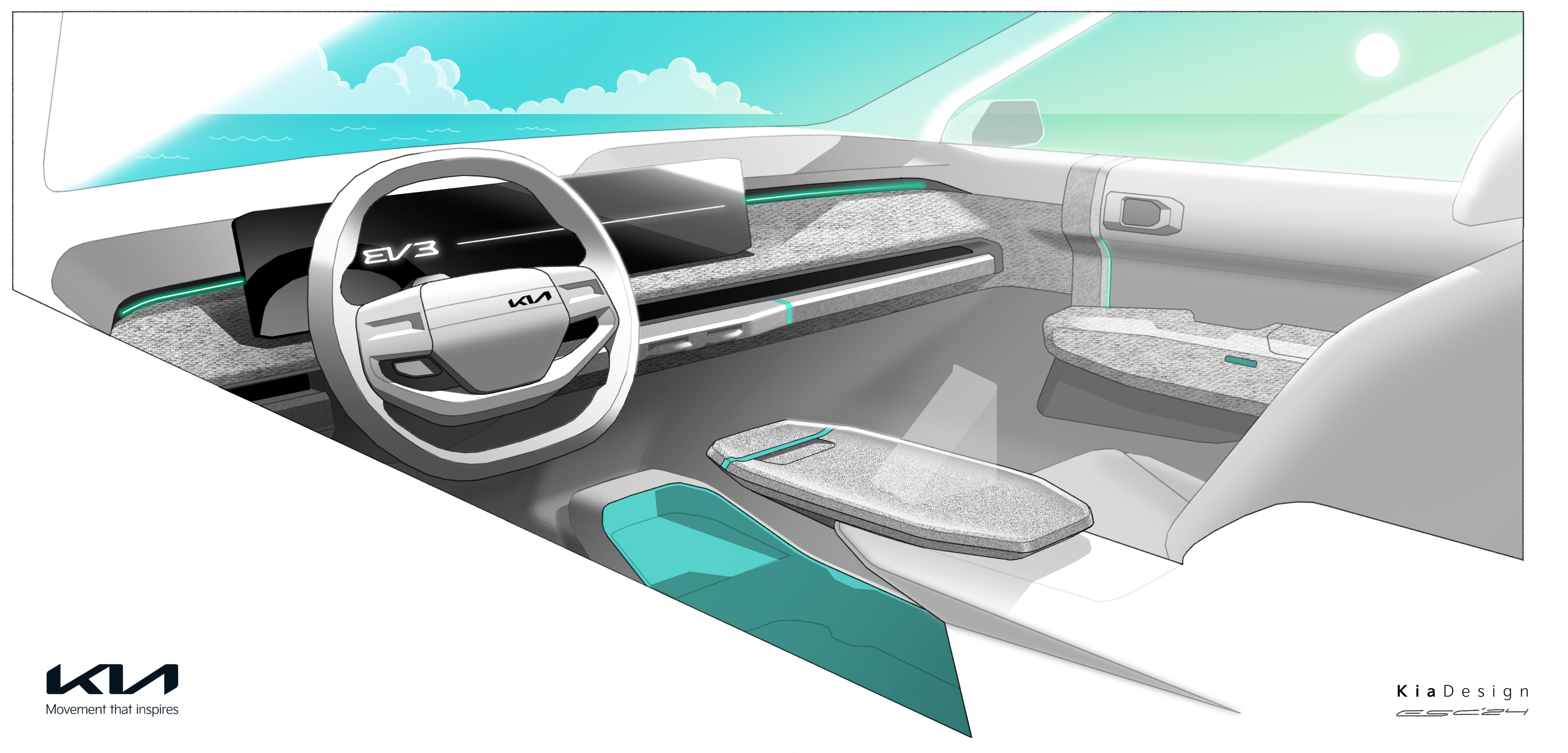 기아는 EV3의 실내를 간결한 디자인을 바탕으로 고객의 다양한 사용 목적을 충족시킬 수 있도록 구성했다.