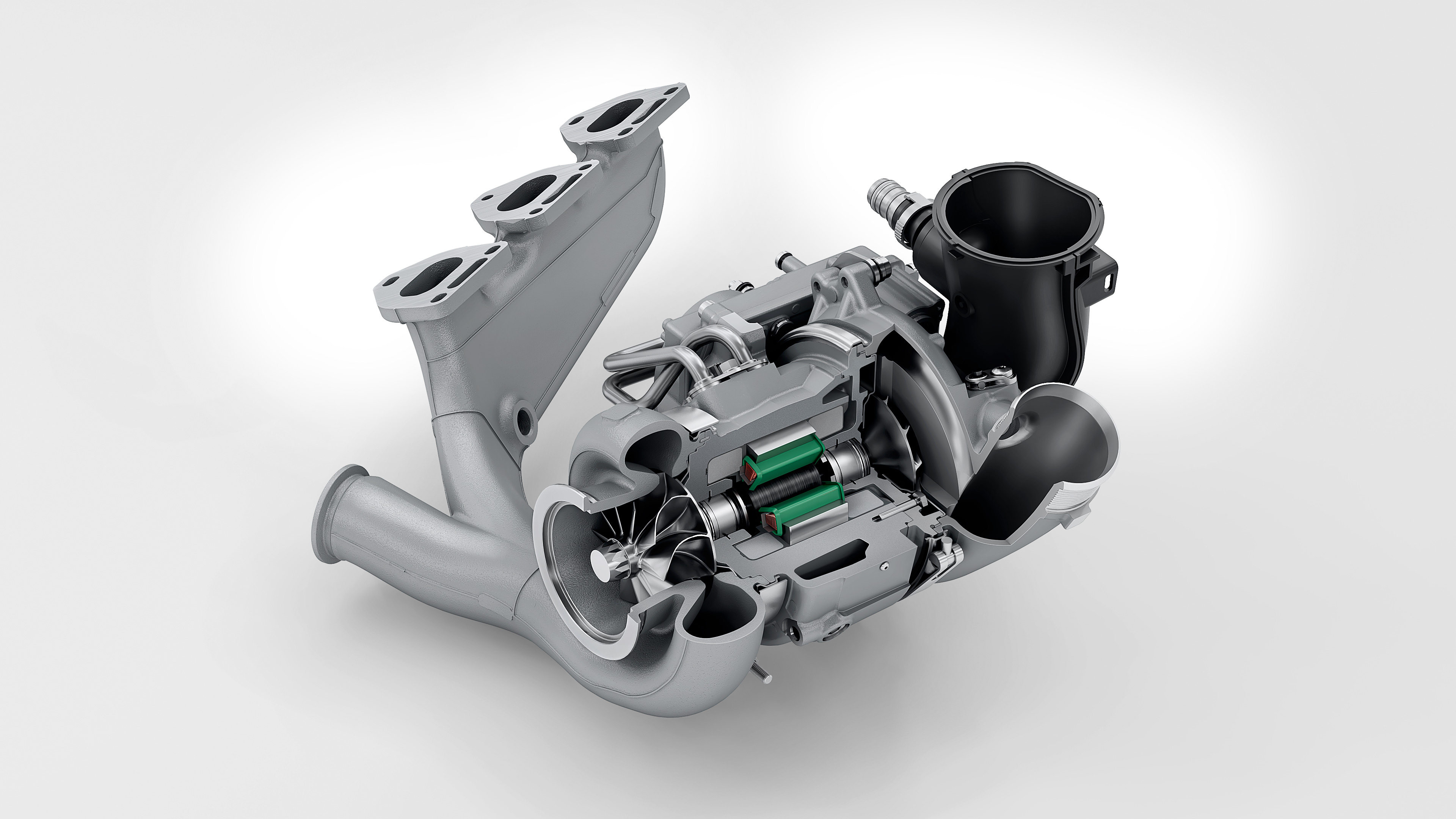 가볍고 강력한 T-하이브리드 시스템은 새롭게 개발된 일렉트릭 터보차저를 갖췄다. 컴프레서 휠과 터빈 휠 사이에 위치한 통합 전기 모터가 즉시 터보차저 속도를 끌어올려 즉각적인 부스트 압력을 생성한다. 터보차저의 전기 모터는 발전기 역할을 동시에 할 수 있으며, 배출가스의 흐름에서 발생하는 에너지를 이용해 최대 11kW (15PS)의 전력을 생성한다. 웨이스트게이트가 없는 일렉트릭 터보차저는 기존과 달리 하나의 터보차저만 사용해 보다 역동적이고 응답성이 뛰어난 동력 전달을 보장한다.